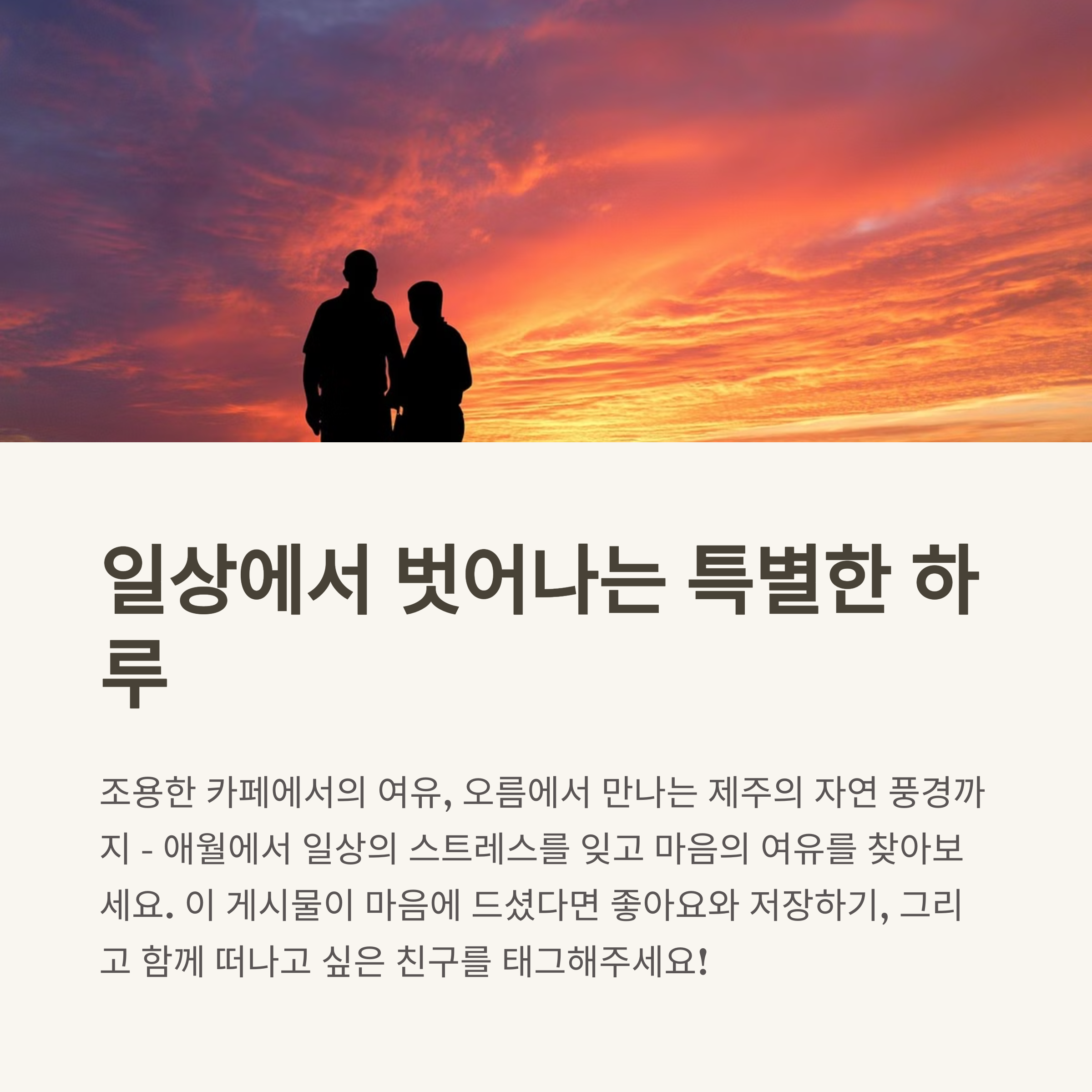 제주 애월에서 보내는 하루는 시간의 속도를 천천히 돌리는 듯한 여유로움을 선사합니다. 무인 카페에서 시작되는 아침, 오름의 신선한 바람을 느끼는 오후, 바다와 함께 걷는 저녁까지 모두가 조화롭게 어우러진 일정입니다. 이번 여행이 단순한 관광이 아닌, 마음의 쉼표를 찍는 시간이 되길 바랍니다. 꼭 애월에서만 가능한 이 특별한 하루, 여러분도 경험해보시길 추천드립니다.