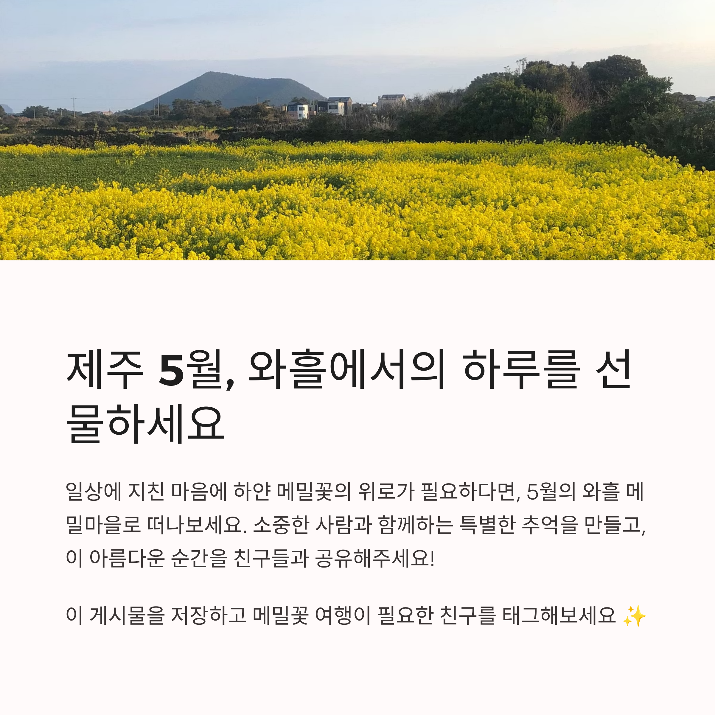 화사한 초여름, 하얗게 물든 제주의 메밀꽃밭은 보는 이의 마음을 정화시켜주는 특별한 풍경입니다. 조용한 자연 속에서 걷고, 쉬고, 사진을 남기며 일상에서 벗어난 여유를 만끽해보세요. 와흘 메밀마을은 제주스러운 자연미와 감성, 지역 축제가 조화를 이루는 곳으로 여러분의 5월 여행에 꼭 담아야 할 힐링 명소입니다.