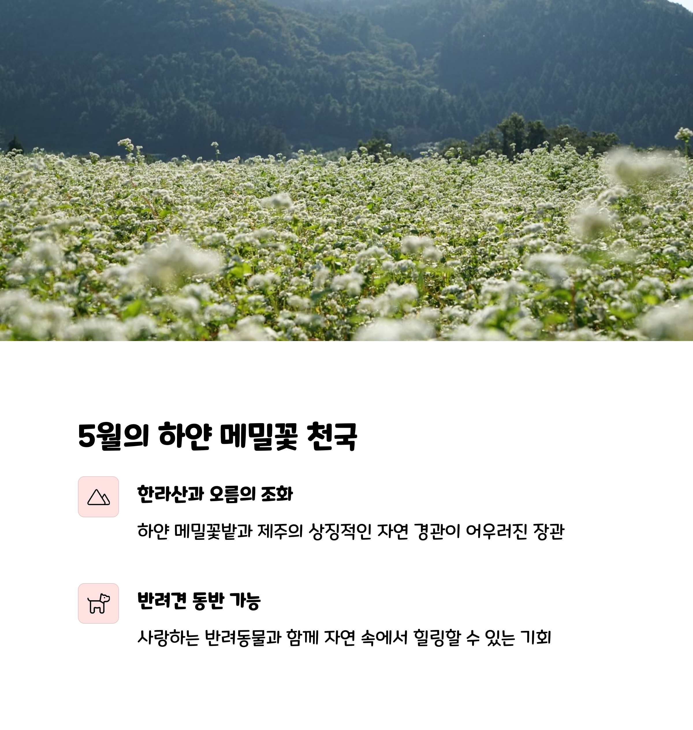 5월, 제주 와흘 메밀꽃축제는 단순한 꽃 구경을 넘어 체험, 포토존, 먹거리까지 풍성한 콘텐츠로 구성된 특별한 봄날의 행사입니다. 가족과 연인, 친구 누구와 함께하든 오롯이 자연을 느끼고 감성적인 추억을 남기기에 더없이 좋은 장소입니다. 특히 한라산과 꽃밭이 어우러진 풍경은 많은 이들에게 잊지 못할 감동을 선사합니다. 이번 봄, 제주 동쪽에서 특별한 하루를 계획하고 있다면 와흘 메밀꽃축제를 일정에 꼭 넣어보세요.
