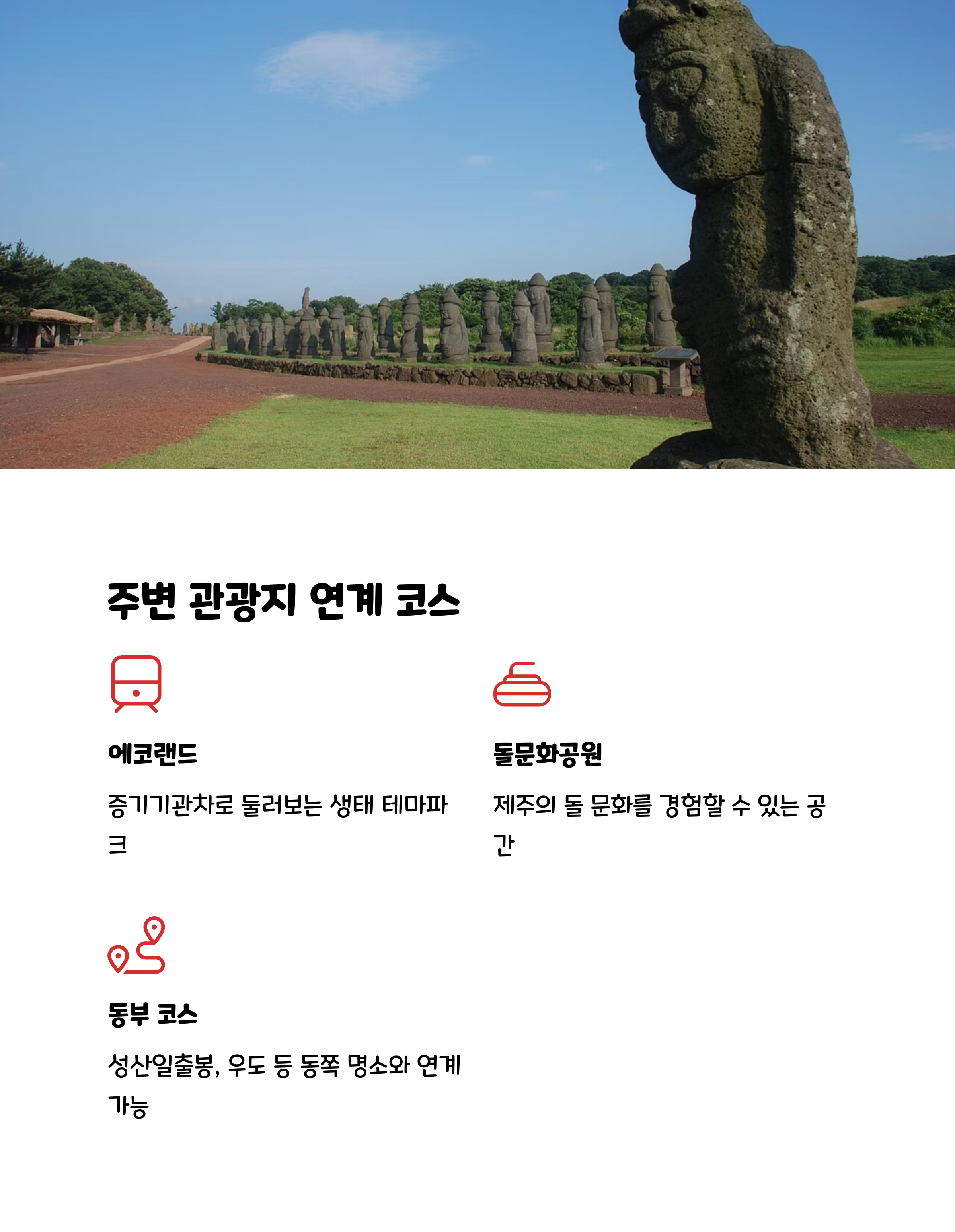 | 다양한 체험행사, 플리마켓, 먹거리 장터 운영 | 에코랜드, 돌문화공원과 연계한 여행 코스 | 주말 혼잡 시 외부 주차 후 도보 이동 추천 |