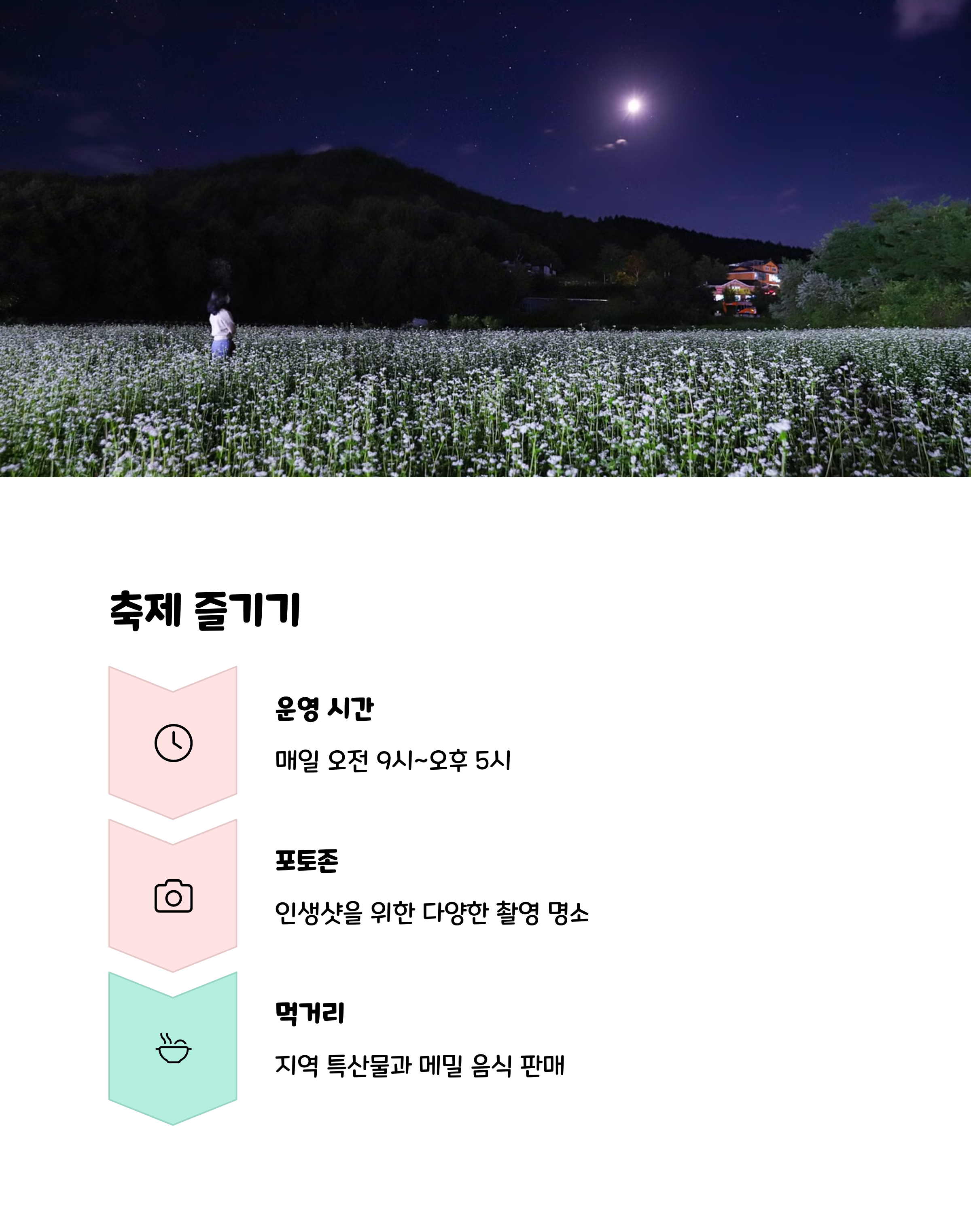 축제 기간 동안에는 메밀밭 전 구간이 개방되어 자유롭게 산책할 수 있으며, 곳곳에 설치된 포토존은 물론 메밀 베개 만들기, 플리마켓, 먹거리 장터 등의 체험 행사가 마련되어 있어 더욱 풍성한 시간을 보낼 수 있습니다. 특히 어린이들과 함께 방문하는 가족 단위 관광객들에게 인기가 높으며, 날씨 좋은 날엔 피크닉 매트 하나로도 충분히 하루를 즐길 수 있는 구성입니다.