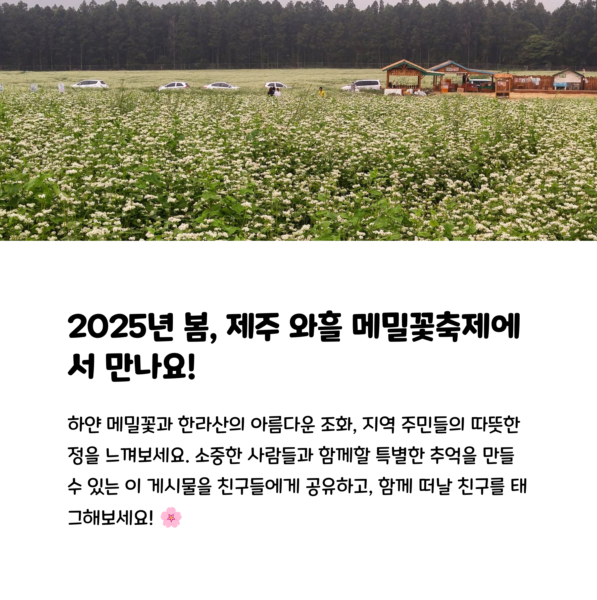 | 와흘에서 열리는 5월 중순 하얀 꽃밭 축제 | 메밀꽃 배경의 감성 여행지로 인기 | 내비에 '와흘메밀마을협의회' 입력, 주차장 완비 |