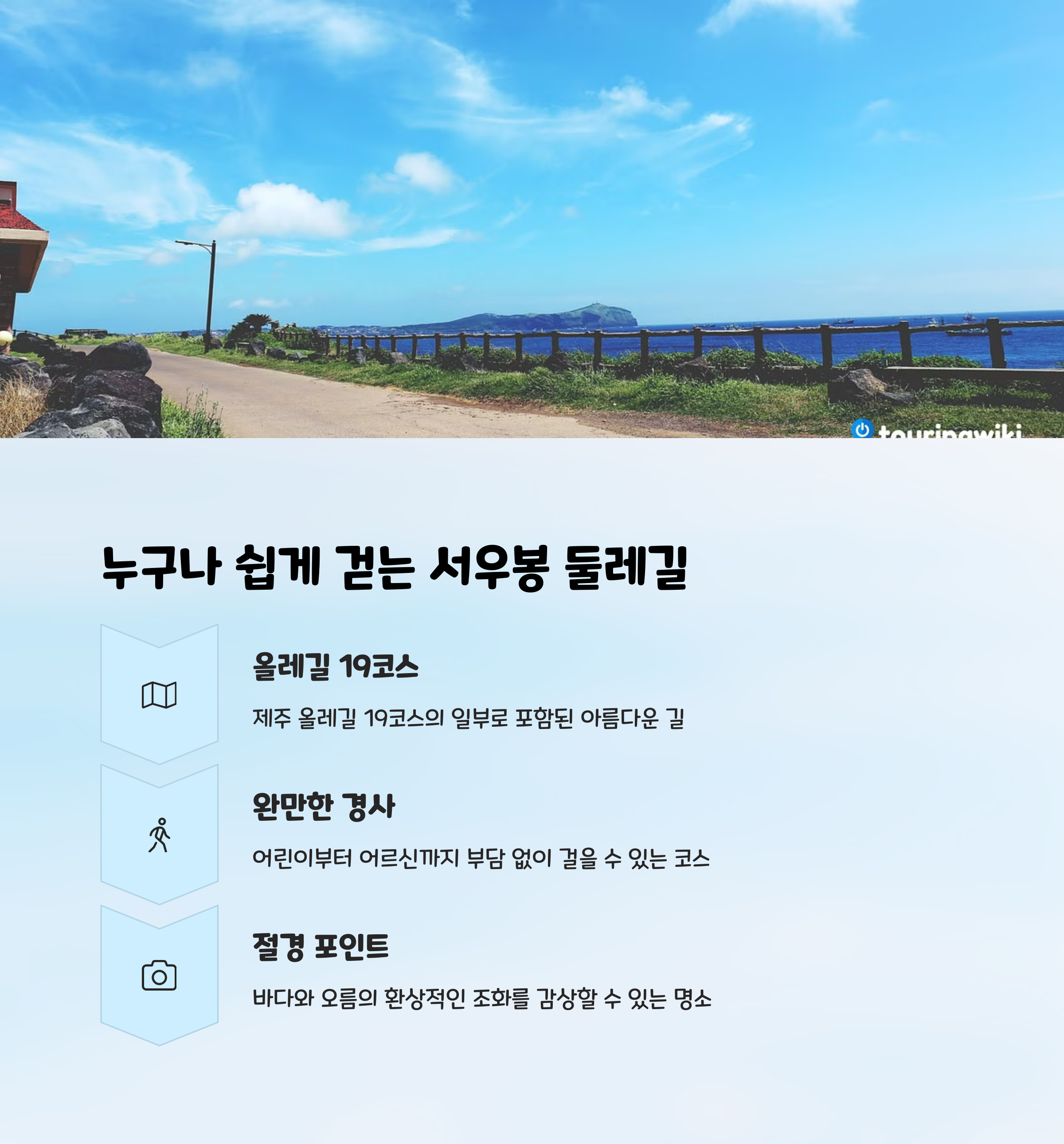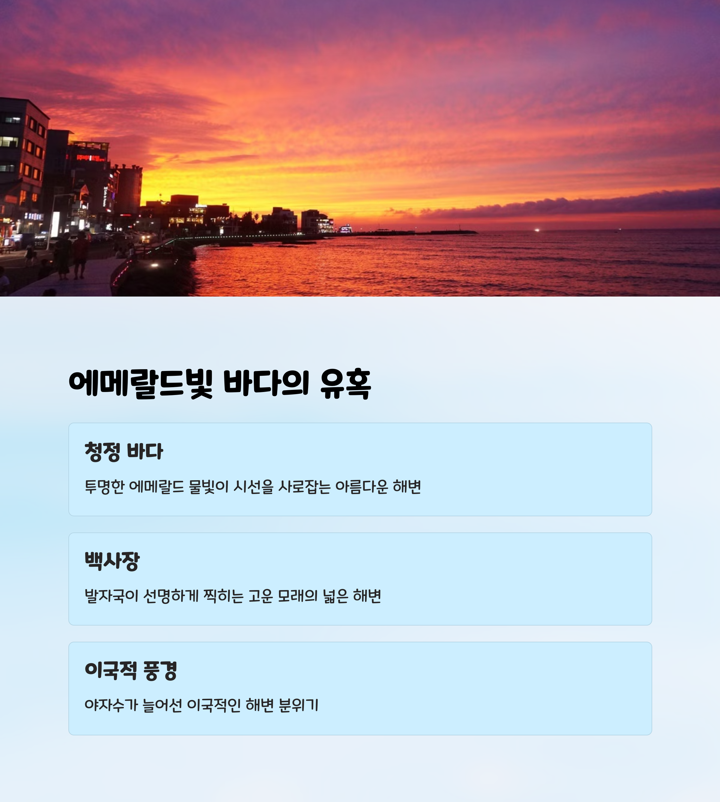 | 맑은 바다와 하얀 모래가 어우러진 인기 해변 | 완만한 경사와 편안한 산책로가 특징 | 제주의 자연을 느낄 수 있는 여유로운 트레킹 코스 |