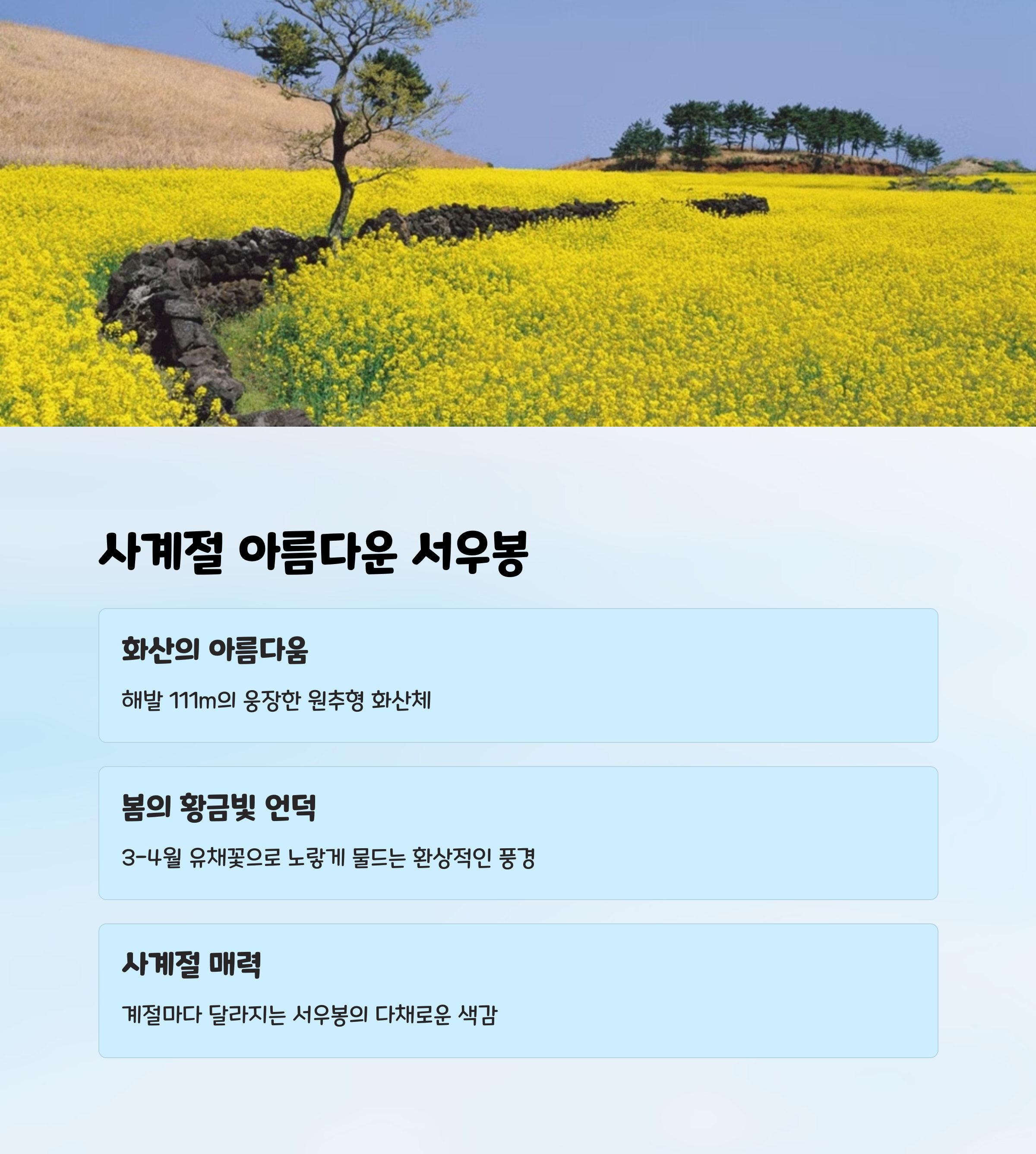 제주 함덕 해수욕장은 투명하고 맑은 에메랄드빛 바다로 많은 여행객들의 사랑을 받고 있습니다. 해변 바로 옆에는 서우봉이라는 낮은 오름이 있어 한적하게 산책을 즐기기 좋은 환경을 제공합니다. 특히 봄철이면 서우봉 일대에는 노란 유채꽃이 만발해 풍경이 그림처럼 펼쳐집니다. 이곳은 사진 찍기 좋은 명소로도 유명하며, 바다와 꽃, 오름이 어우러진 자연의 조화를 느낄 수 있어 도심에서 벗어나 여유를 찾는 이들에게 큰 힐링을 선사합니다.