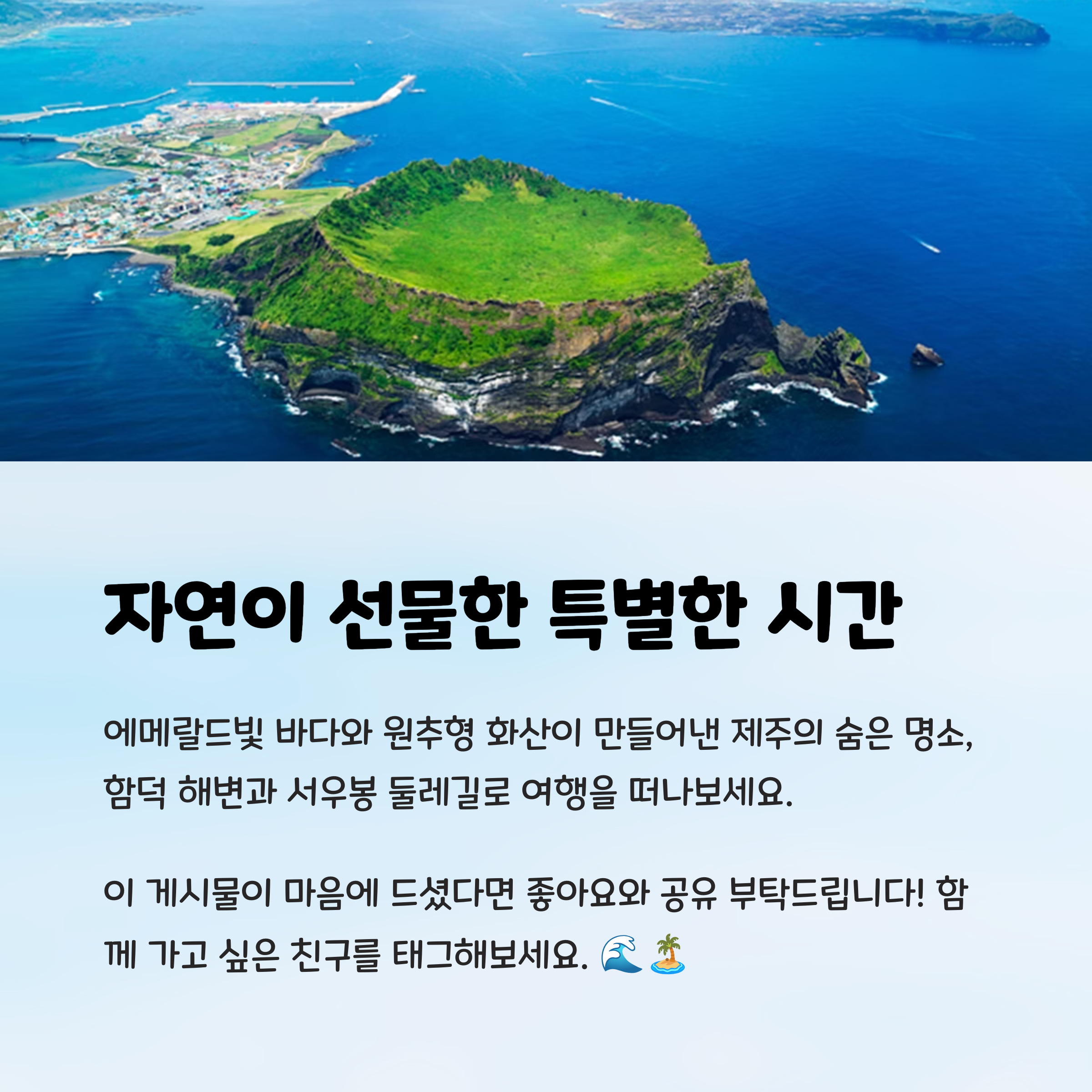 제주 함덕과 서우봉은 단순한 관광지가 아닌 몸과 마음을 치유할 수 있는 자연 속 쉼터입니다. 걷기만 해도 힐링이 되는 이 코스는 제주의 진짜 매력을 경험할 수 있는 숨겨진 보물과 같은 곳입니다. 짧은 시간이라도 여유롭게 이 길을 걸으며 바쁜 일상 속에 잠시 멈춤을 가져보세요. 여행의 진정한 의미를 다시금 느낄 수 있을 것입니다.