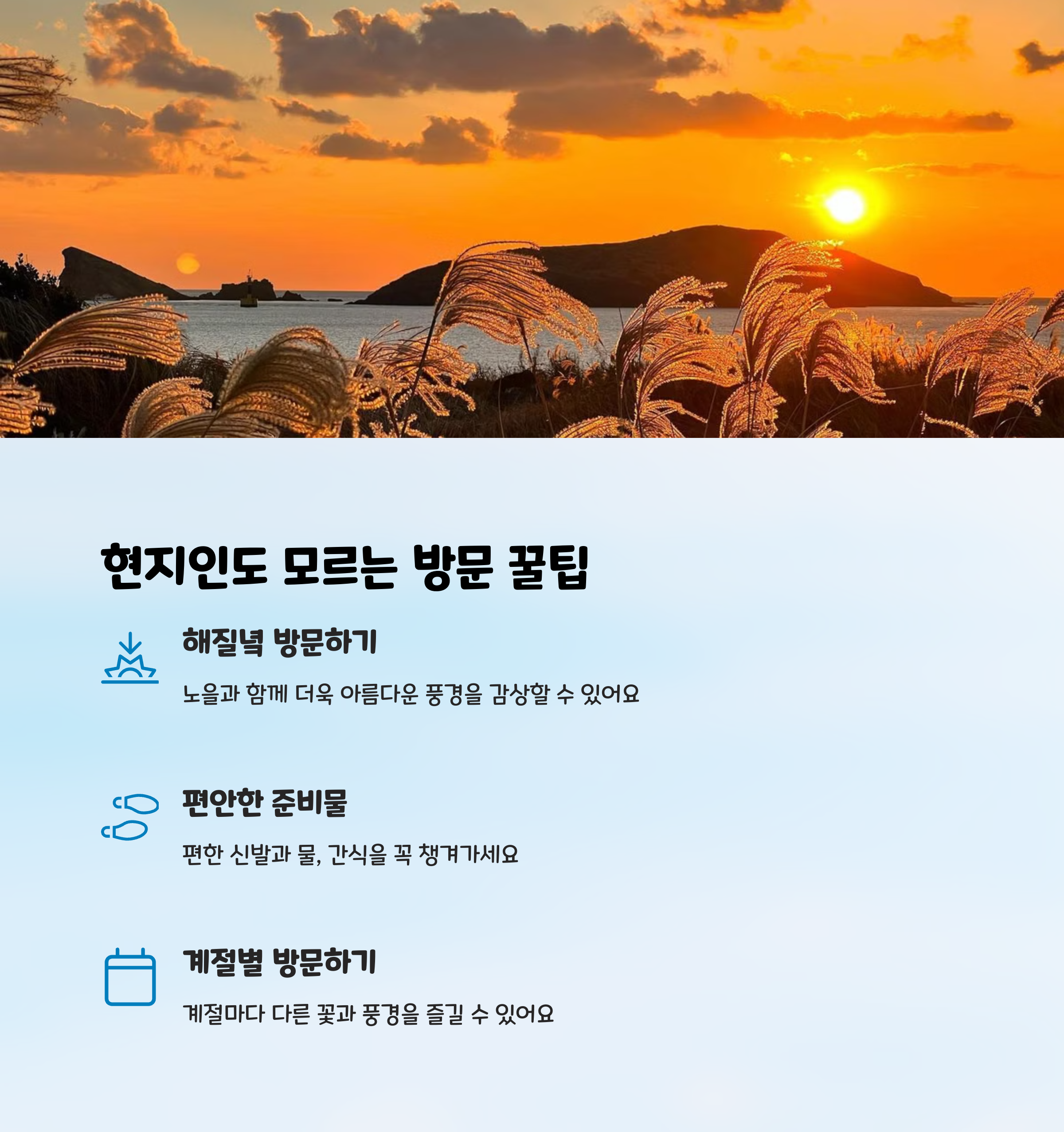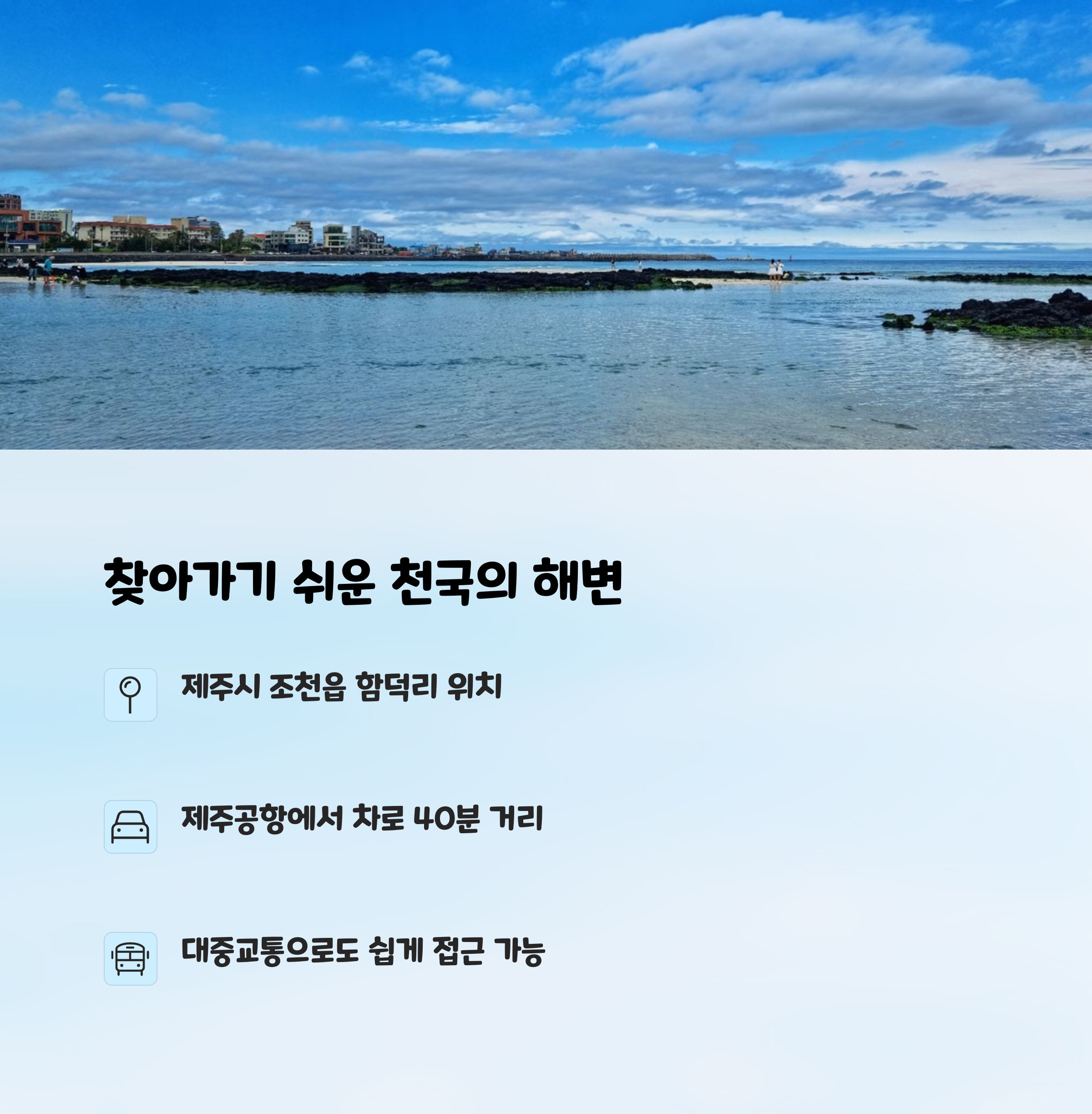 맑은 바다와 하얀 모래가 어우러진 인기 해변 완만한 경사와 편안한 산책로가 특징 제주의 자연을 느낄 수 있는 여유로운 트레킹 코스