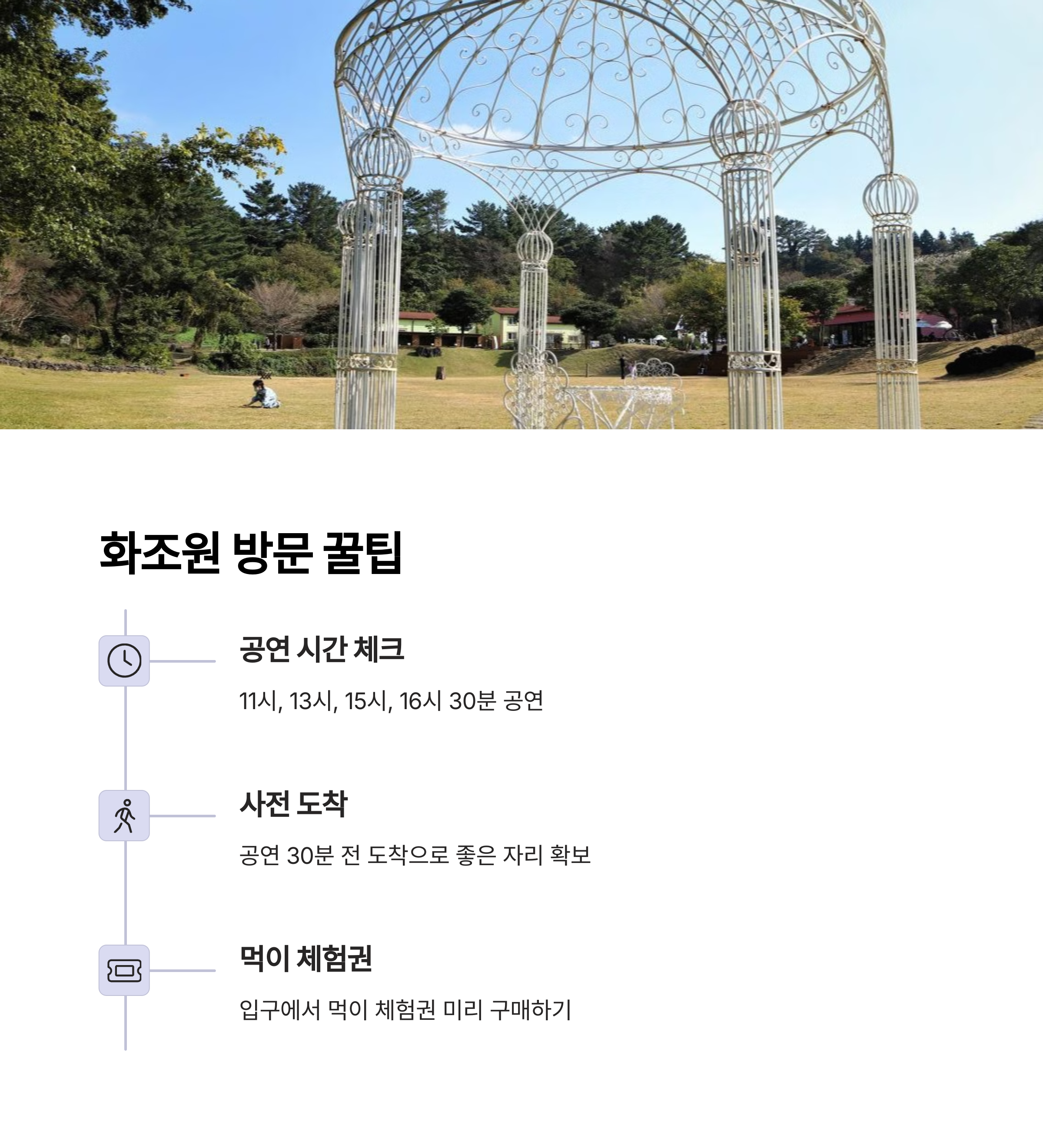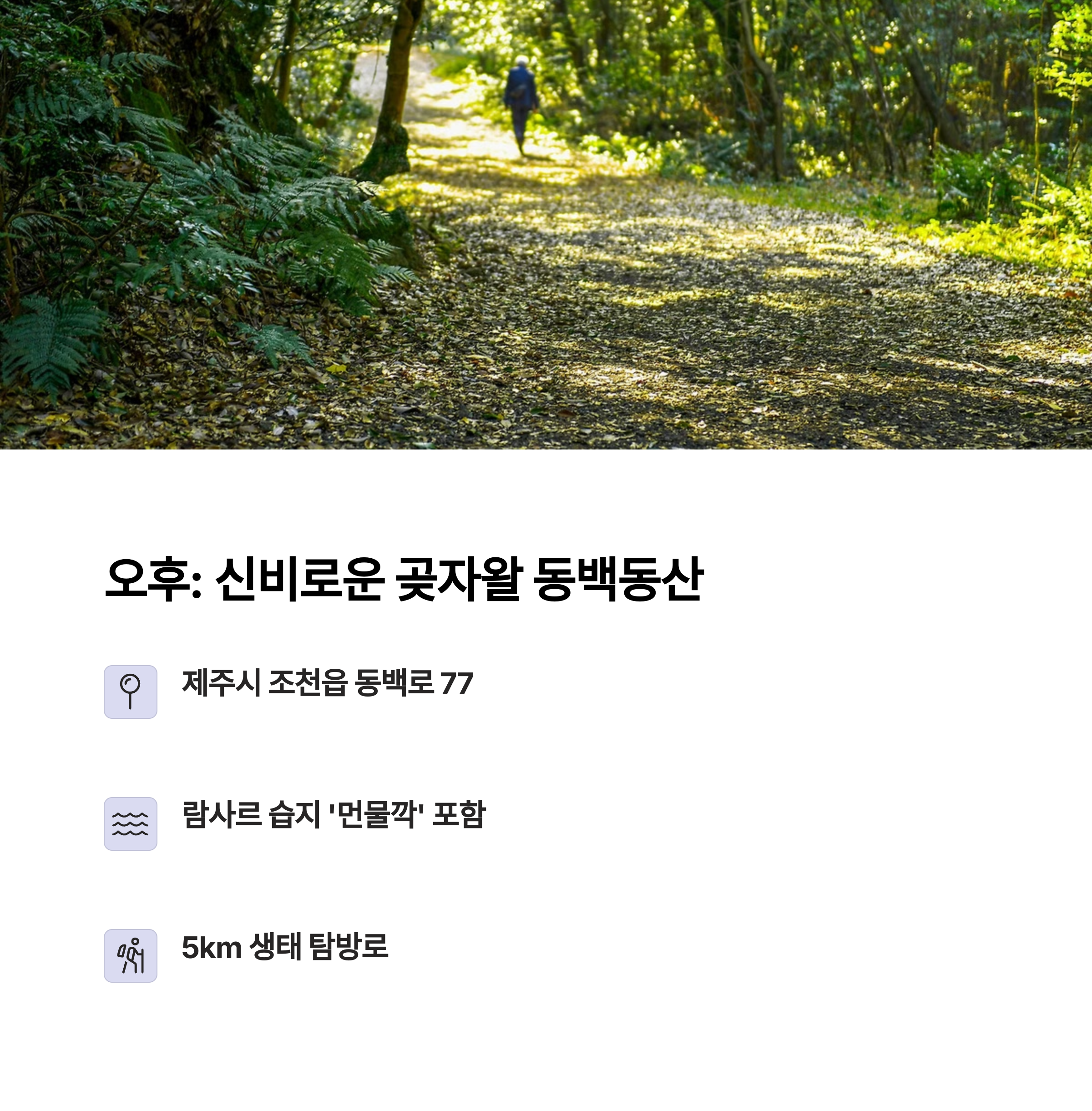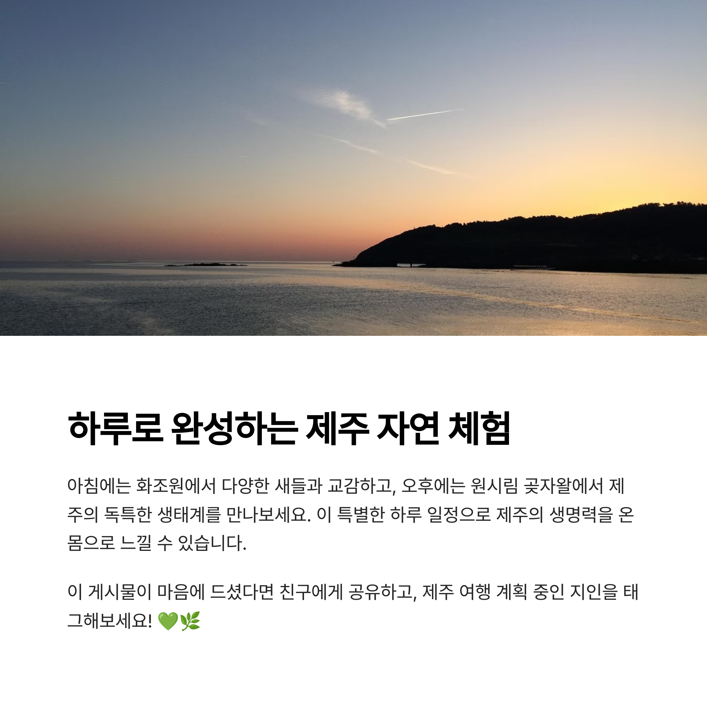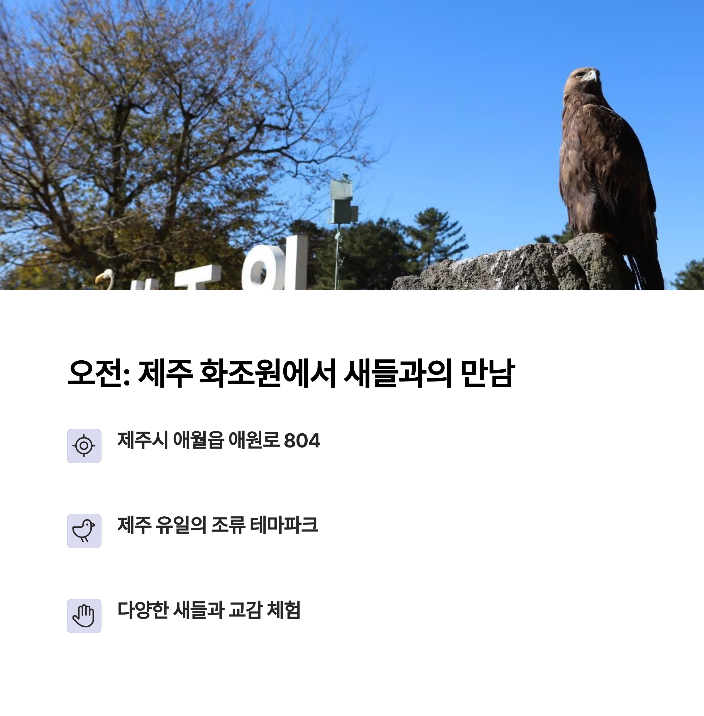 오전과 오후로 나누어진 이번 일정은 제주가 가진 자연의 다채로움을 경험할 수 있는 구성으로 설계되어 있습니다. 화조원에서는 동물과 교감하며 생명의 소중함을 배우고, 곶자왈 숲길에서는 생태계의 신비를 체험할 수 있죠. 조용한 힐링과 풍부한 볼거리를 함께 즐기며 단 하루의 여행으로도 깊은 인상을 남길 수 있습니다.