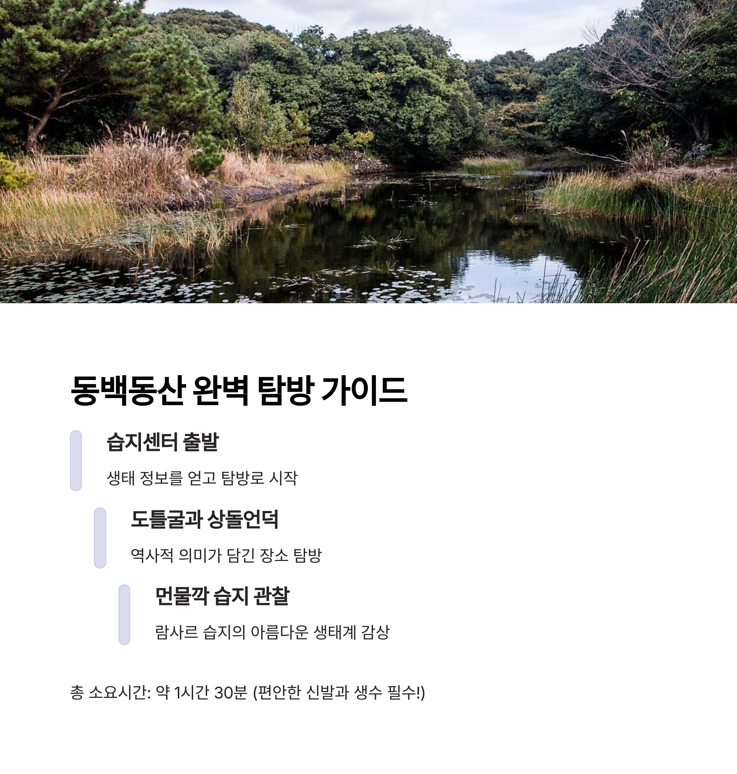 오후에는 곶자왈 동백동산을 따라 숲길을 걷는 일정을 추천드립니다. 이곳은 제주의 독특한 생태계가 살아 숨 쉬는 곶자왈 지대로, 특히 먼물깍 습지는 람사르 습지로 등록되어 보호되고 있습니다. 숲길은 도틀굴과 상돌언덕, 습지를 거쳐 다시 센터로 돌아오는 코스로 약 1시간 30분 정도 소요됩니다. 다양한 식물과 동물의 흔적을 관찰하며 걷는 길은 생태학적 가치뿐만 아니라 심리적인 안정감도 선사합니다.