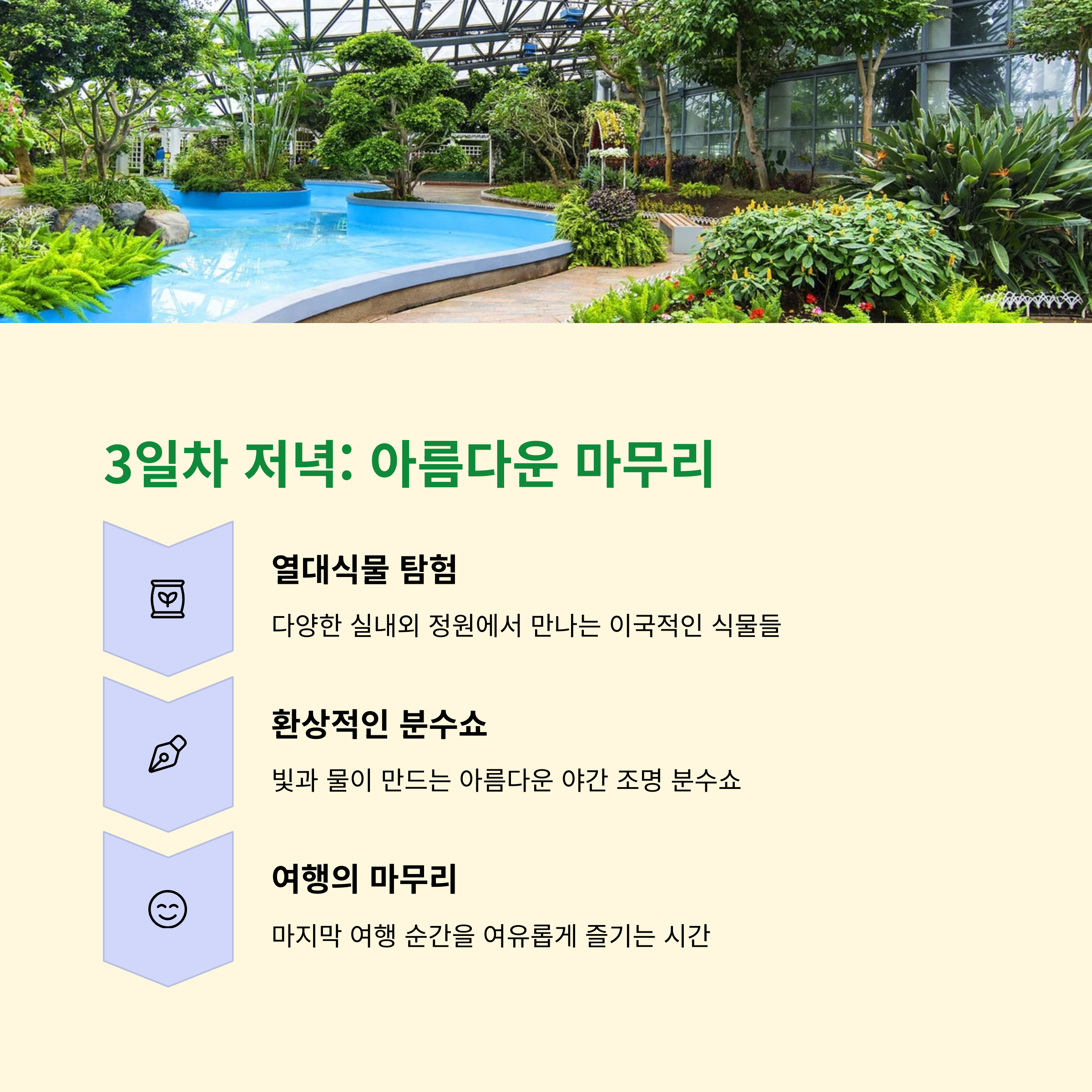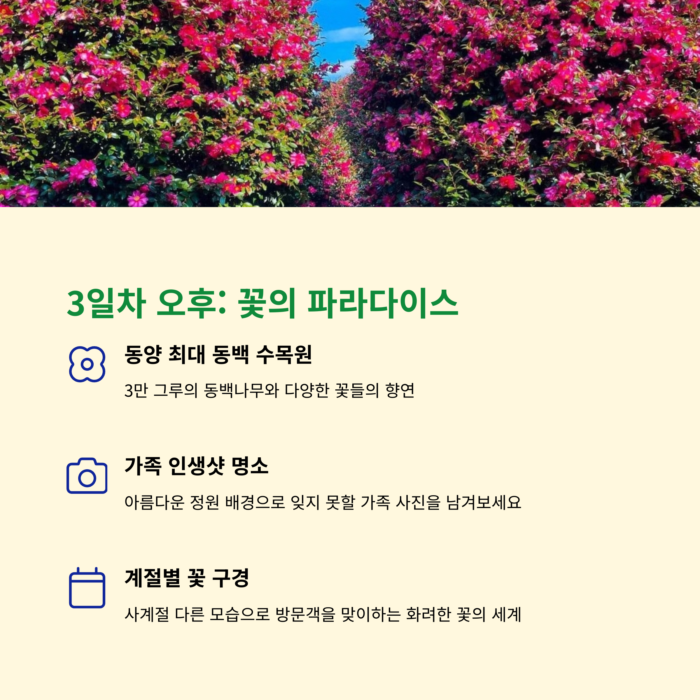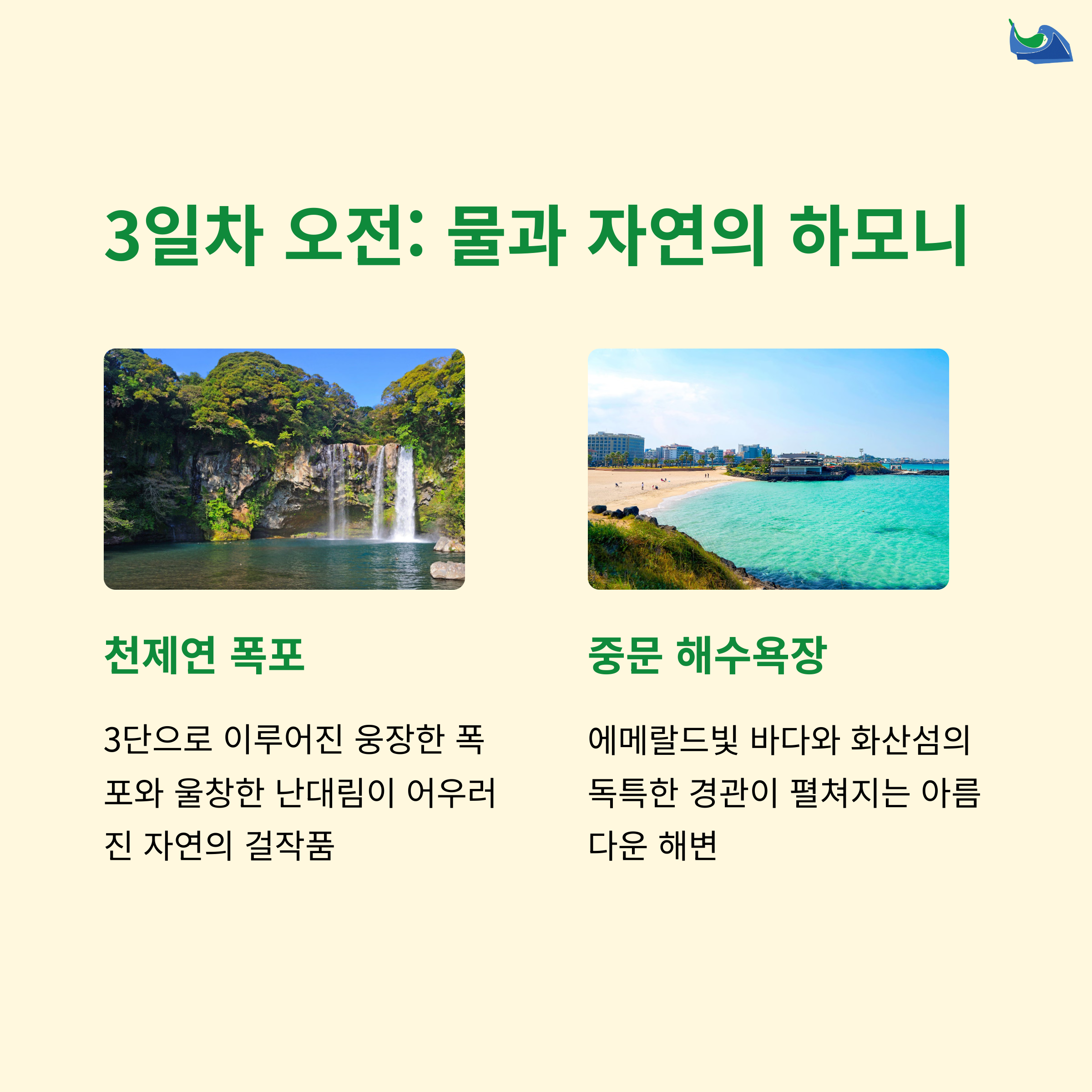 마지막 셋째 날에는 제주 남부 지역을 둘러보며 일정을 마무리합니다. 천제연 폭포에서 시원한 폭포수와 푸른 숲을 배경으로 산책을 즐긴 후, 중문 해수욕장으로 이동해 아이들과 모래놀이를 하며 한적한 시간을 보내보세요. 오후에는 카멜리아 힐에서 계절 꽃들과 함께 사진을 찍고, 여미지 식물원에서 조용히 휴식을 취한 뒤 공항으로 이동하면 알찬 2박 3일 제주 가족 여행이 마무리됩니다.