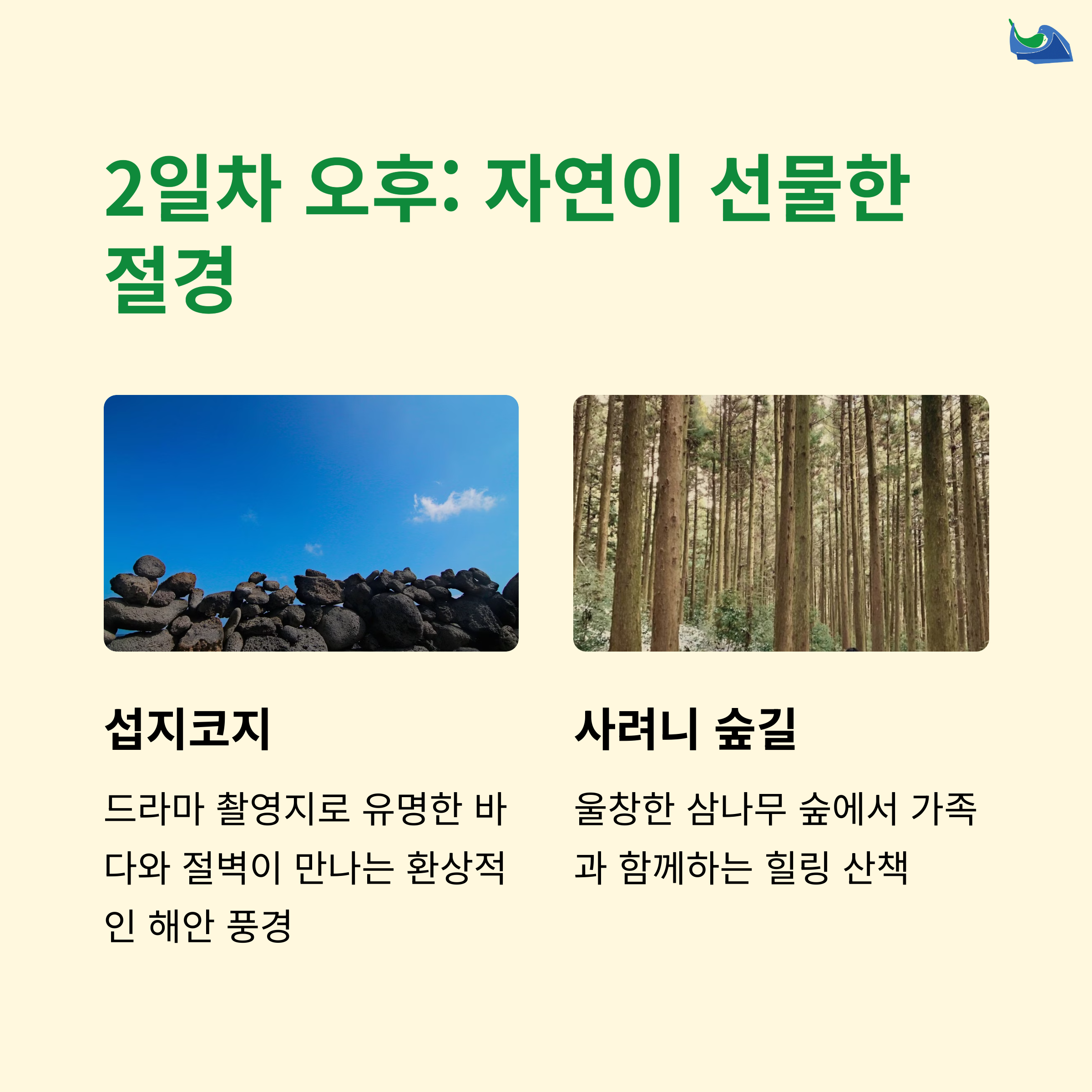 | 전통 문화 체험 & 민속촌 방문 | 아이들과 함께 즐기기 좋은 루트 | 자연과 감성 모두 챙긴 일정 |