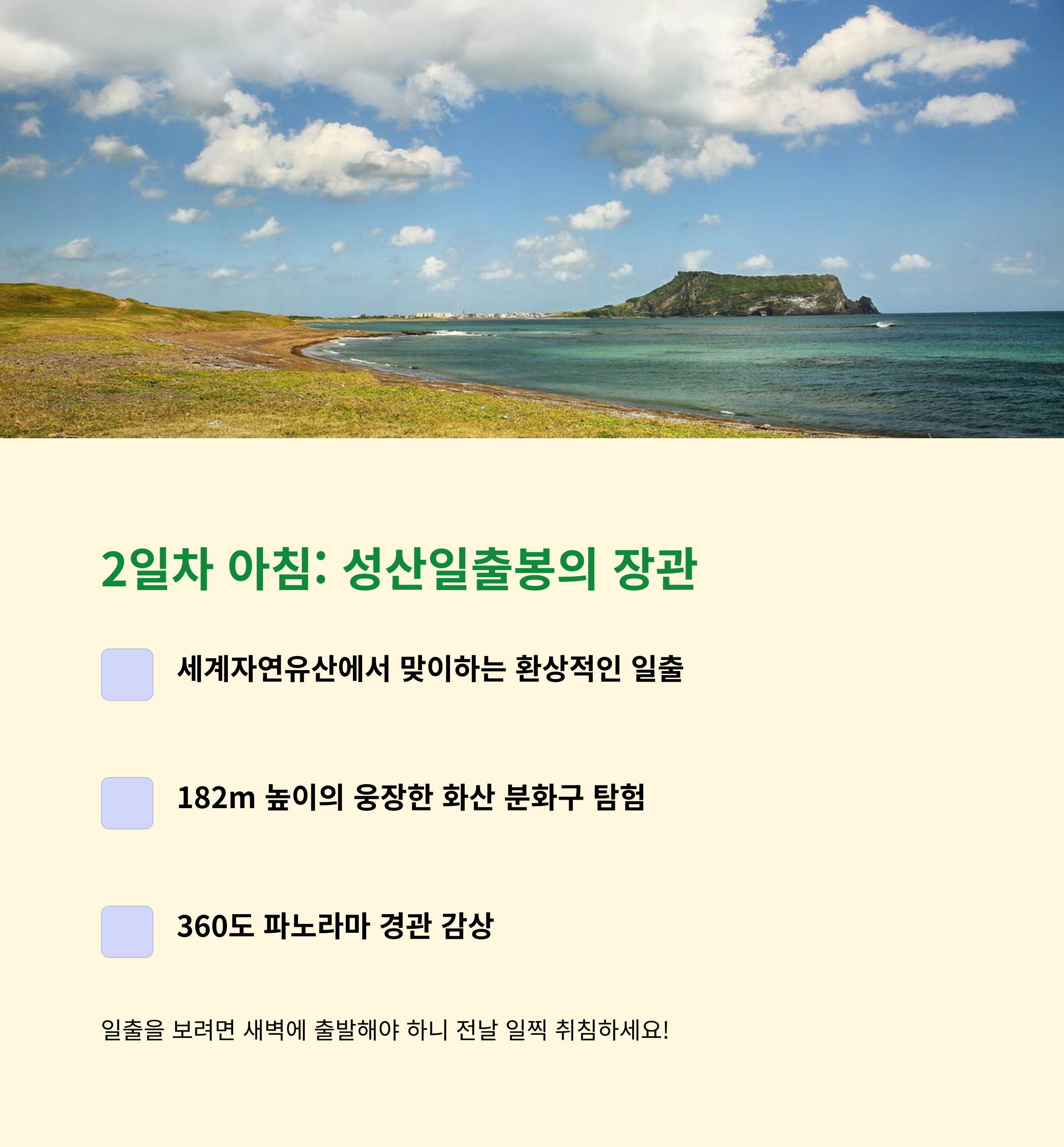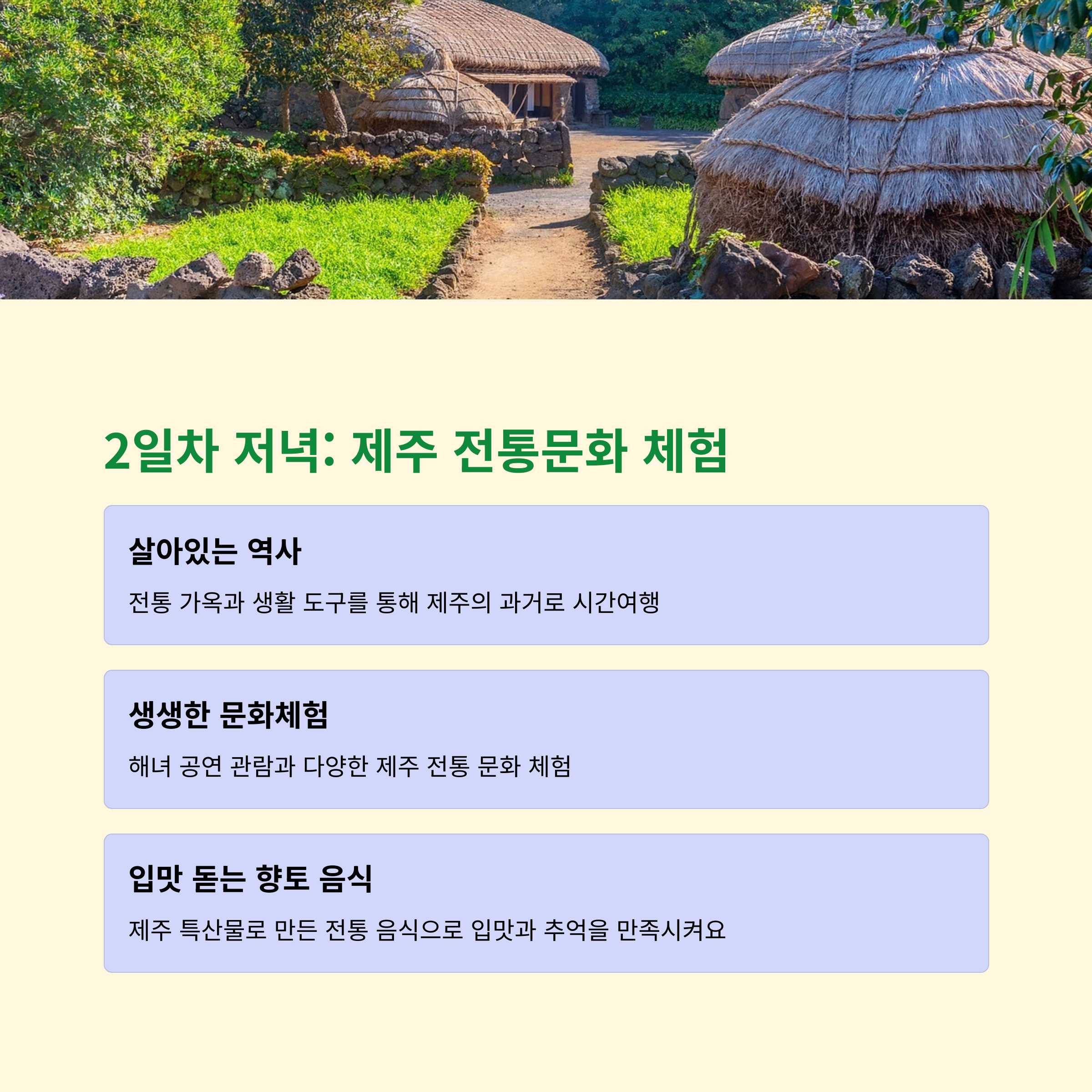 둘째 날에는 제주 동부 지역을 중심으로 탐방합니다. 성산일출봉에서 새벽 일출을 감상하고, 주변에서 간단히 아침 식사를 즐긴 뒤 섭지코지와 사려니 오름을 방문해 바다와 오름의 조화를 느껴보세요. 오후에는 제주 민속촌을 찾아 전통 가옥과 마을 체험을 하고, 아이들과 함께 제주 전통 음식을 맛보는 특별한 시간을 가질 수 있습니다. 둘째 날은 자연과 문화를 모두 경험할 수 있는 풍성한 탐방 코스로 구성해보세요.