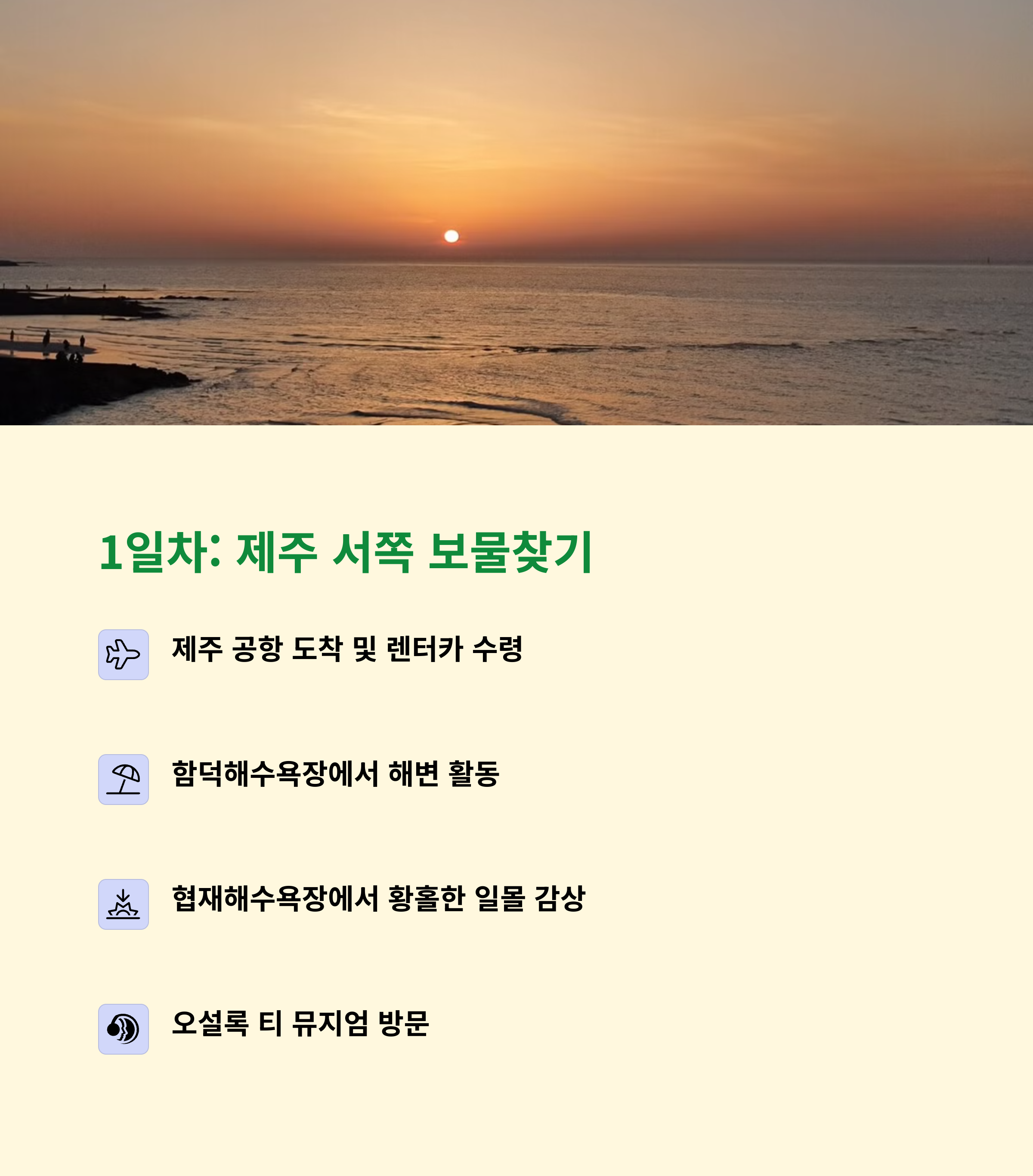 | 함덕, 협재, 오설록 티 뮤지엄 | 서쪽-동쪽-남쪽 순으로 이동 | 오름, 폭포, 식물원, 해변 포함 |