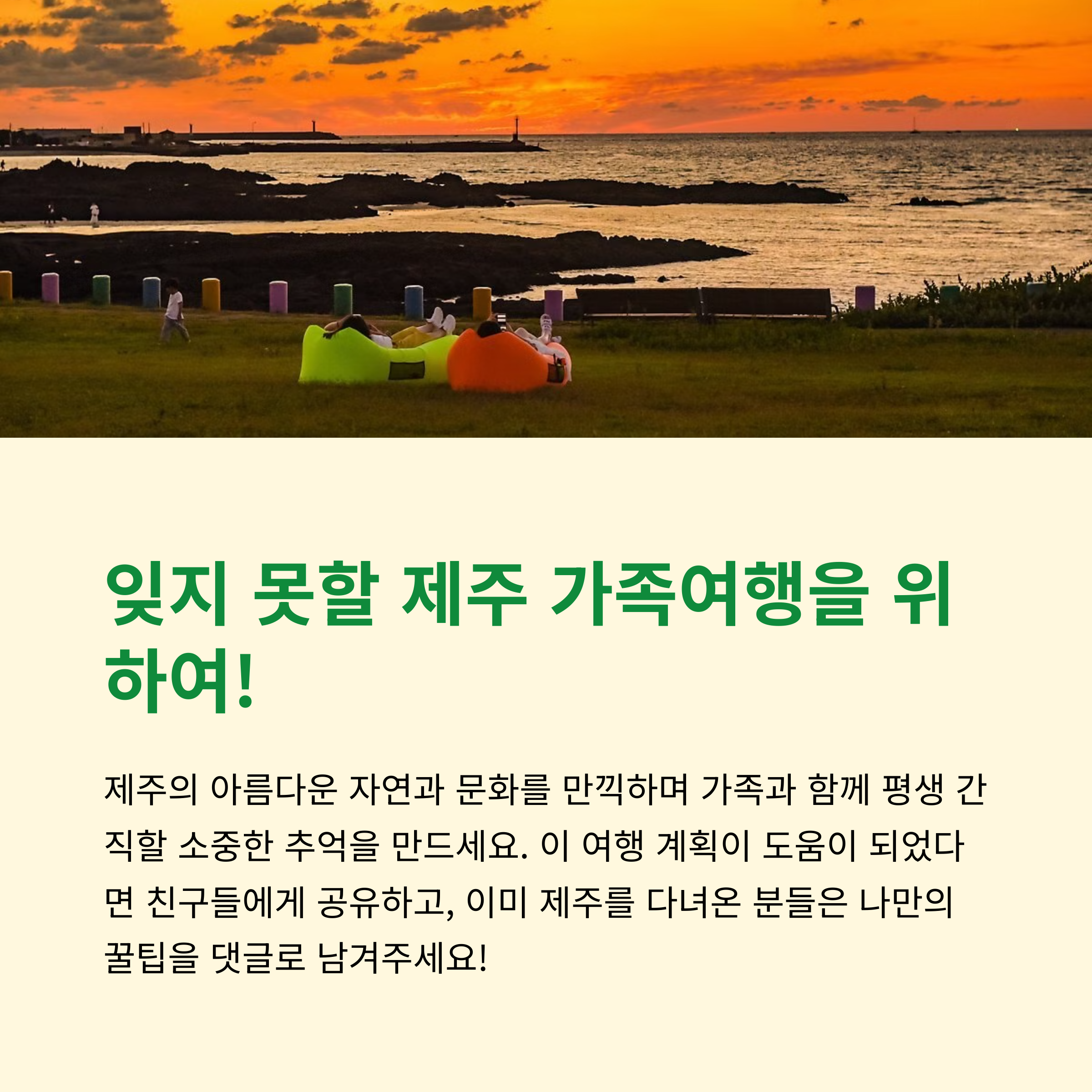 제주도는 아이부터 어른까지 모두가 즐길 수 있는 가족 여행지로 꾸준히 사랑받고 있습니다. 바다, 오름, 숲길, 박물관, 테마파크까지 모두 갖춘 제주에서 2박 3일 일정만으로도 꽉 찬 여행을 즐길 수 있습니다. 오늘 소개할 플래너는 서쪽-동쪽-남쪽으로 나누어 이동 동선은 효율적으로, 체험은 알차게 구성한 가족 맞춤 여행 루트입니다. 렌터카를 이용해 여유롭게 둘러보며, 자연을 체험하고, 전통문화를 느끼며, 함께 추억을 쌓을 수 있는 일정으로 추천드려요. 지금부터 소개하는 플랜을 참고해 아이들과 부모님 모두가 만족할 제주 가족 여행을 계획해보세요!