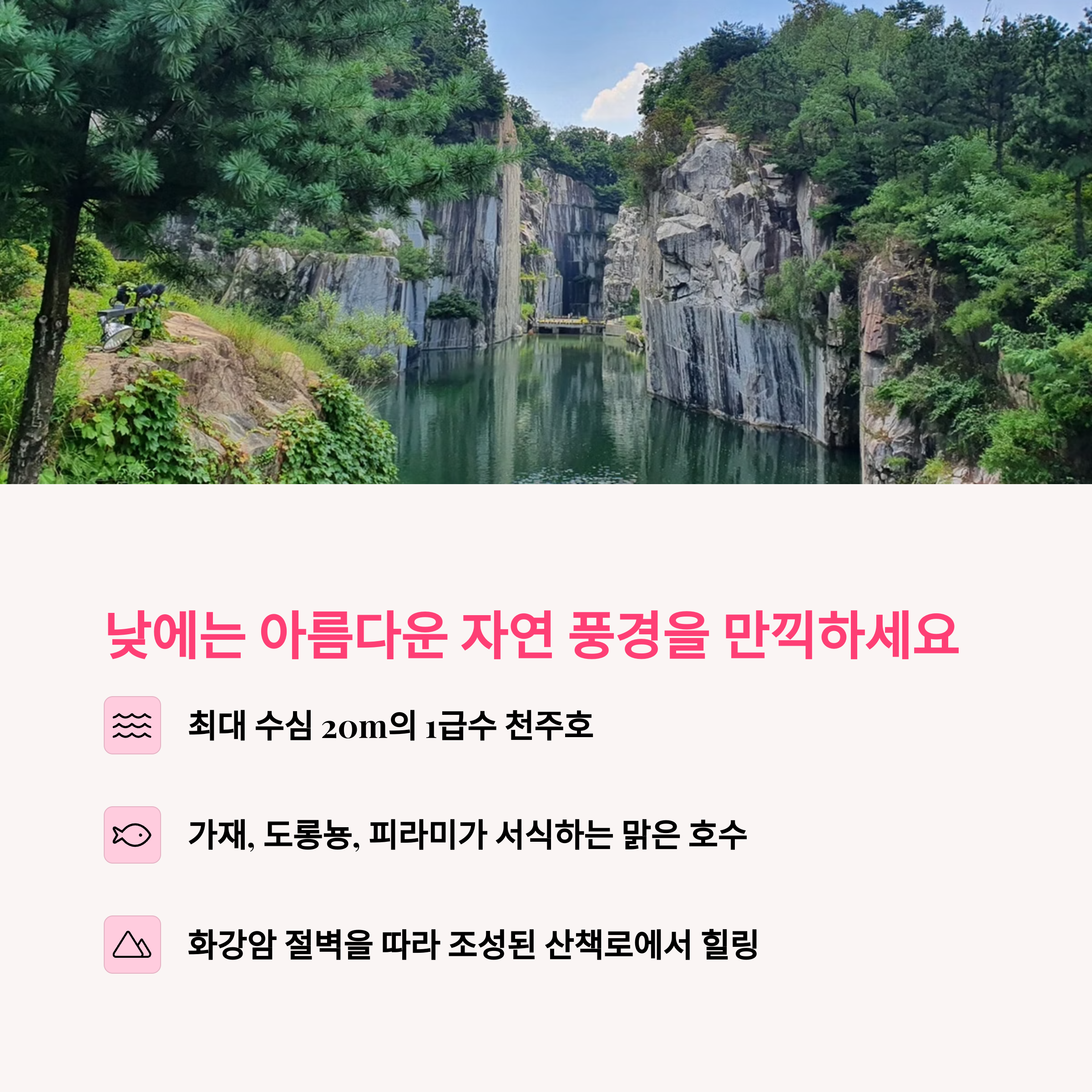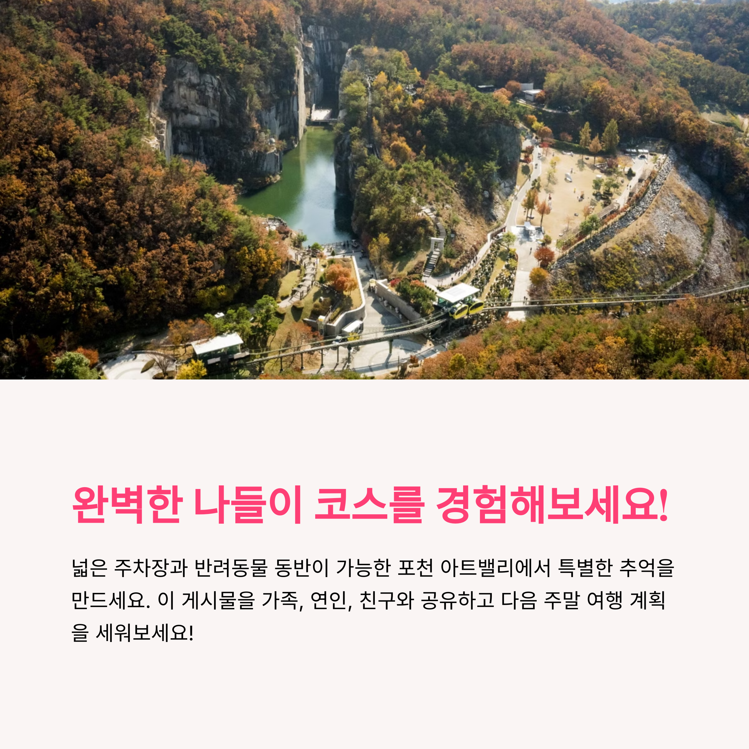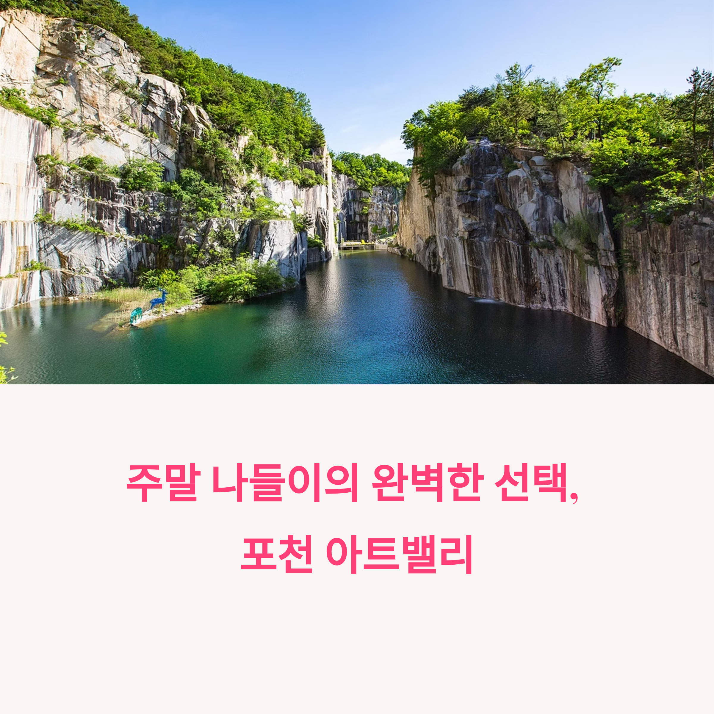 포천 아트밸리는 폐석산을 문화예술 공간으로 재탄생시킨 복합 문화공간으로 천주호, 조각공원, 천문과학관, 미디어파사드 공연 등 낮부터 밤까지 즐길 거리가 풍성한 나들이 명소입니다. 천주호를 중심으로 펼쳐진 산책길은 절벽과 호수의 자연미가 어우러져 가족과 연인 모두에게 만족도 높은 휴식 코스로 평가받고 있습니다.