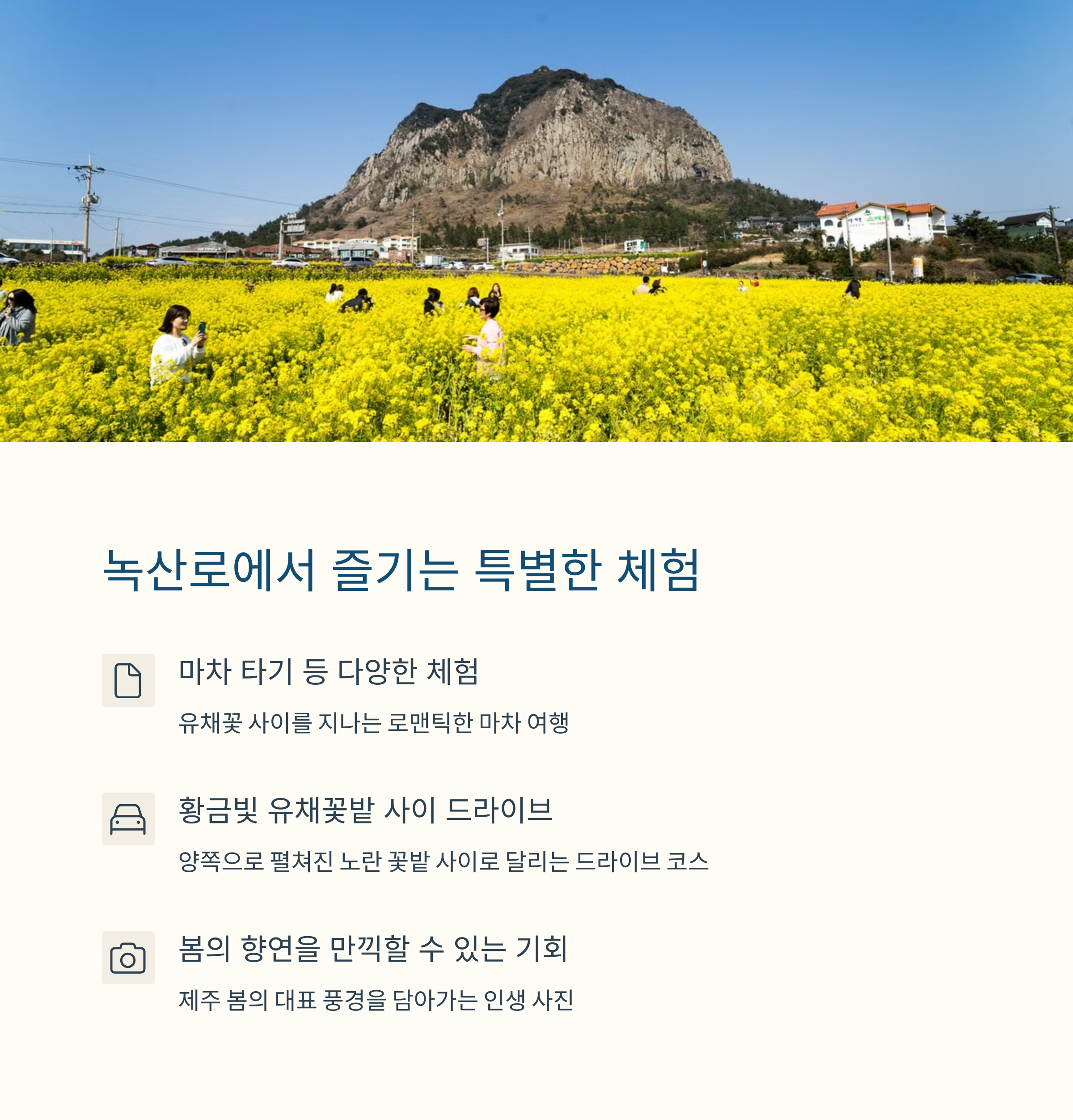 따뜻한 바람이 불어오는 3월 말, 제주도의 유채꽃은 황금빛으로 물들며 전국에서 수많은 여행객을 불러 모읍니다. 이번 글에서는 가장 아름답게 유채꽃이 피는 도로 3곳을 소개해 드리려 합니다. 벚꽃과 유채꽃이 함께 어우러진 녹산로, 해안 산책로가 매력적인 서우봉, 그리고 오션뷰와 꽃밭이 어우러진 웨이뷰 축제까지. 이번 봄, 사랑하는 사람들과 함께 카메라에 담아야 할 제주 유채꽃 명소는 과연 어디일까요? 감성 가득한 풍경, 봄을 느끼기에 충분한 제주 유채꽃 도로 세 곳을 지금 바로 만나보세요.
