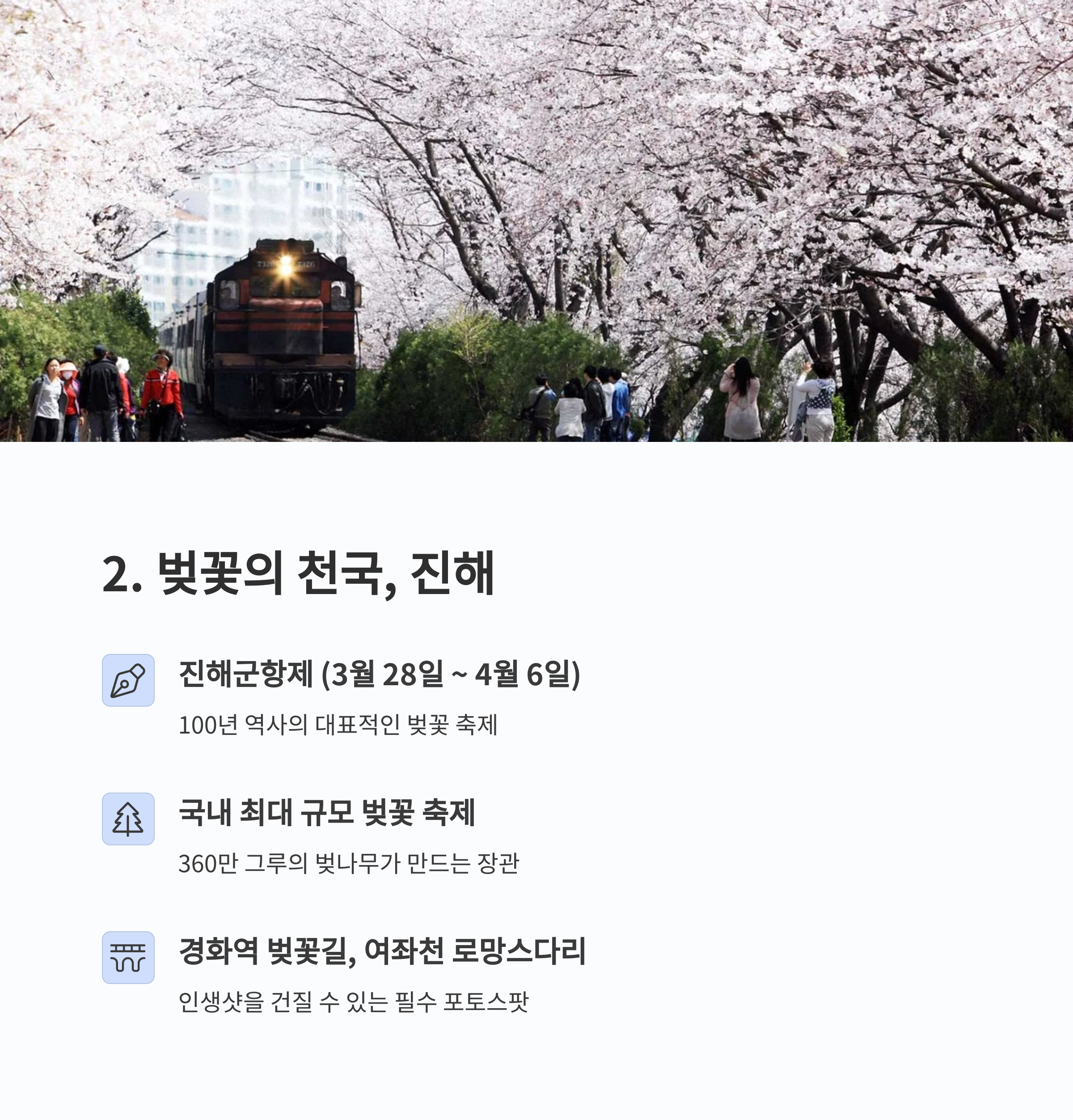 | 휴애리 매화축제, 봄 드라이브 추천 | 여좌천, 경화역 등 대표 벚꽃 명소 | 접근성 좋은 힐링 산책 코스 |