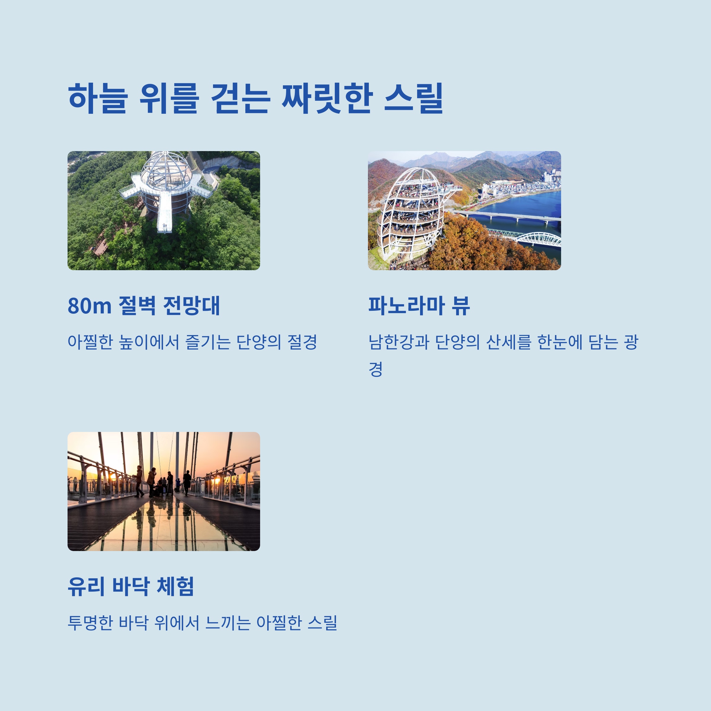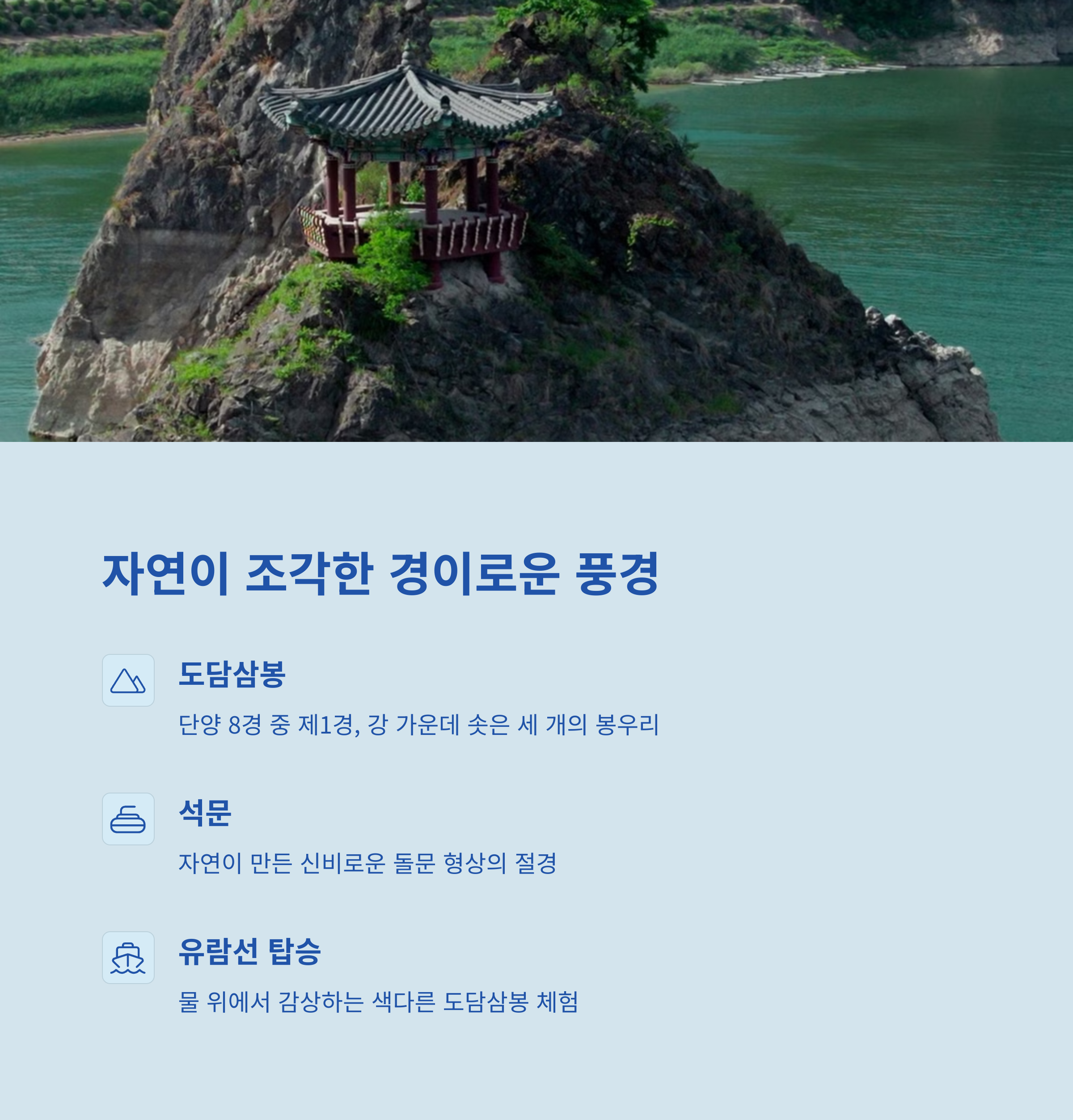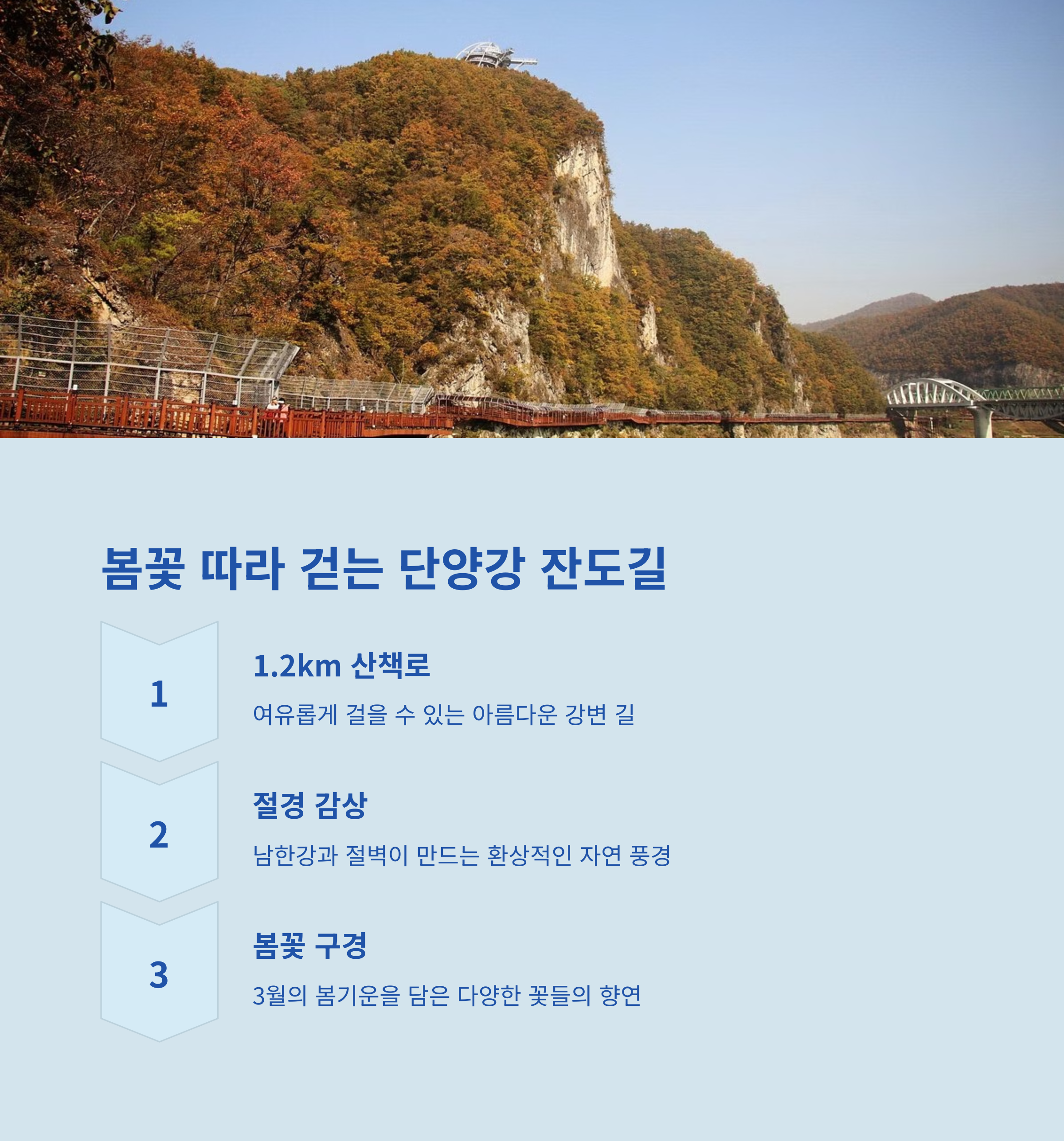 도담삼봉, 잔도길, 온달동굴 등 다양한 자연 경관 시장 → 산책 → 경관 감상 → 체험 중심 구성 자연과 체험을 동시에 즐기는 힐링 코스