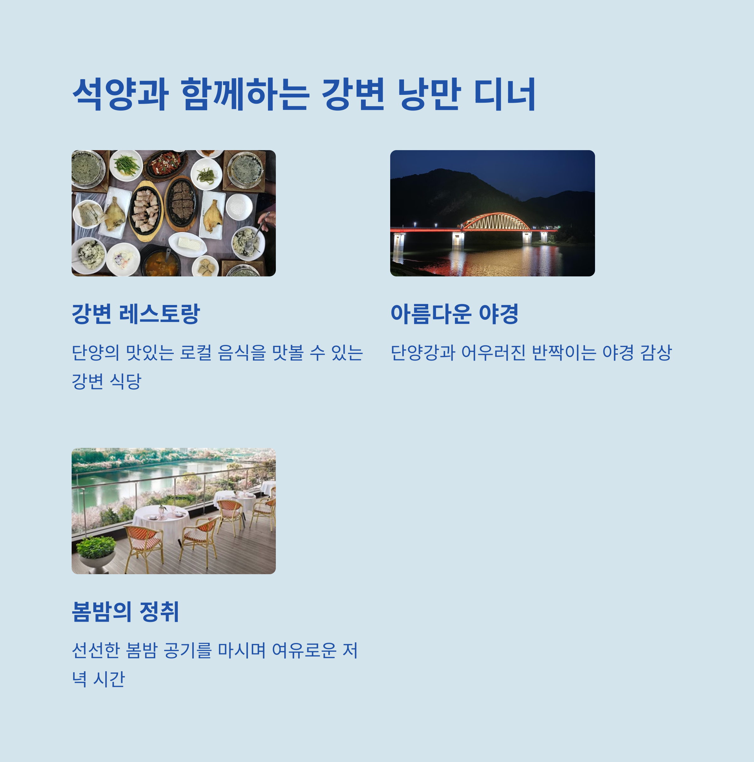 단양 여행은 단순히 경치를 감상하는 것을 넘어 지역 문화와 전통을 체험하는 기회로도 손색이 없습니다. 전통시장에서는 사람 냄새나는 풍경을, 강변 산책길에서는 여유를, 스카이워크와 동굴에서는 짜릿함과 신비로움을 각각 느낄 수 있습니다. 이렇게 자연과 체험, 힐링과 모험이 어우러진 단양 1박 2일 여행은 봄 시즌에 맞춰 꼭 한 번 떠나보시기를 권해드립니다.