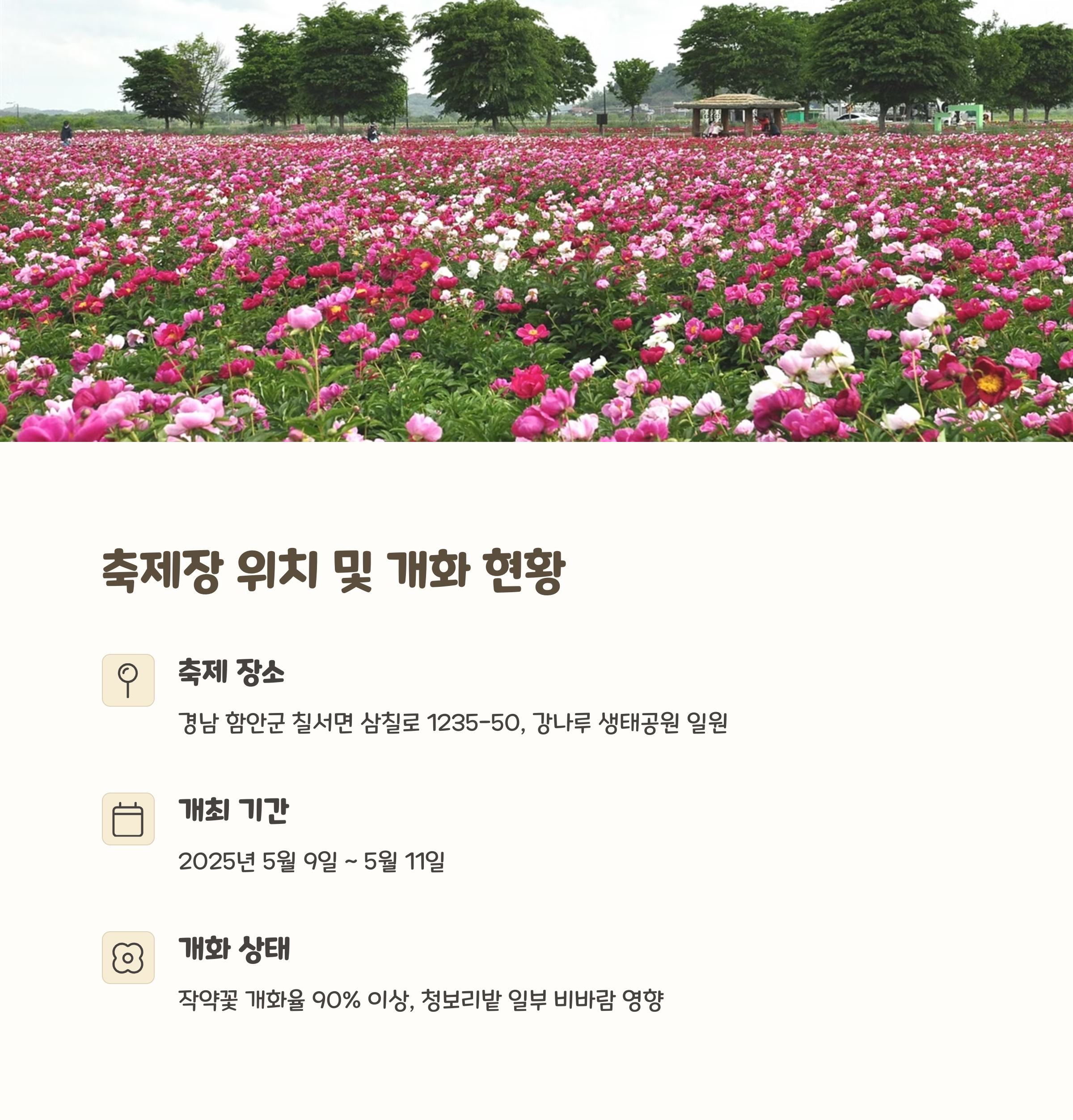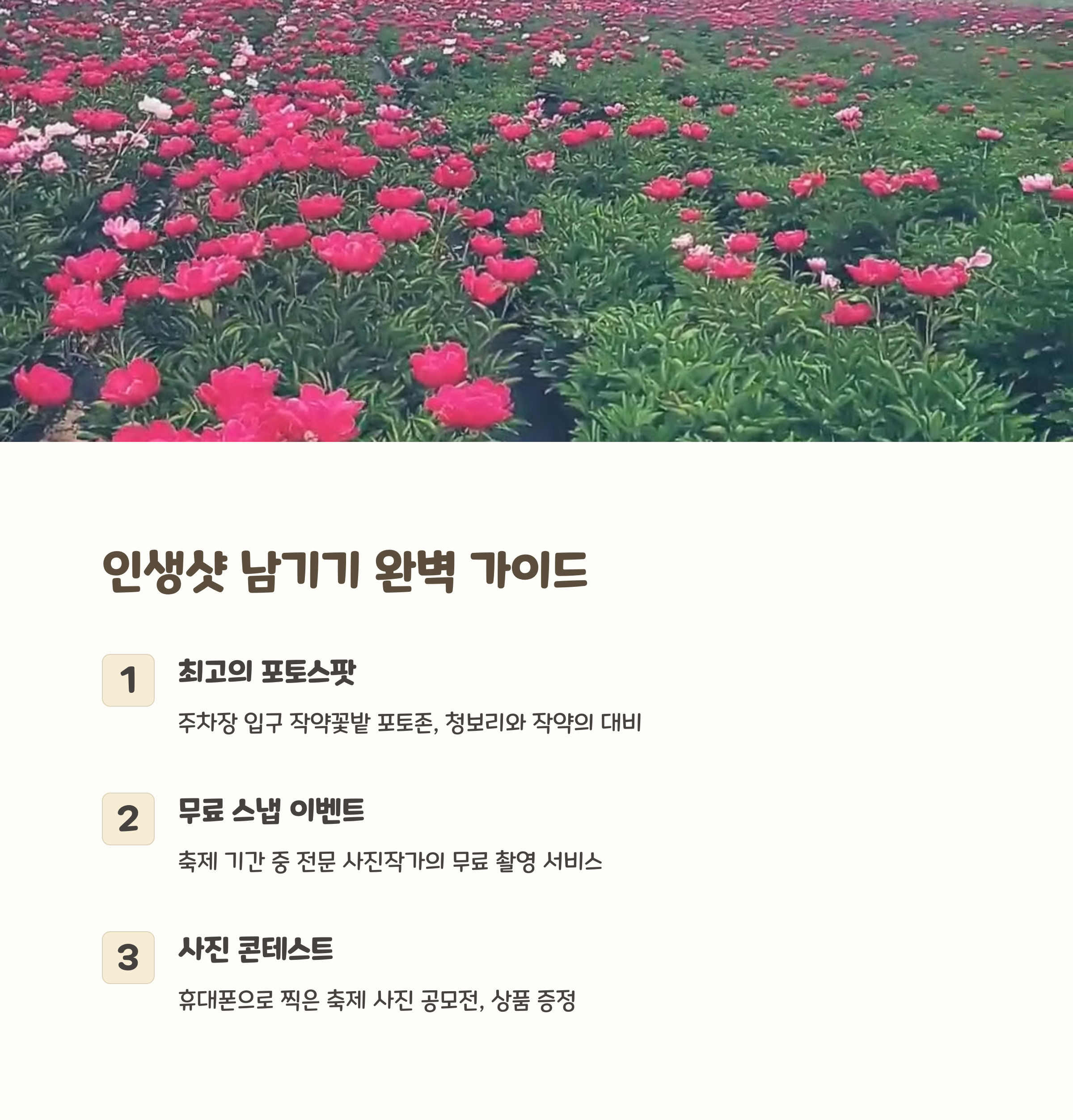 | 청보리밭 사잇길, 작약꽃밭 포토존 | 가족·커플 사진 스팟 추천 | 체험 프로그램, 플리마켓, 실시간 개화 정보 제공 |