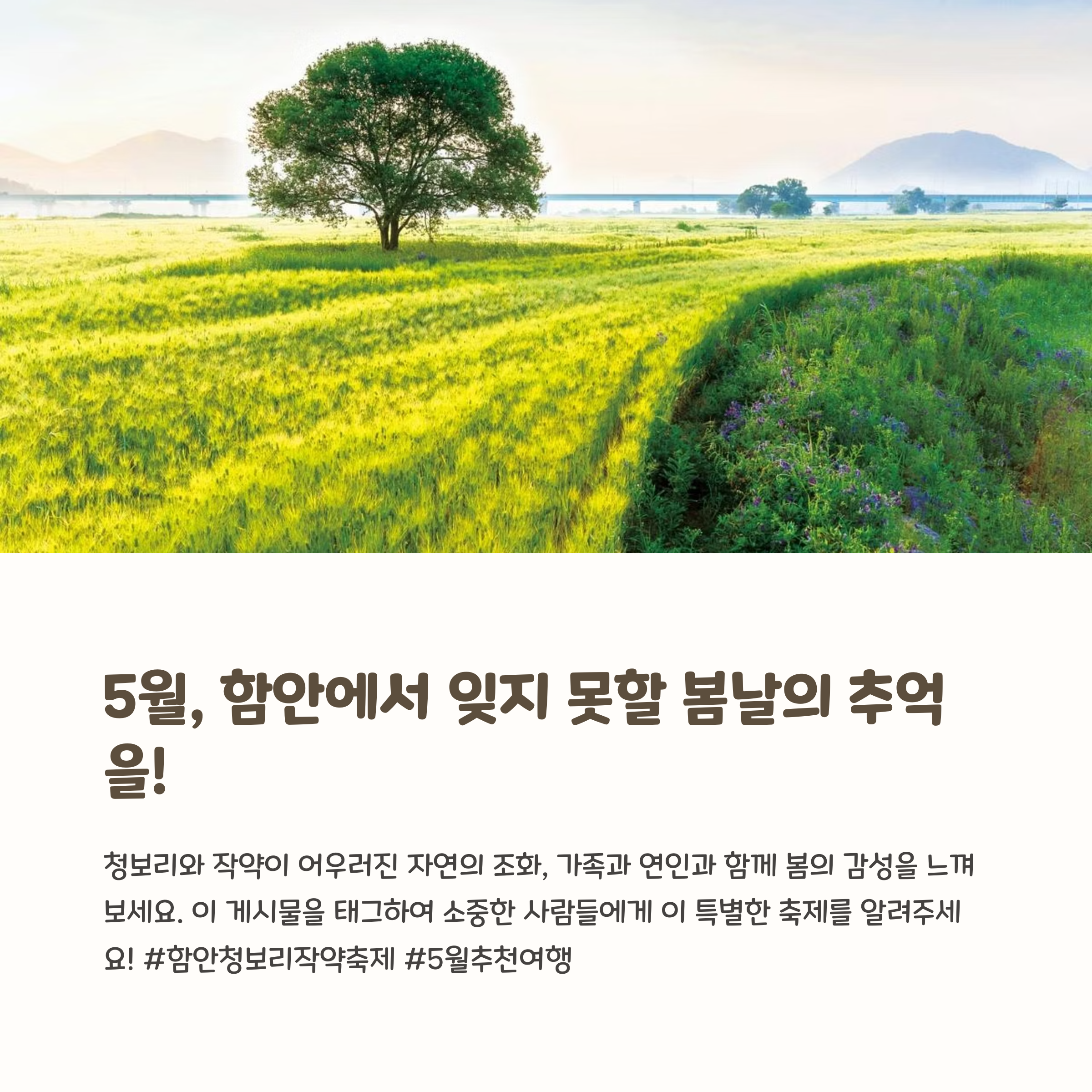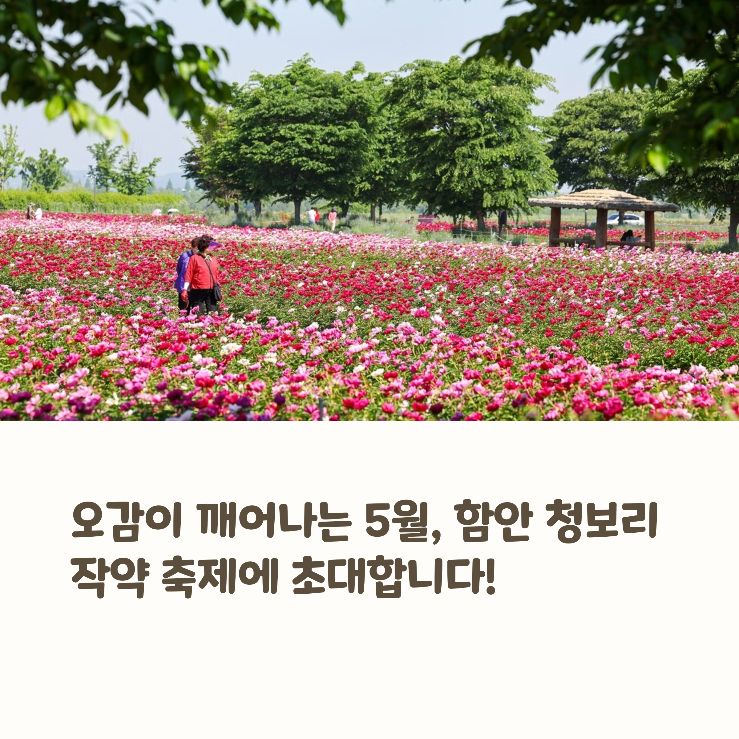 지금 이 순간만 느낄 수 있는 청보리의 푸르름과 작약의 화사함. 함안 청보리작약축제는 단순한 꽃 구경을 넘어 바람과 햇살, 향기와 여유가 함께하는 진짜 봄을 만나게 해줍니다. 주말 소풍, 드라이브 코스, 감성 촬영지로도 손색없는 이곳에서 올해 봄의 가장 특별한 하루를 경험해보세요.