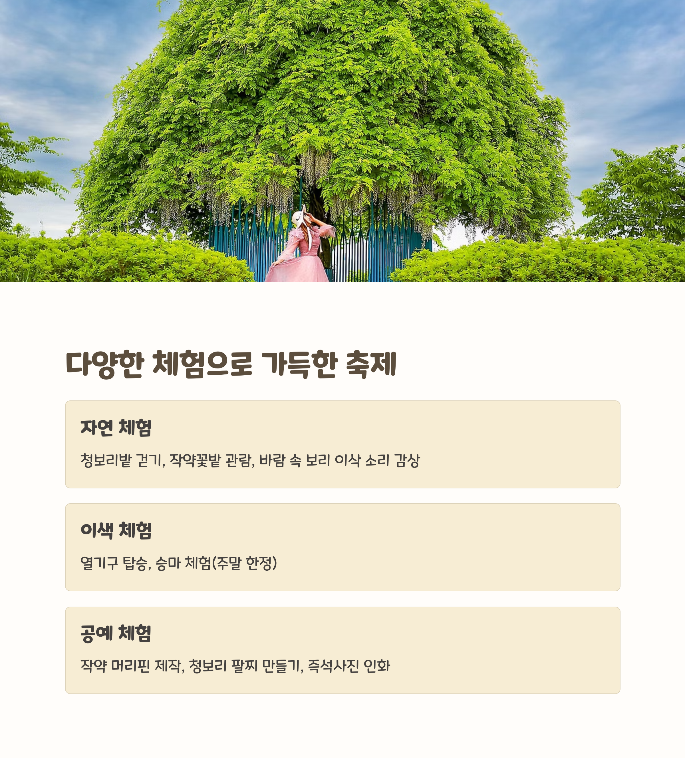 청보리밭 사잇길, 작약꽃밭 포토존 가족·커플 사진 스팟 추천 체험 프로그램, 플리마켓, 실시간 개화 정보 제공