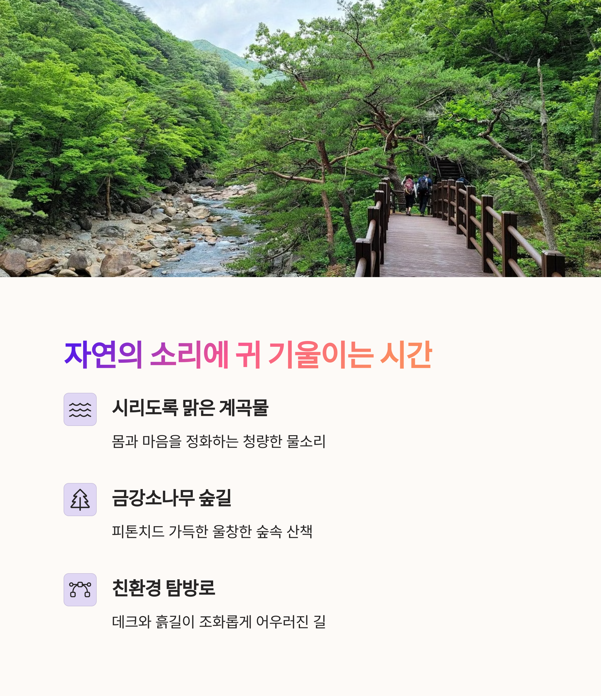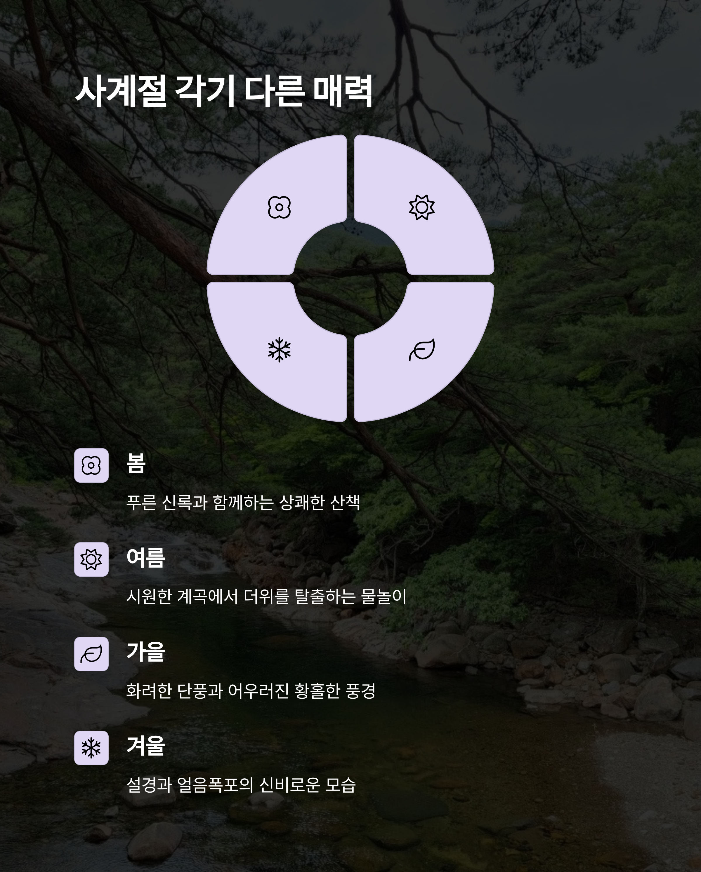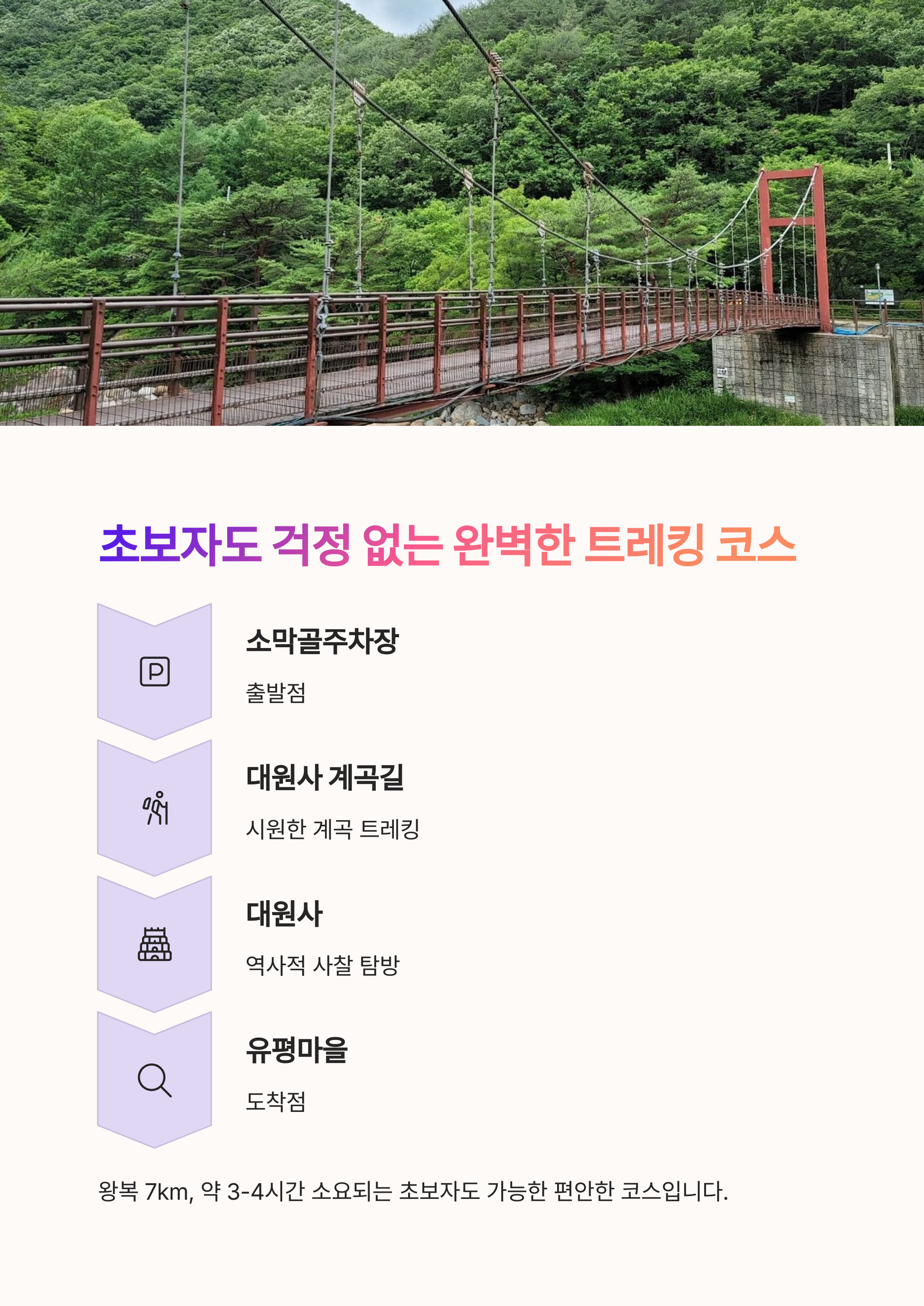 | 계곡 따라 걷는 데크+숲길 트레킹 코스 | 여름 물놀이, 가을 풍경, 대원사 탐방까지 | 왕복 7km, 초보자도 가능한 평탄한 코스 |