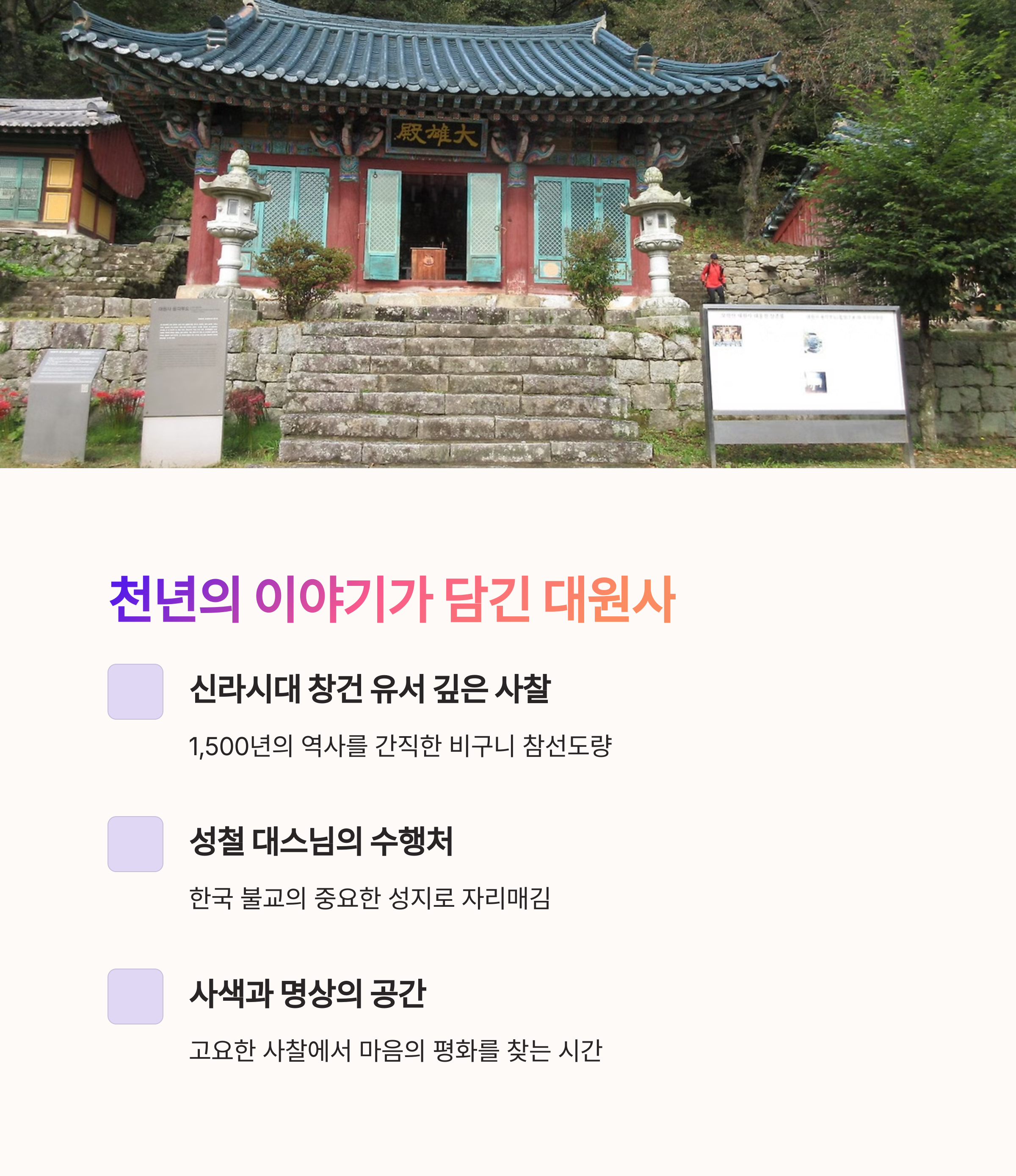 중간 지점쯤에는 신라시대에 창건된 유서 깊은 사찰, 대원사가 위치해 산책과 사찰 탐방을 함께할 수 있습니다. 대원사는 조용하고 정갈한 분위기로 자연과 사색을 즐기기에 제격이며, 주변 숲길과 조형물도 잘 정비돼 있어 사진 명소로도 손꼽힙니다.