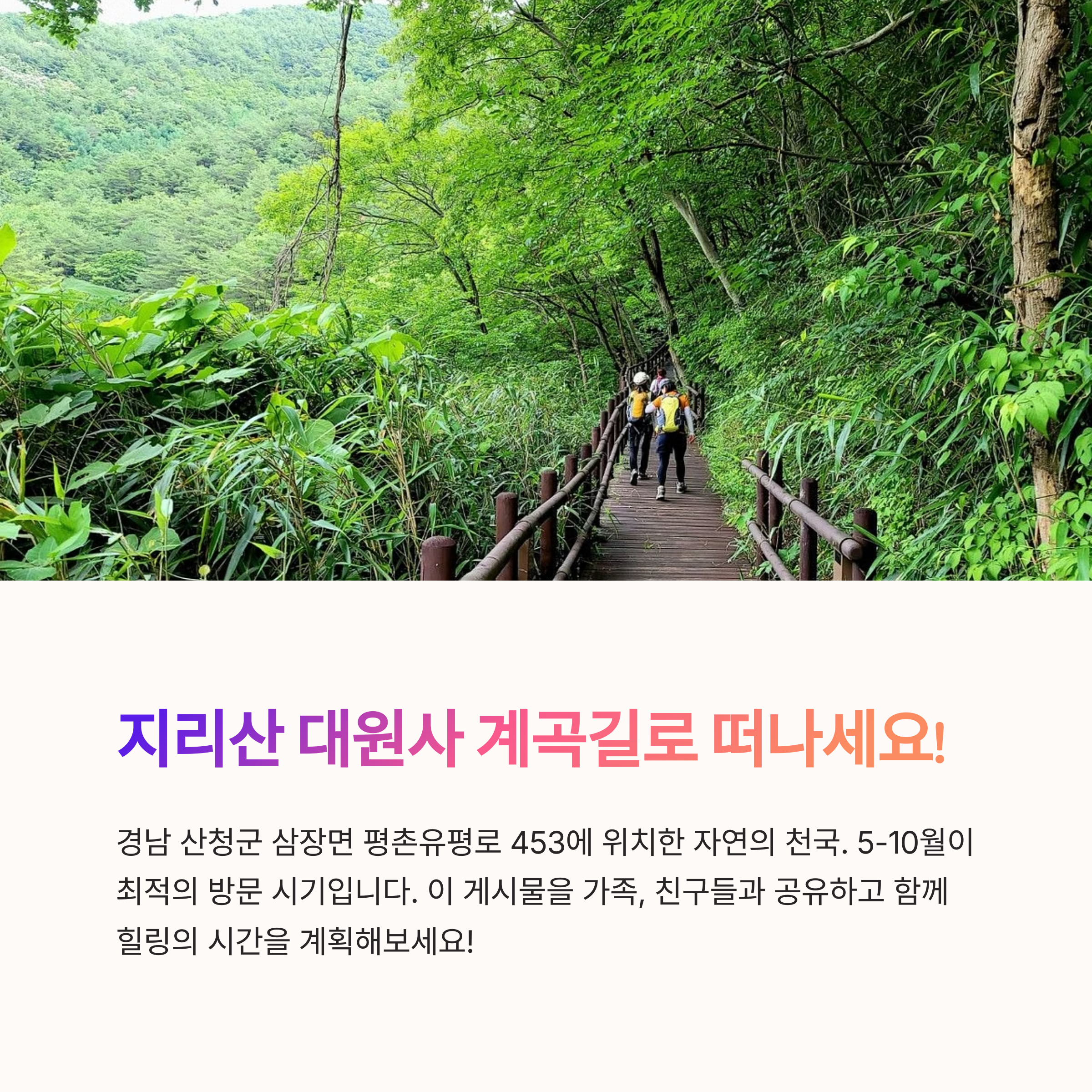 걷기 좋은 시간대, 숨겨진 쉼터, 물놀이 포인트 등 직접 걸어보신 분들의 꿀팁과 감상평을 댓글로 공유해주세요! 힐링 산청 여행을 준비하는 분들에게 큰 도움이 됩니다.