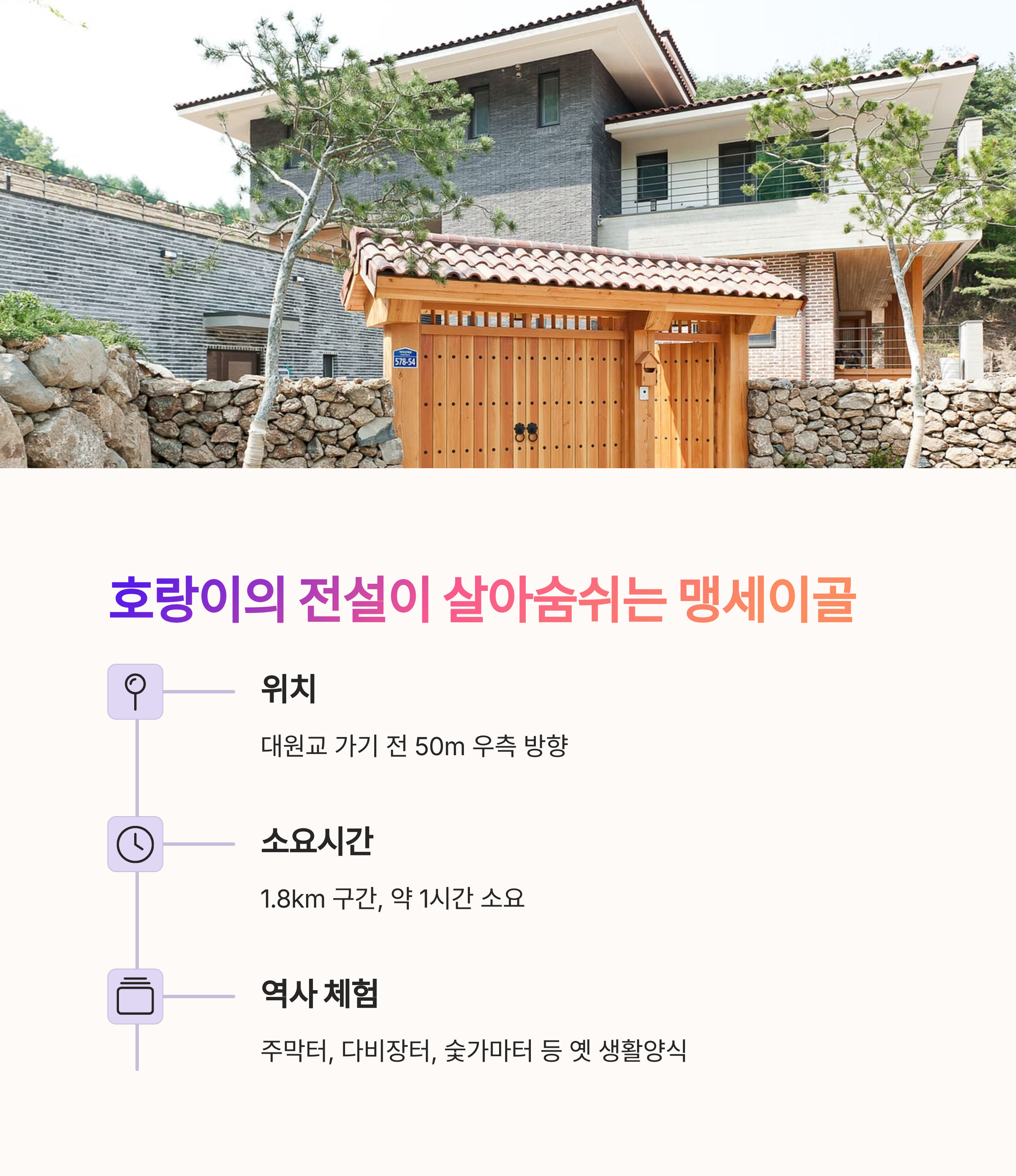 중간 지점쯤에는 신라시대에 창건된 유서 깊은 사찰, 대원사가 위치해 산책과 사찰 탐방을 함께할 수 있습니다. 대원사는 조용하고 정갈한 분위기로 자연과 사색을 즐기기에 제격이며, 주변 숲길과 조형물도 잘 정비돼 있어 사진 명소로도 손꼽힙니다.