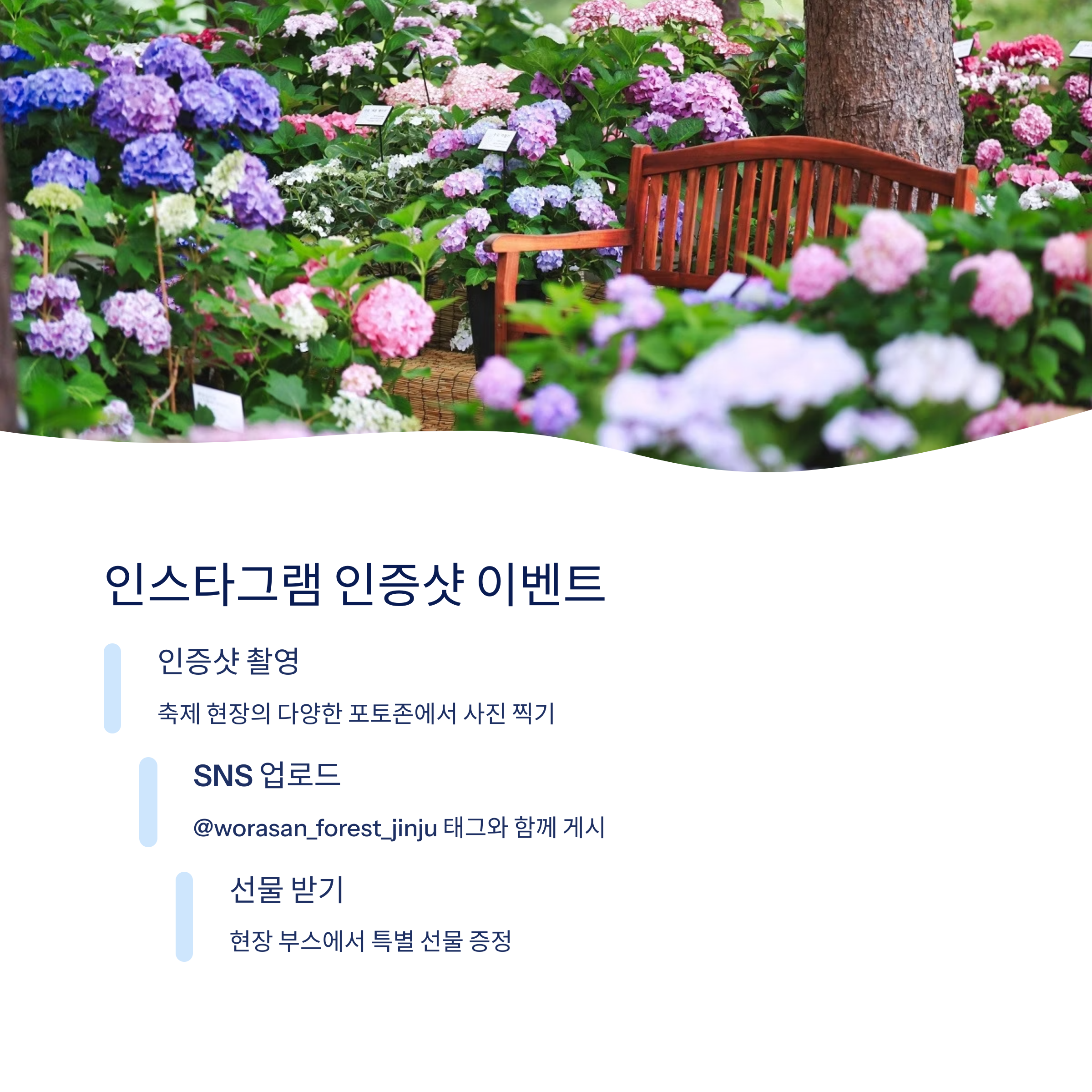 여름을 가장 아름답게 장식하는 꽃, 수국. 그 수국이 가득한 숲속 정원에서 하루를 보내고 싶다면, 진주 월아산 우드랜드 수국정원축제가 제격입니다. 입장료 부담 없이, 숲의 향기와 꽃의 색감, 그리고 지역 특산 체험까지 함께 즐길 수 있는 이번 축제는 연인·가족·친구와의 당일 나들이로 완벽한 선택이 될 것입니다.