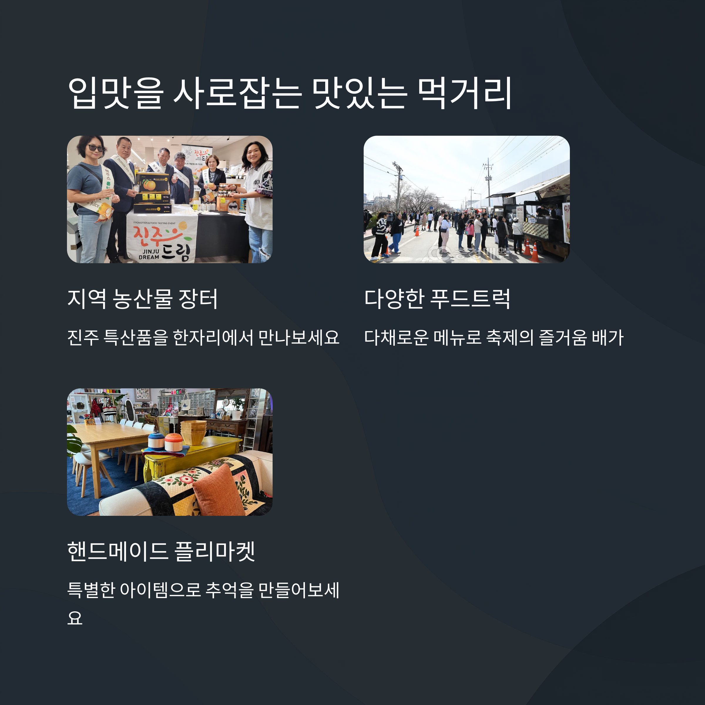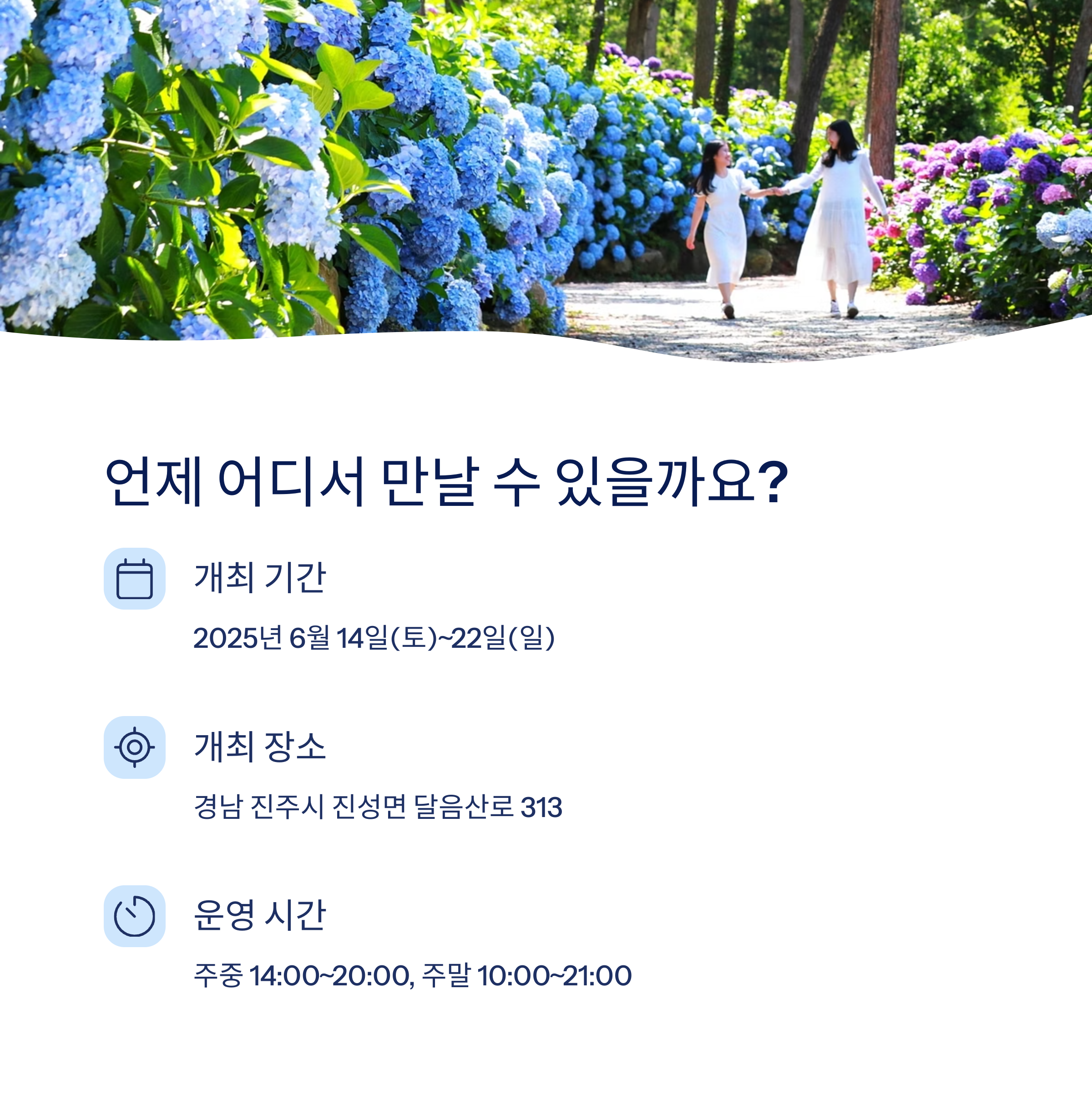운영 시간은 평일 14시~20시, 주말 10시~21시로 넉넉하게 즐길 수 있으며, 오후에는 수국 조명과 함께하는 야간 정원 산책도 가능합니다. 행사장 내 푸드트럭과 특산물 판매 부스에서는 진주의 맛과 정취를 함께 체험할 수 있어 당일치기 여행으로도 알찬 여름 일정을 보낼 수 있는 명소입니다.