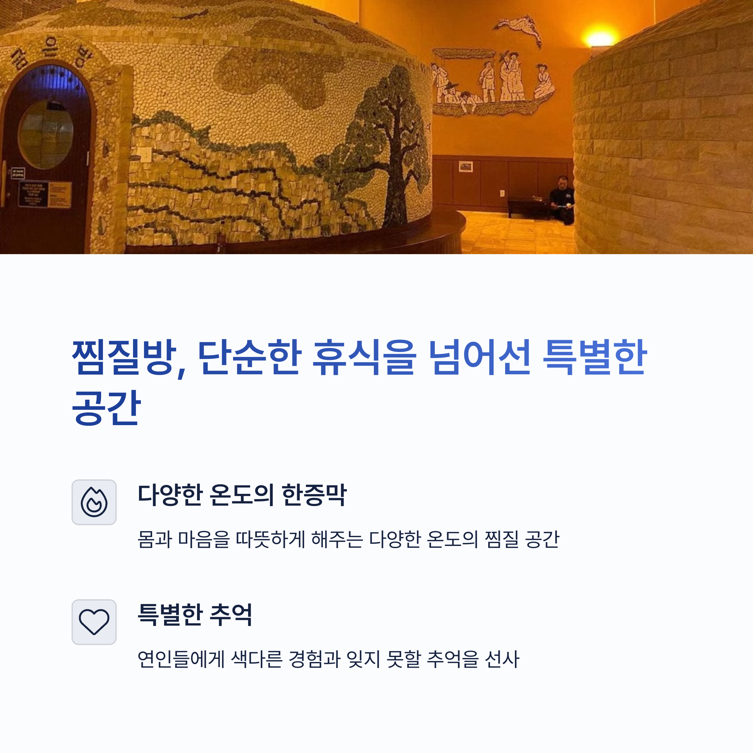 | 커플 간의 소통과 힐링에 효과적인 장소 | 깔끔한 시설과 다양한 찜질 테마 구성 | 의외의 장소에서 피어나는 감성적 하루 |