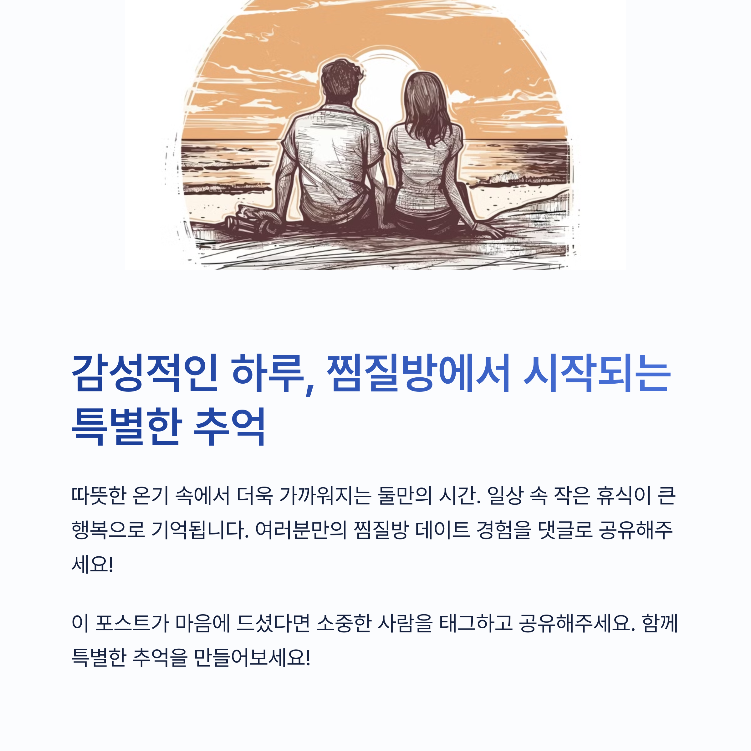 찜질방 데이트의 가장 큰 장점은 ‘공간의 따뜻함’입니다. 서로를 마주보며 대화하는 시간, 땀을 흘리며 몸도 함께 정화되는 기분, 맛있는 간식과 쉬는 시간까지. 바쁜 일상에서 잠시 벗어나 진정한 쉼을 누릴 수 있는 이 장소는 연인 사이의 정서를 더욱 깊게 만들어줍니다. 다음 데이트가 고민이라면 감성 가득한 찜질방으로 떠나보는 건 어떨까요?