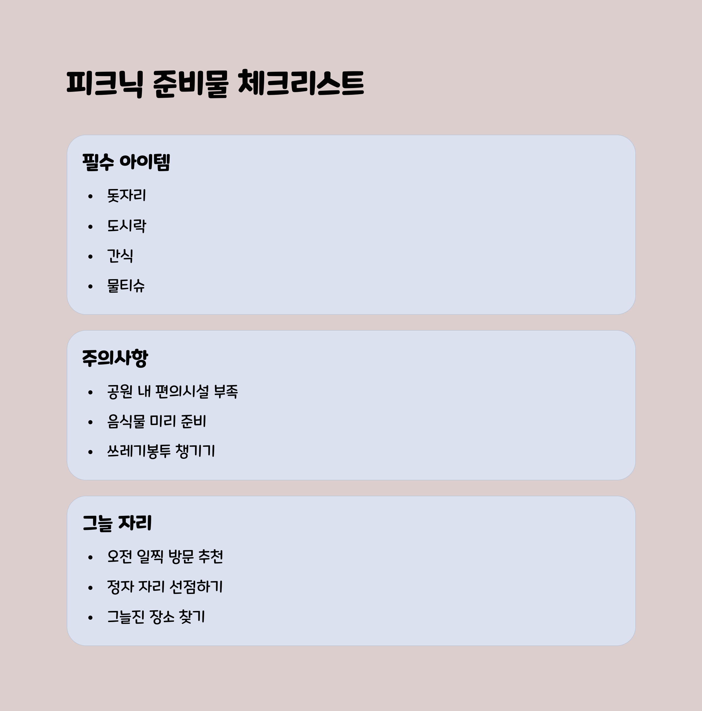 피크닉 팁 돗자리, 도시락, 생수, 간식, 물티슈는 필수 준비 품목