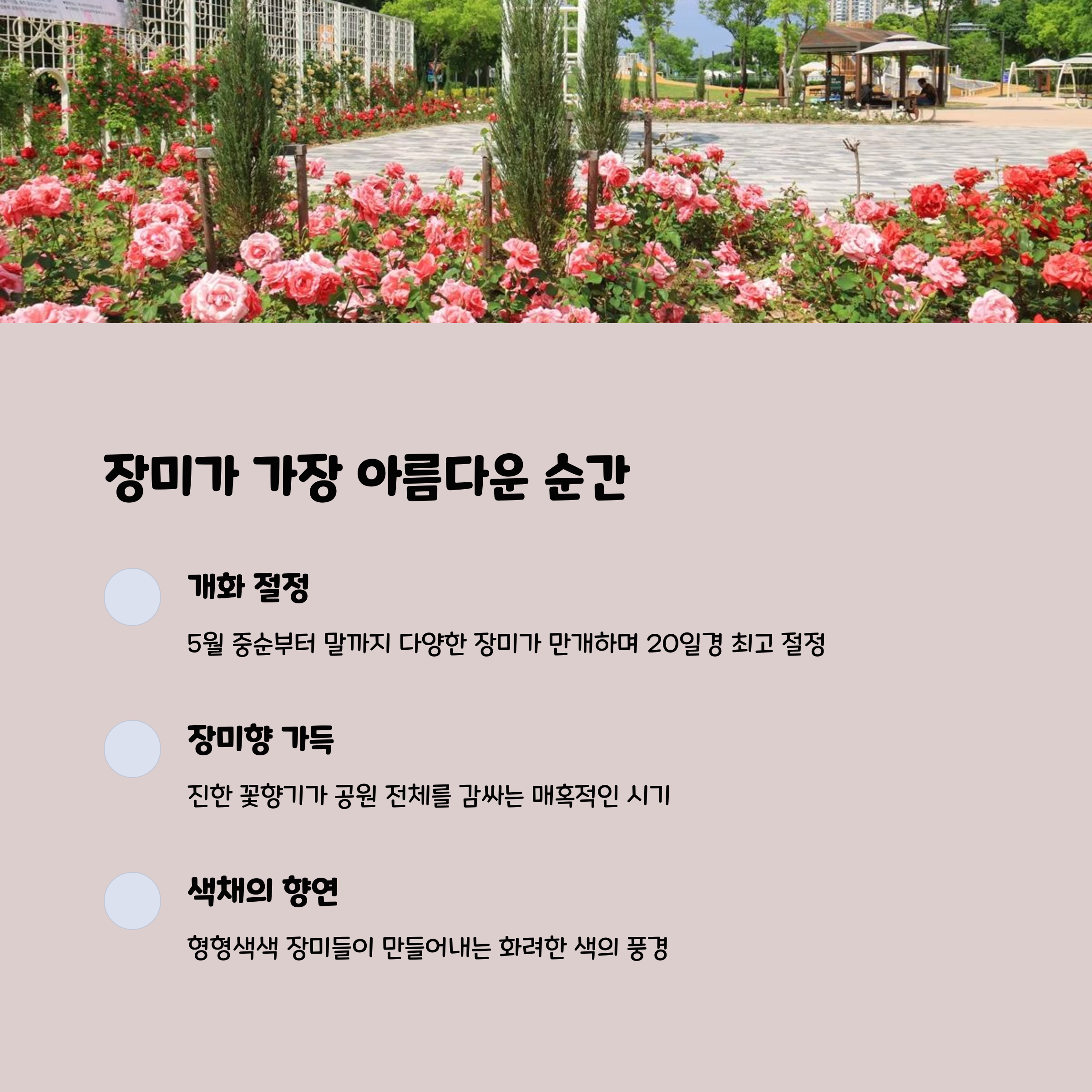 장미 절정 시기 매년 5월 중순경, 장미향과 색감이 최고조에 달함