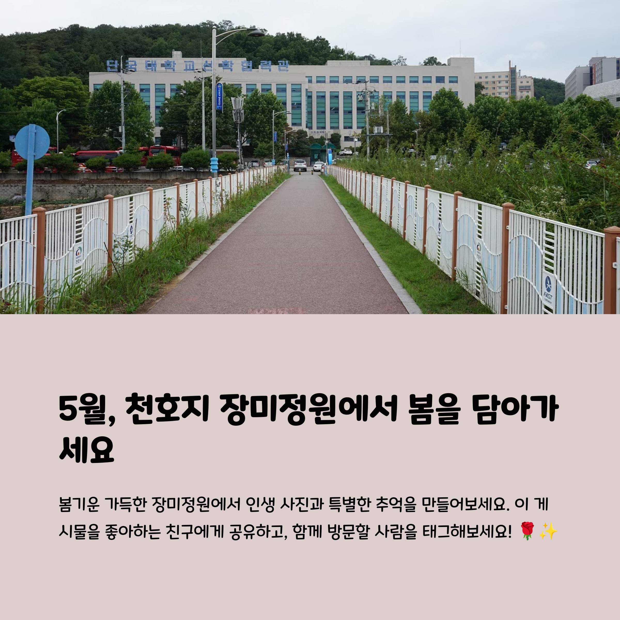 천안 단대호수공원은 봄날 피크닉과 산책을 즐기기에 가장 완벽한 장소 중 하나입니다. 장미가 절정에 이르는 5월 중순에는 감성적인 사진을 남기기 좋고, 도심 속에서 자연과 함께 여유를 누릴 수 있는 귀중한 공간입니다. 준비물만 잘 챙긴다면 돗자리를 펴고 누워 하늘을 바라보며 느긋한 하루를 보낼 수 있습니다. 주변 환경이 조용하고 깨끗하여 가족, 연인, 친구 누구와 함께여도 만족스러운 시간을 보낼 수 있으며, 장미 시즌이 끝나기 전 꼭 한 번 들러보시길 추천드립니다.