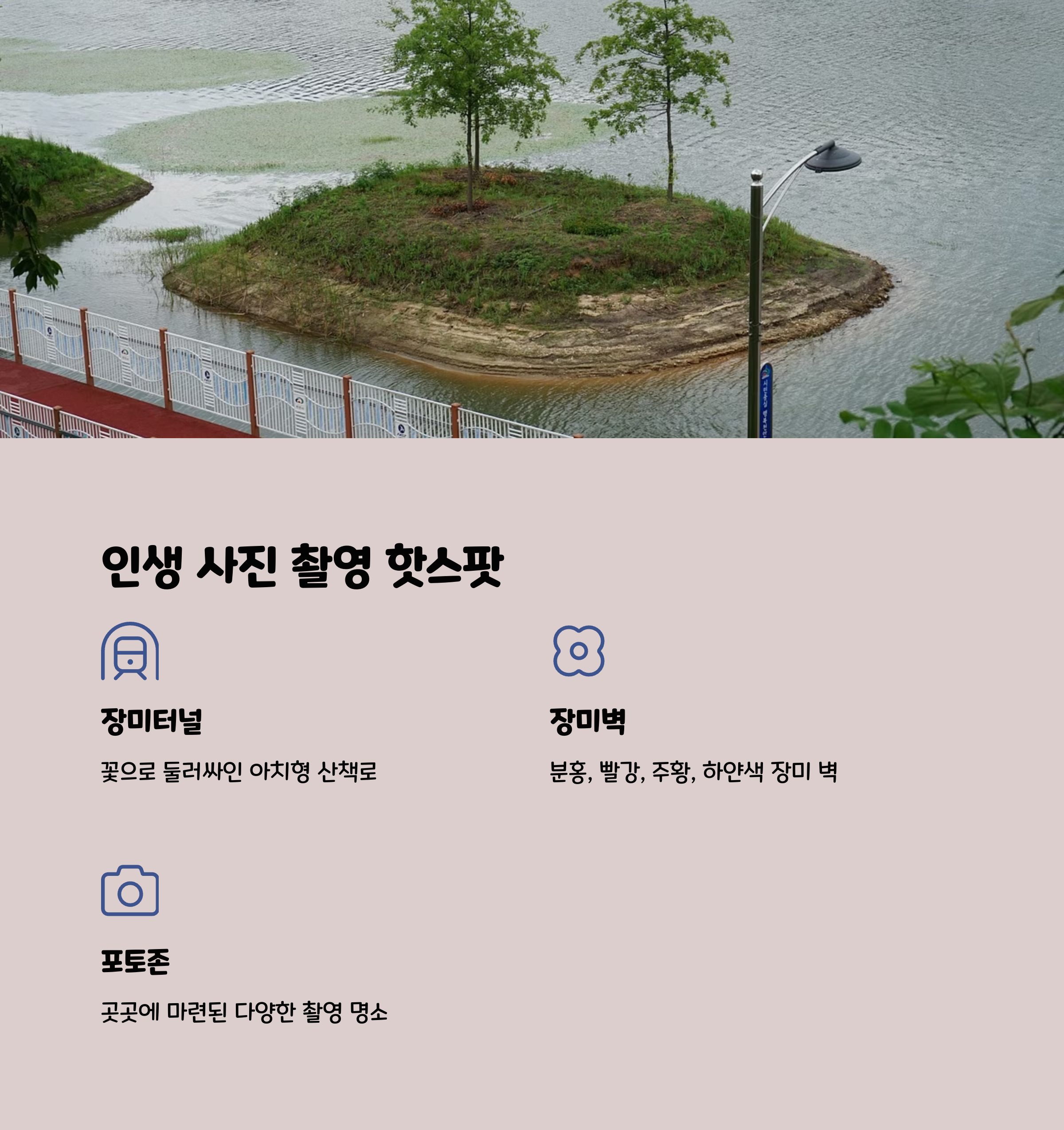 | 천호지로도 불리는 도심 속 힐링 산책지 | 장미터널, 포토존, 5월 절정의 장미향 명소 | 돗자리, 도시락, 간식, 생수, 물티슈 꼭 챙기기 |