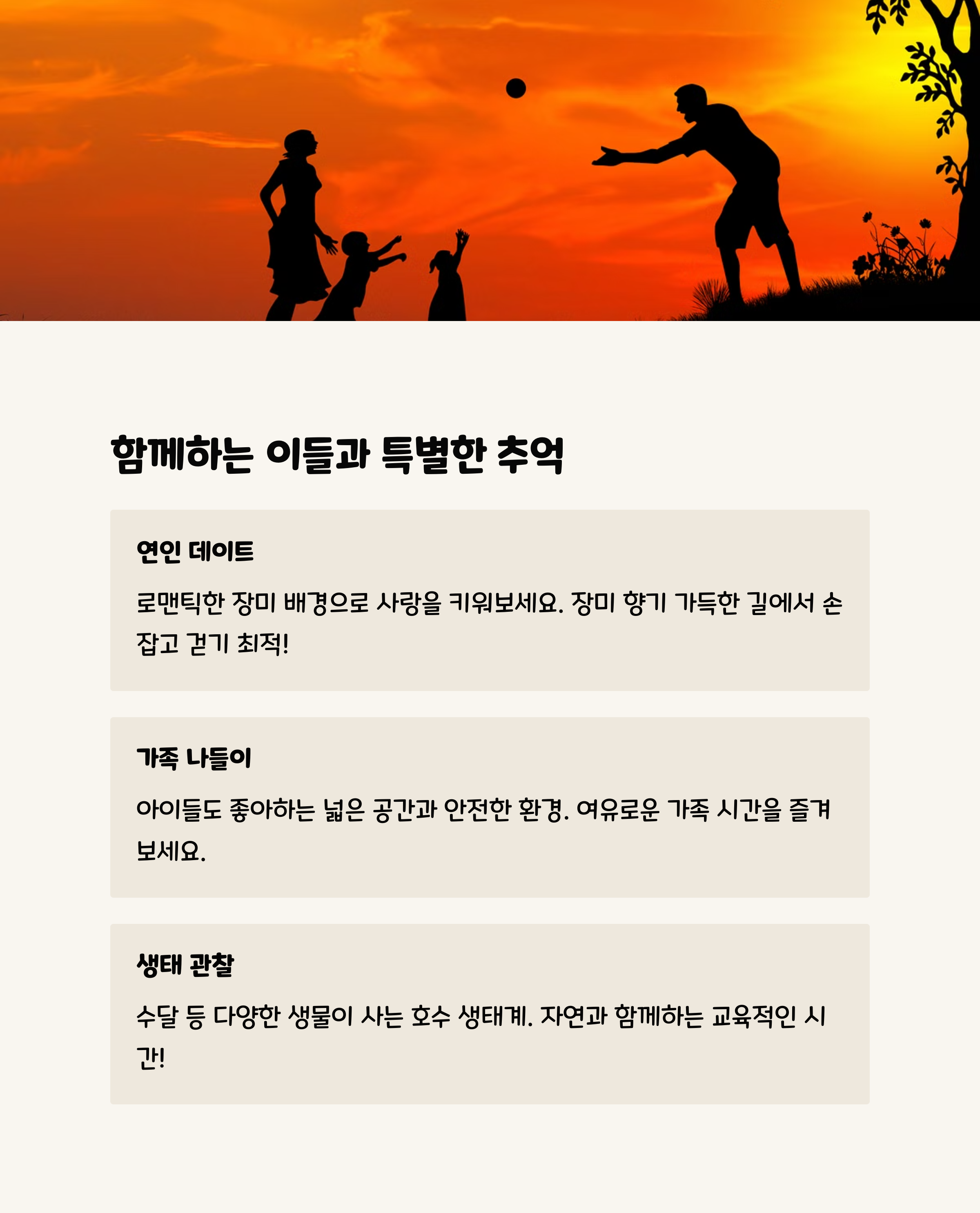 포토존 풍부, 인생사진 촬영 명소 | 호수 연결로 자연과 함께 걷기 좋은 길 | 주차 공간 가까워 가족 단위 나들이 추천 |