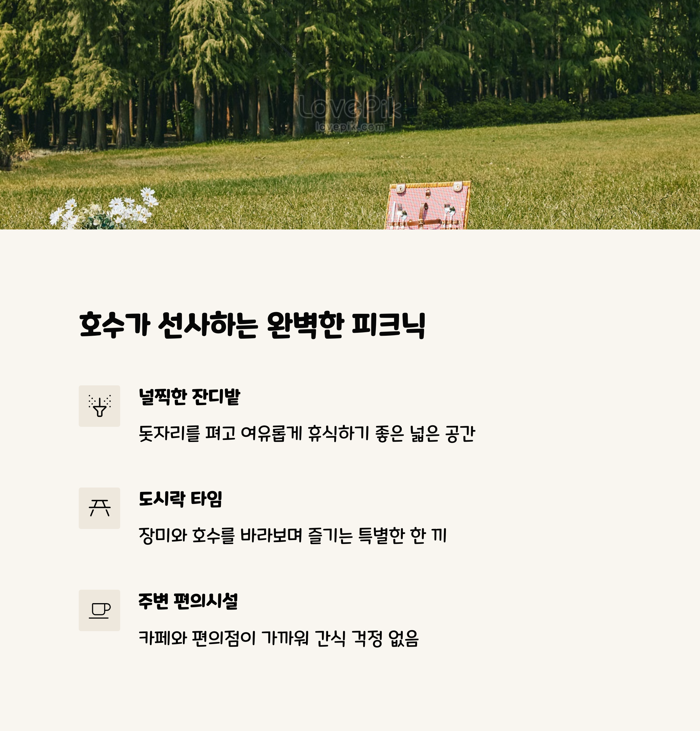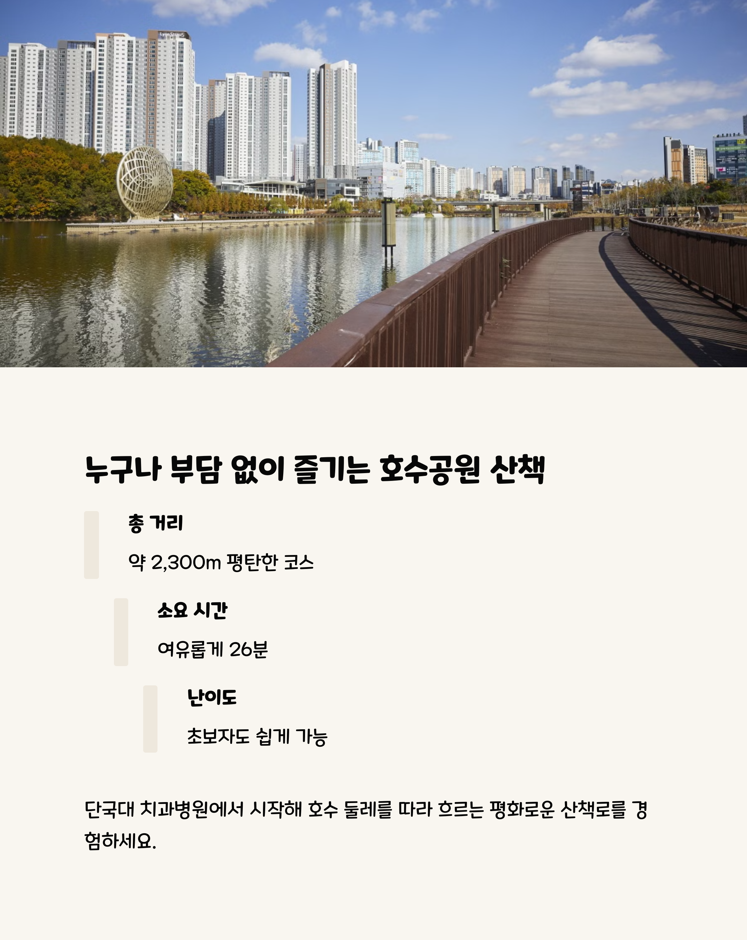 산책로 특징 | 평탄한 길과 호수 연결로 피크닉과 여유로운 걷기 가능 |