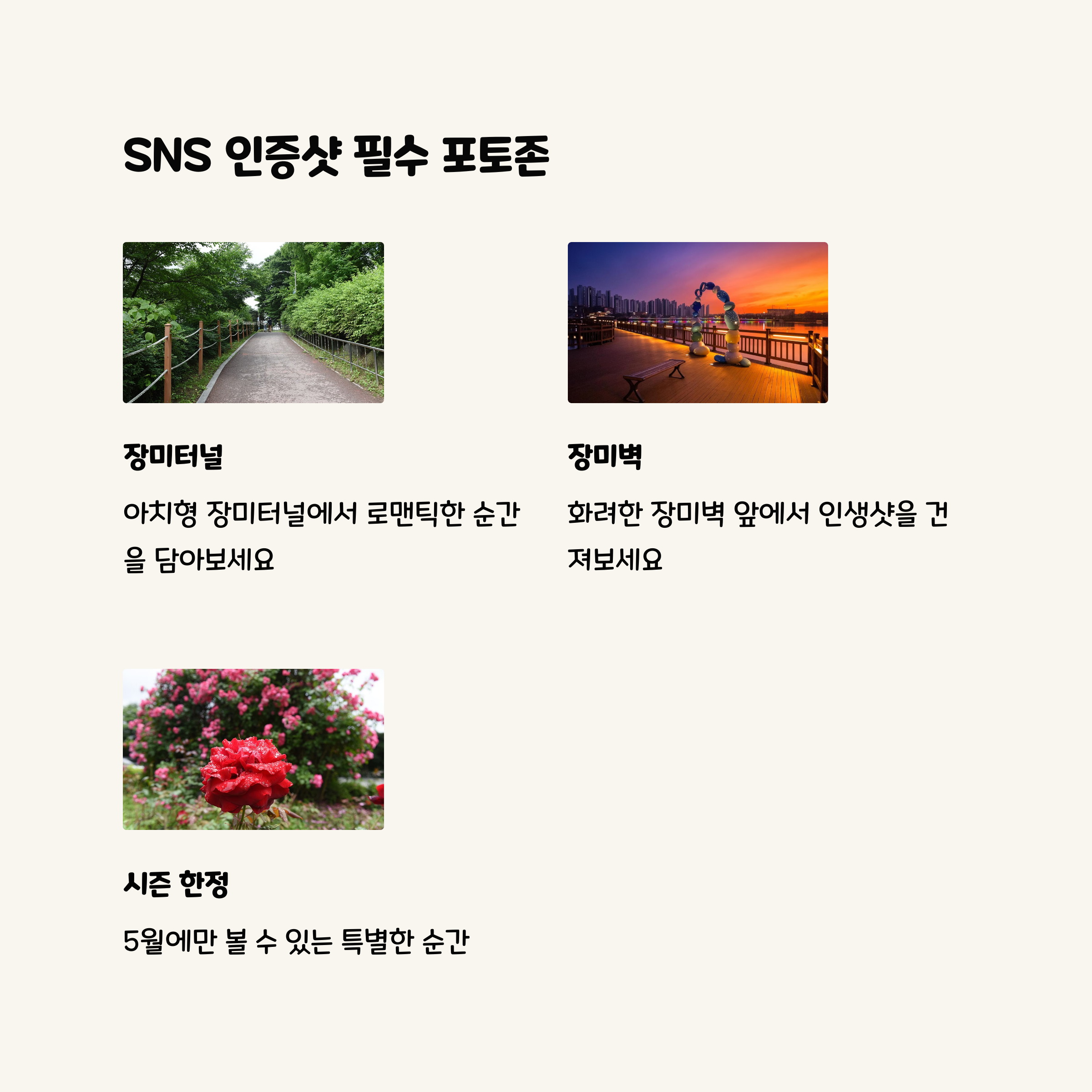5월 중순, 장미가 절정을 이루는 시기에는 다양한 품종의 장미꽃이 방문객을 맞이합니다. 장미터널, 장미 아치, 장미 벽처럼 인생사진을 남기기 좋은 포토존이 풍부해 가족, 연인 방문객 모두에게 인기입니다. 향기로운 꽃길을 따라 걷다 보면 어느새 힐링이 되는 경험을 하게 되고, SNS에 업로드할 만한 사진을 남기기에도 더없이 좋은 장소입니다. 특히 주말에는 피크닉용 돗자리를 펴고 여유롭게 시간을 보내는 시민들도 많아, 봄철 소풍지로도 손색이 없습니다.