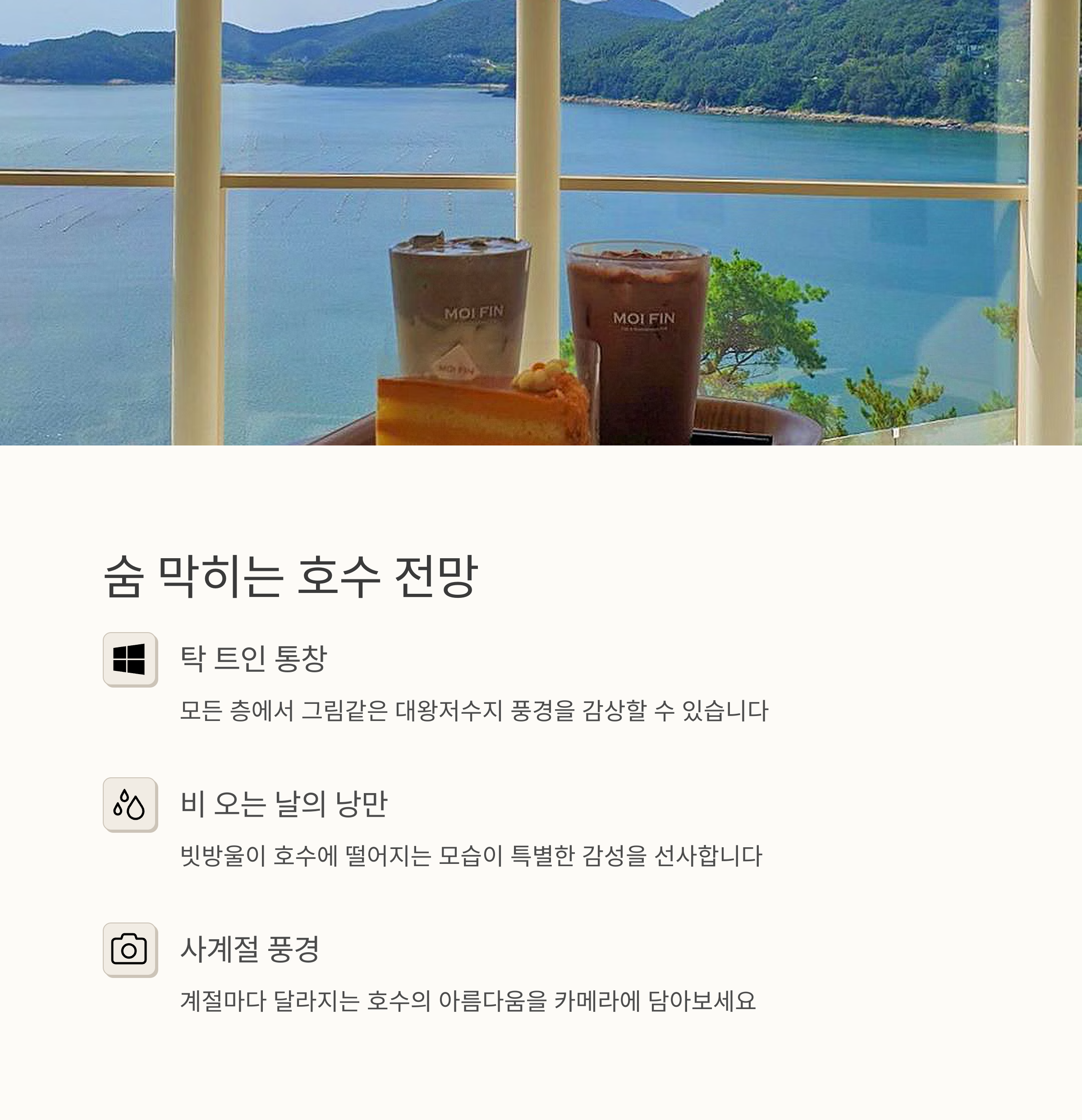 | 대왕호수 뷰 | 통창과 루프탑 전망대에서 감상하는 호수 풍경 |