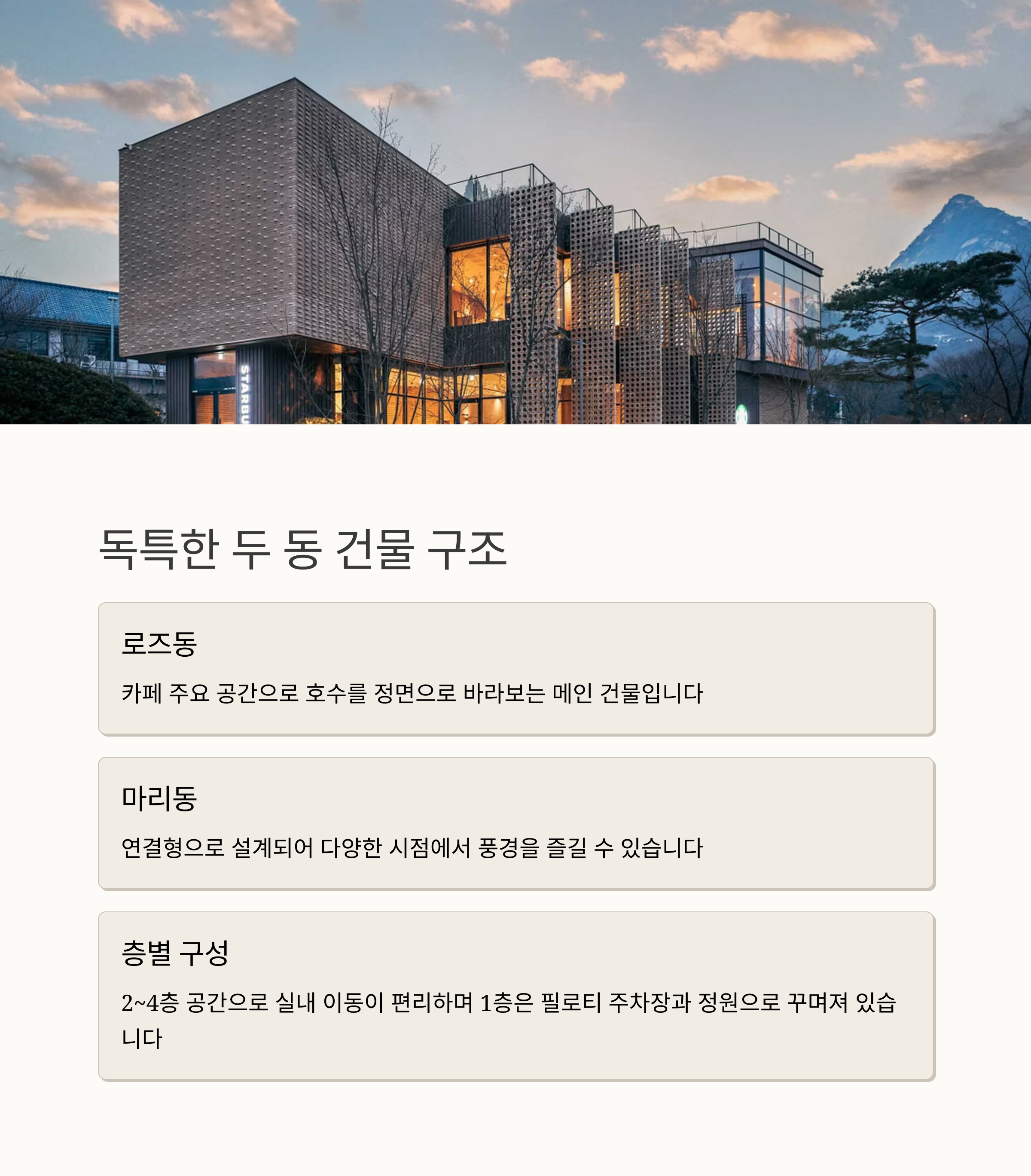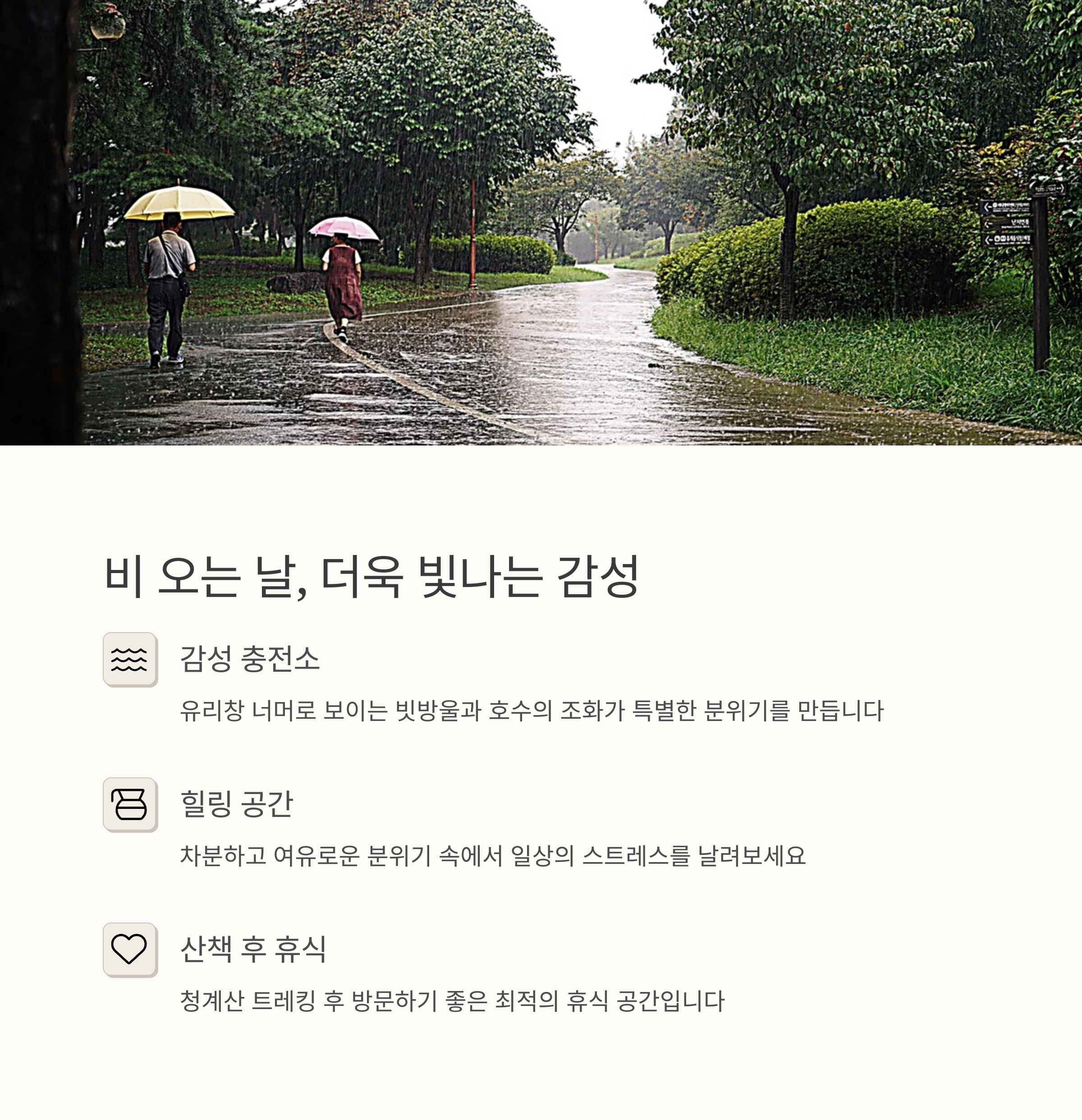 | 청계산 산책 후 들르기 좋은 감성 공간 | 대왕호수를 통창과 루프탑에서 조망 가능 | 빗소리와 호수 풍경이 어우러진 힐링 장소 |