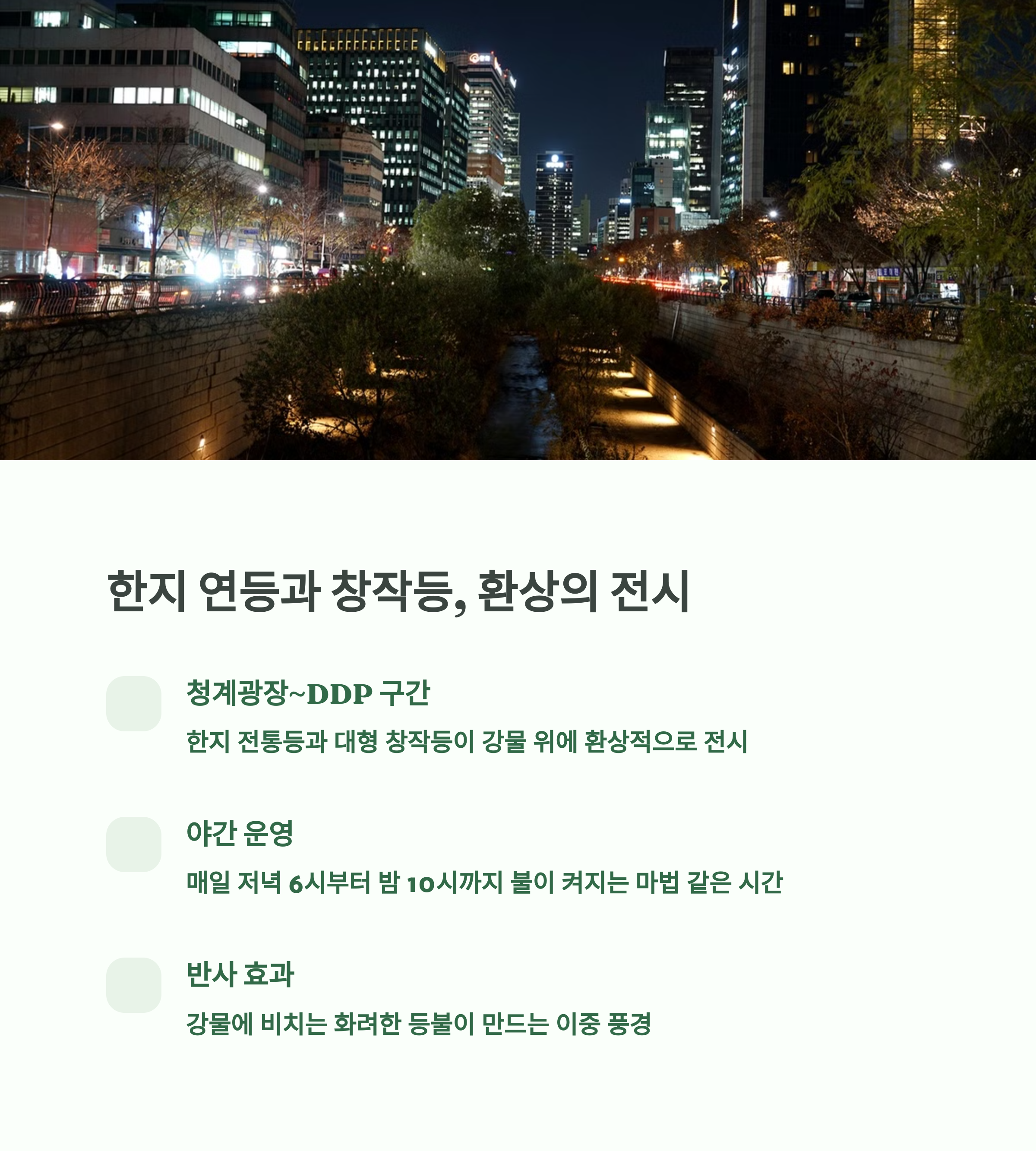 청계천 연등길은 매년 4월 중순부터 5월 중순까지 이어지는 서울의 대표 야간 산책 명소입니다. 청계광장에서 DDP까지 약 1.5km 구간에는 수백 개의 한지 전통등과 창작등이 물 위에 전시되어 도심 속에서 마치 축제처럼 빛의 향연을 펼칩니다. 저녁 6시부터 밤 10시까지 점등되며, 날이 어두워질수록 그 아름다움이 더해집니다.