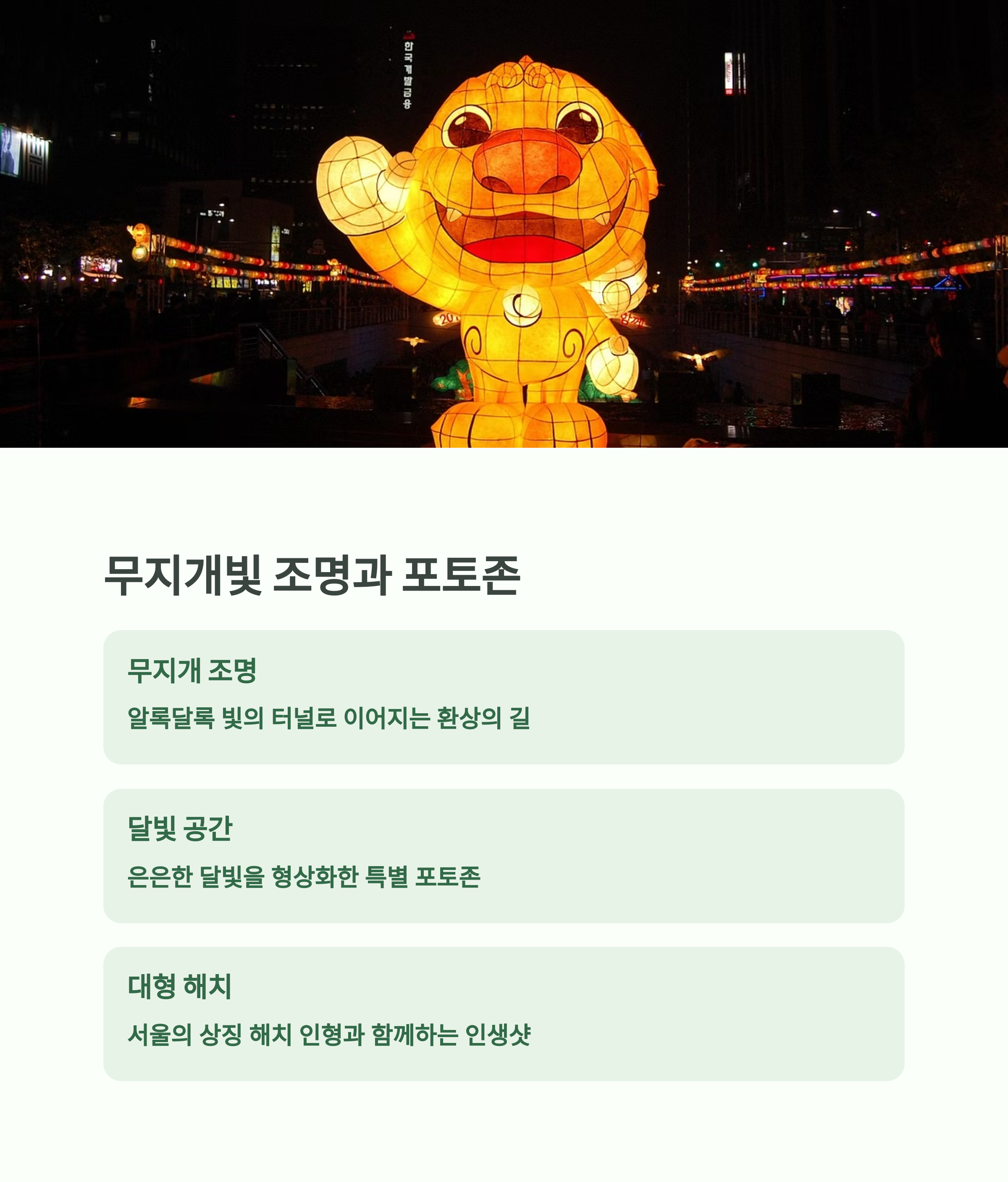 산책 중간중간에는 달빛존, 반딧불존, 무지개 조명터널과 같은 테마 조명 공간이 설치되어 있으며, 대형 해치 등·거북선 등 창작등 앞에서는 자연스럽게 인생샷을 남길 수 있습니다. 연등이 비치는 물빛과 서울 야경이 어우러져 몽환적인 분위기를 만들어주는 것도 큰 매력입니다.