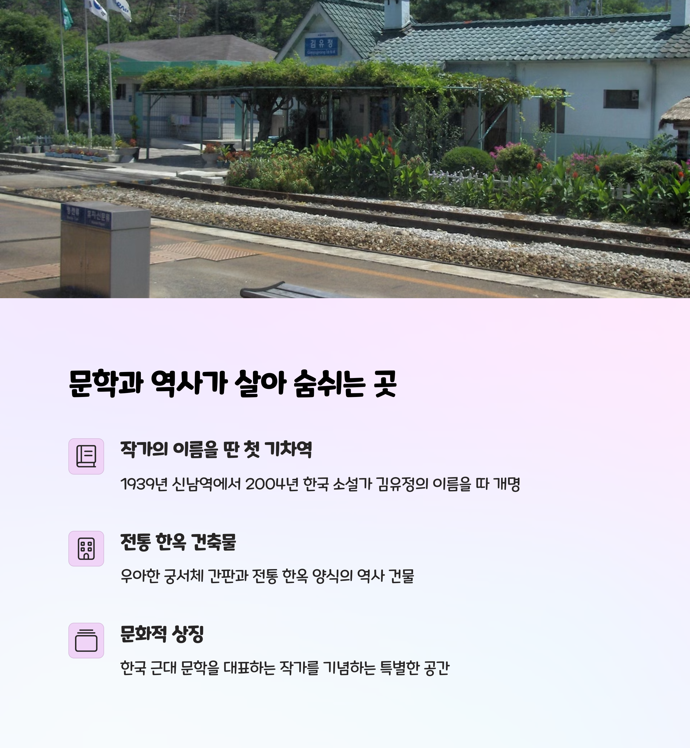 김유정역은 우리나라 대표 소설가 김유정 선생의 이름을 딴 역사로, 외관은 전통 한옥 양식으로 지어져 작은 문학관 같은 분위기를 풍깁니다. 역 앞 광장에는 김유정 동상이 있고, 내부에는 작품 소개와 전시 공간도 마련되어 있어 문학과 여행이 만나는 특별한 장소예요. 바로 옆에는 경춘선 폐역이 아기자기하게 복원되어 기차 내부, 역간판, 시간표 등 옛 감성을 그대로 담은 무료 포토존도 즐길 수 있습니다.