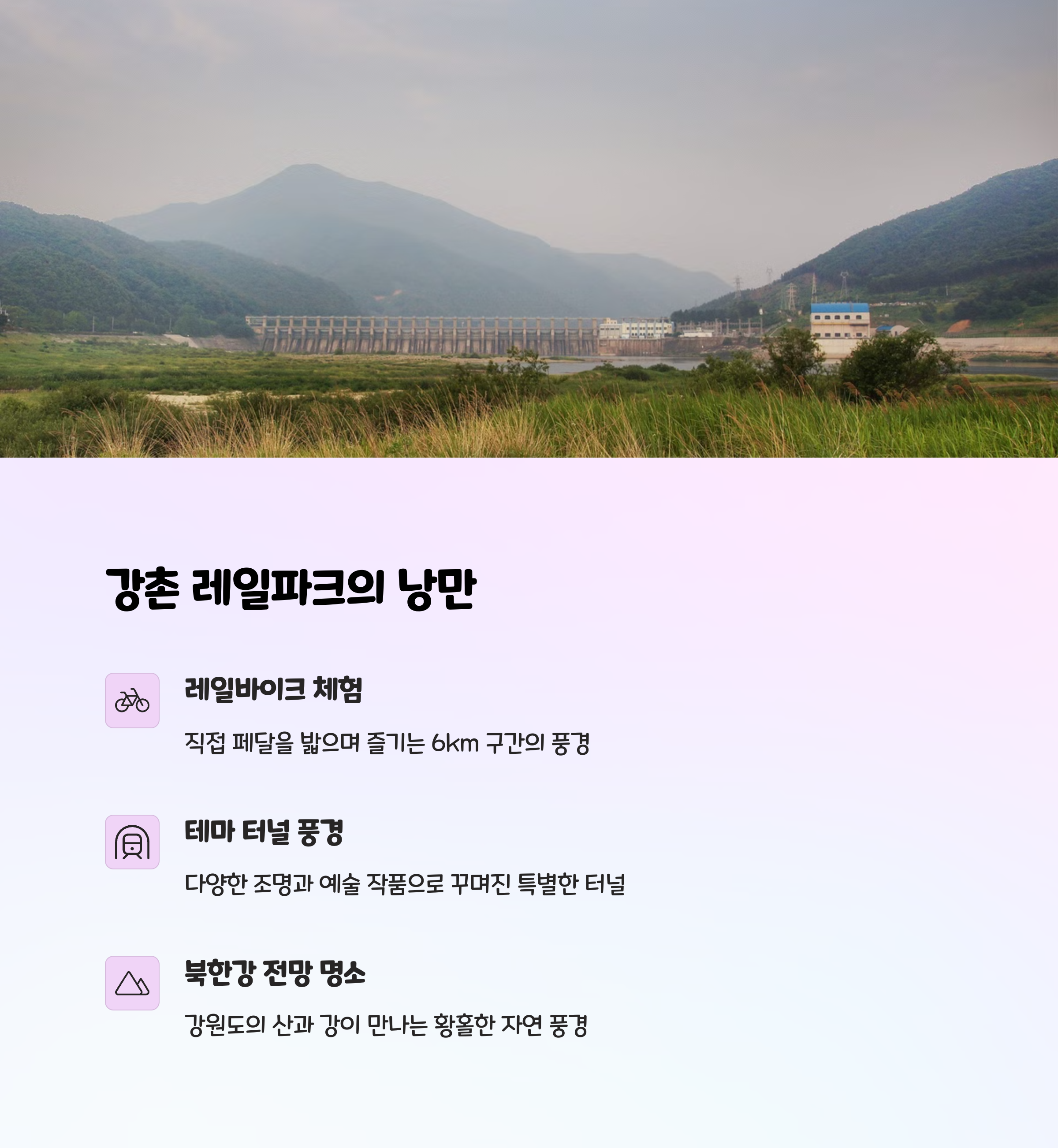 기차를 타고 떠나는 여행도 이곳의 큰 매력입니다. 김유정역에서 남춘천역, 강촌역, 백양리역까지 이어지는 구간은 산과 강을 따라 이어지는 풍경이 아름다워 창밖을 보는 재미가 쏠쏠해요. 특히 ITX-청춘 열차를 타면 서울~춘천 구간도 빠르고 쾌적하게 이동 가능하며, 시간만 잘 맞추면 기차 타고 레일바이크, 강변 산책까지 한 번에 즐길 수 있는 코스가 완성됩니다.