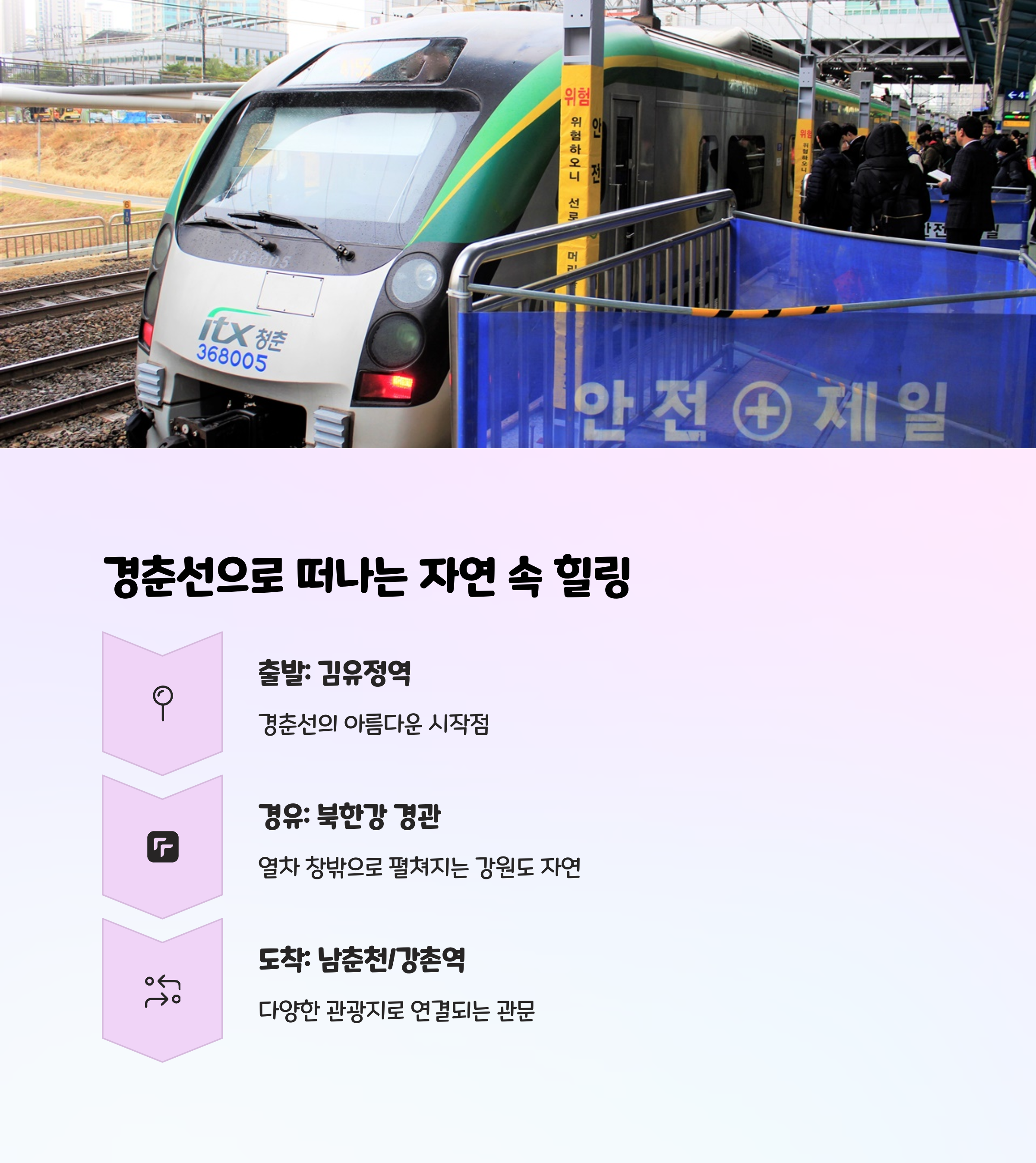 쾌적함과 빠른 이동을 원하신다면 ITX 청춘을 추천합니다. 비용을 아끼고 여유 있게 창밖 풍경을 즐기고 싶다면 일반 경춘선도 좋아요. 목적지와 시간에 따라 선택해 보세요!