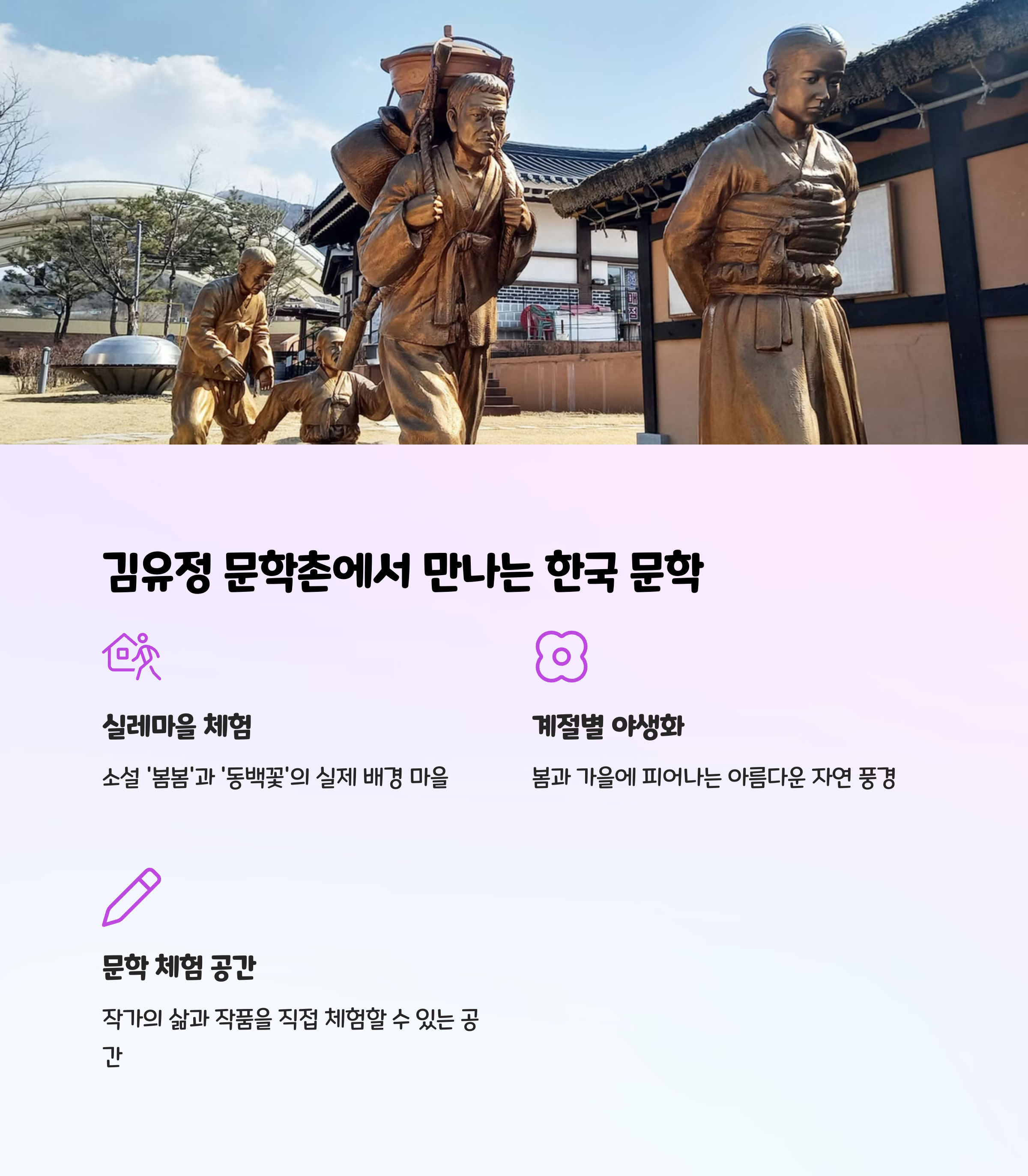 위치 및 접근 경춘선 김유정역 (ITX 청춘/일반 열차 모두 정차), 서울에서 약 1시간 거리