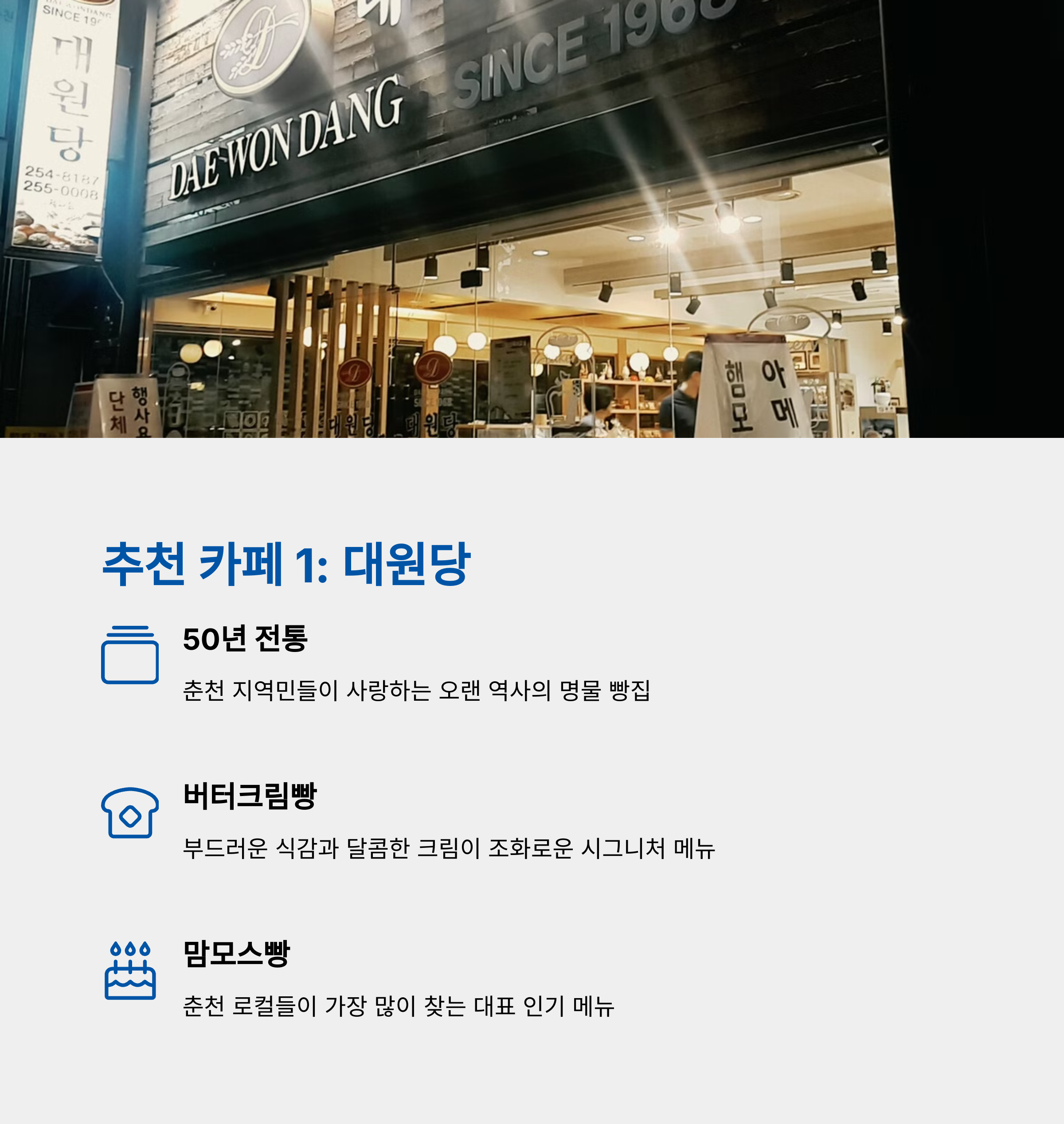 드라이브 코스 중간에 들르면 좋은 첫 번째 베이커리는 대원당. 춘천의 전통 빵집으로 버터크림빵과 맘모스빵이 특히 유명해요. 오랜 시간 사랑받아온 만큼 현지인들도 자주 찾는 곳입니다. 두 번째 추천은 자유빵집. 겉은 바삭하고 속은 촉촉한 프레첼 앙버터는 드라이브 간식으로도 최고랍니다.