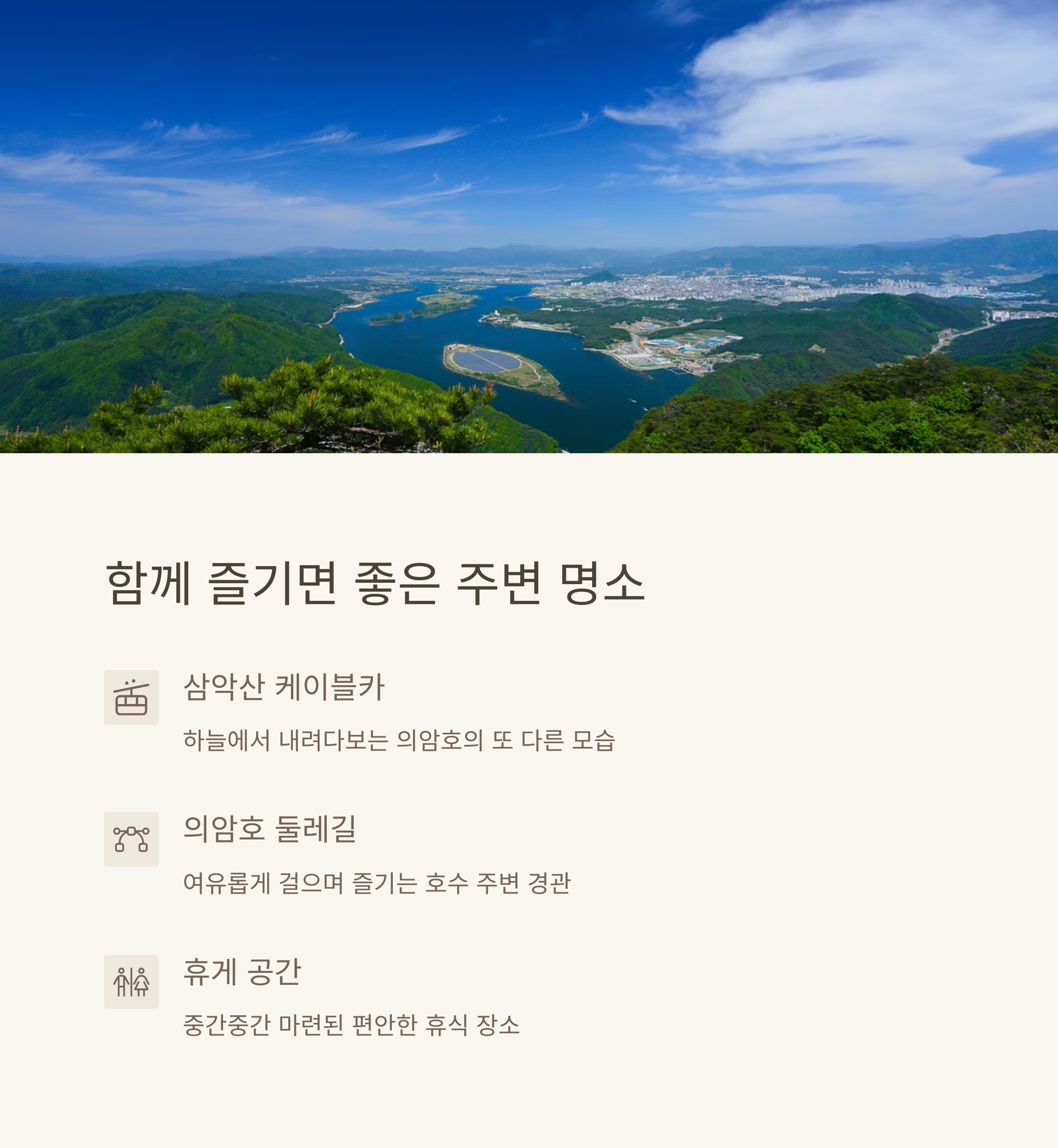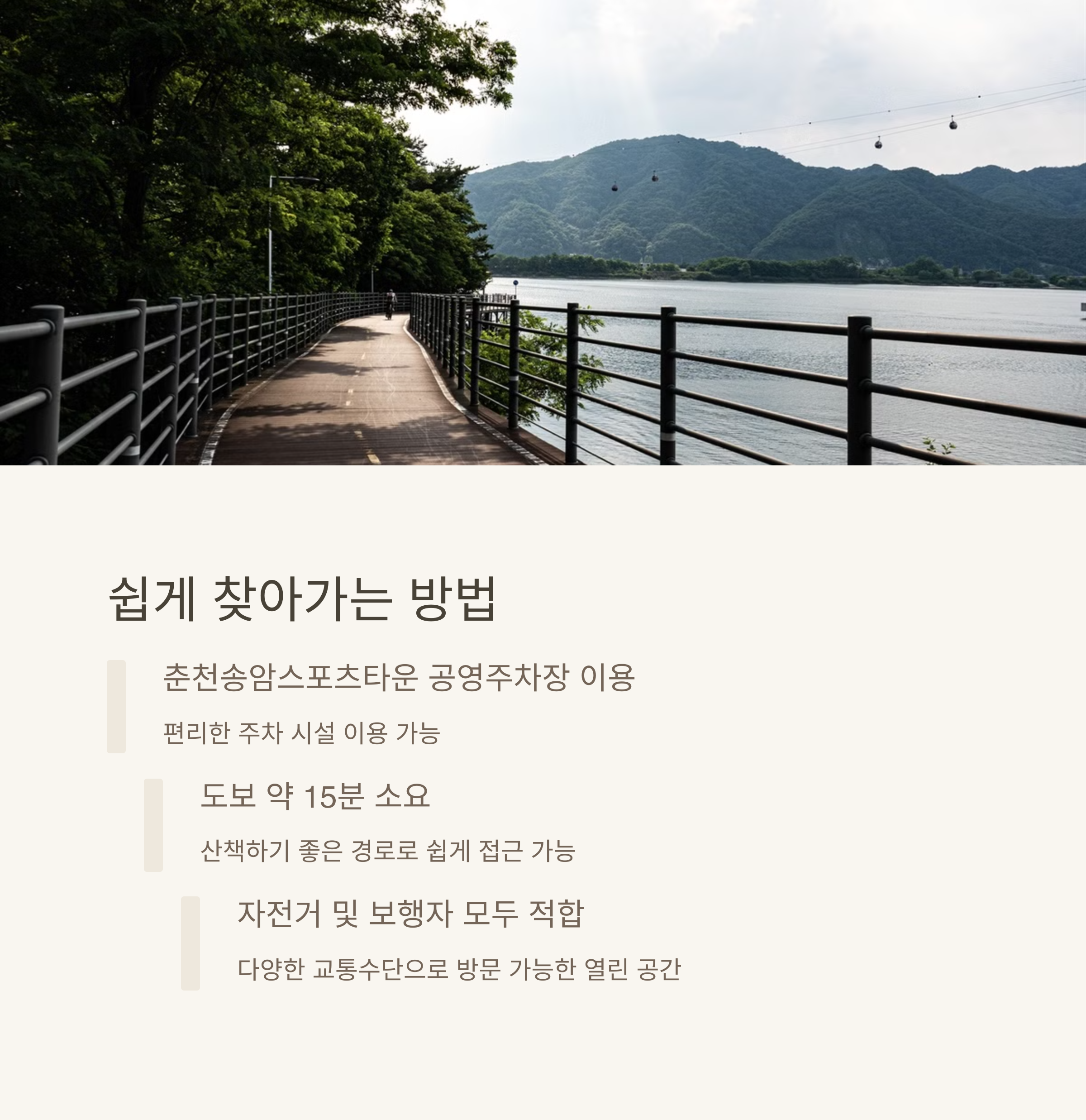 산책로는 의암호 둘레길과 연결되어 있어 삼악산 케이블카를 탑승한 후에도 쉽게 접근할 수 있습니다. 춘천송암스포츠타운 주차장에 차량을 세우고 도보로 약 15분 이동하면 도착할 수 있으며, 그 여정 또한 한적한 풍경 속에서 여유를 즐기기에 충분합니다. 무엇보다 보행자뿐 아니라 자전거 이용객까지 배려한 도로 설계가 돋보입니다.